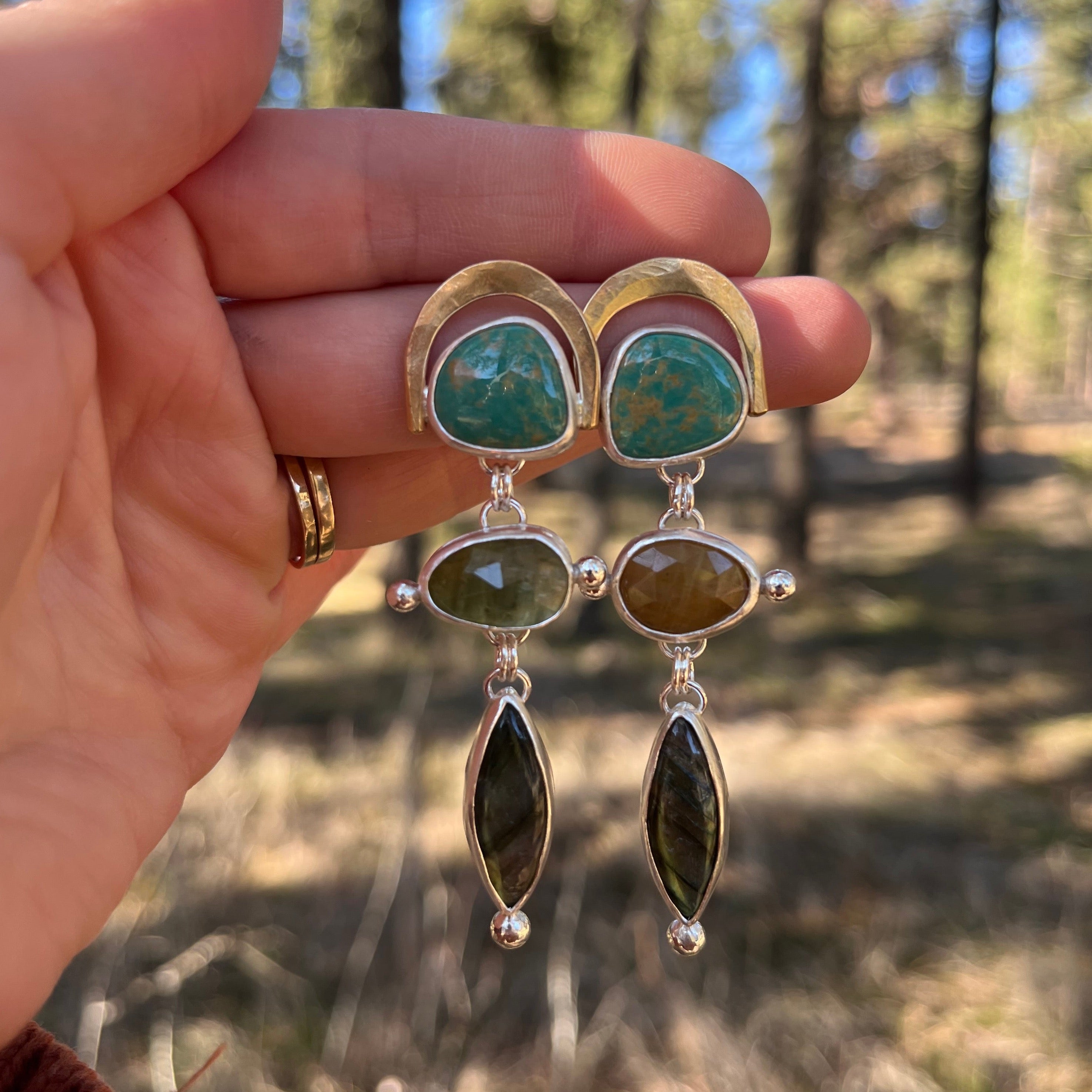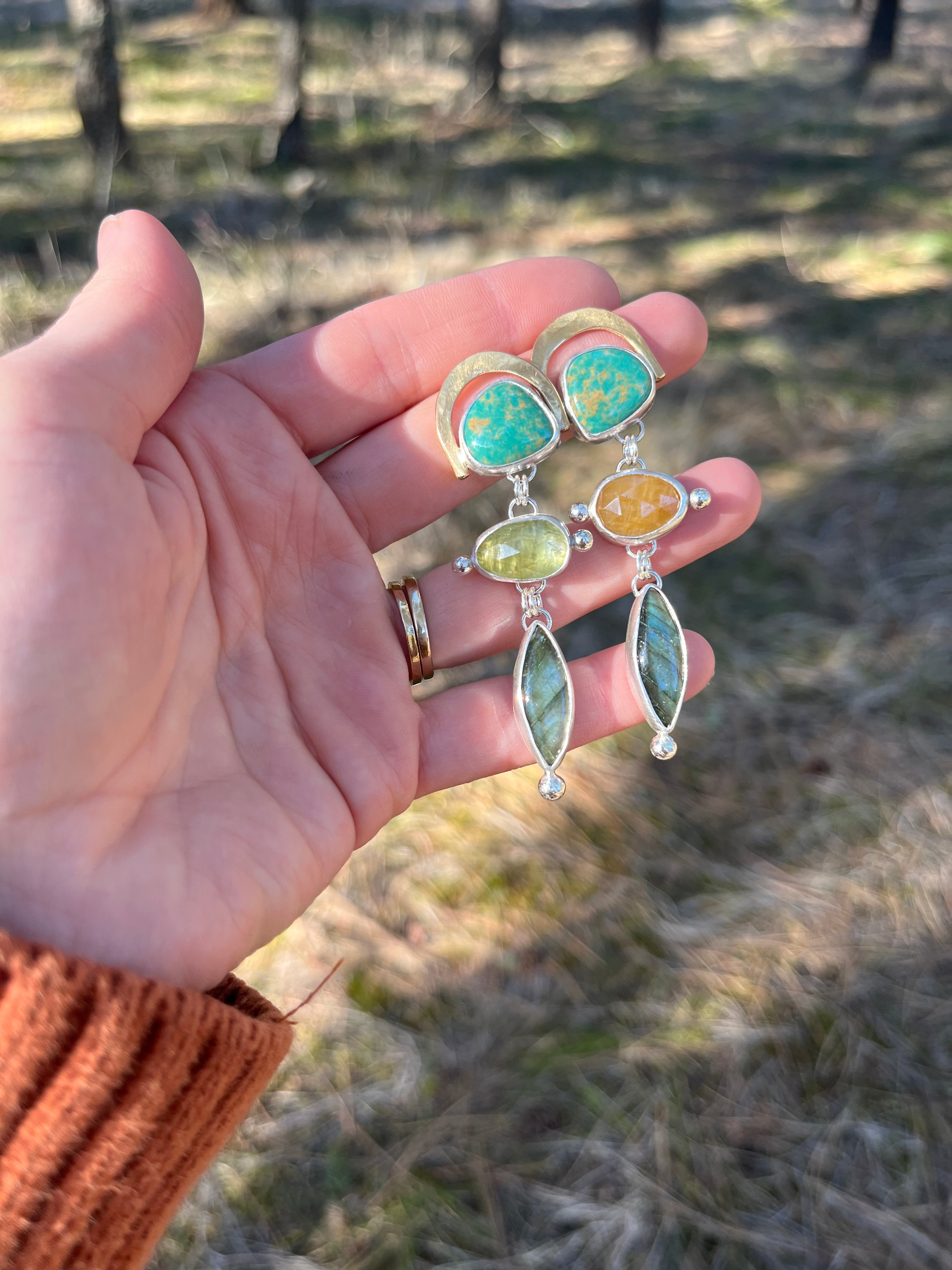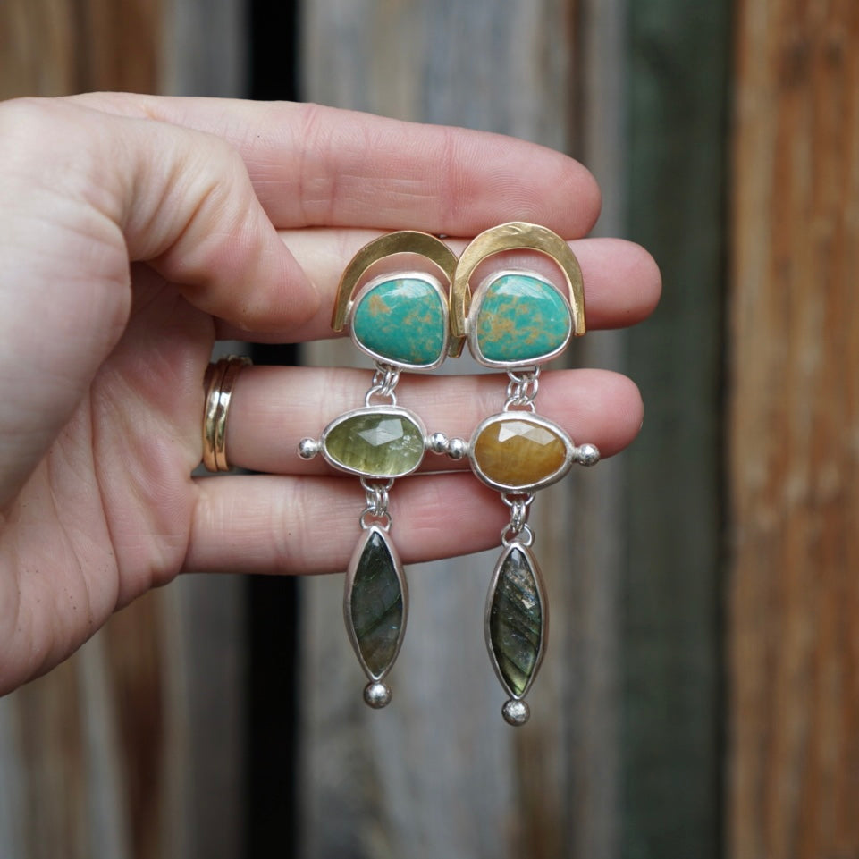These stunning earrings feature three different types of stone; American mined turquoise, green and yellow faceted sapphires, and shimmering labradorite. Accented with silver ball detail and attached by links, these earrings have wonderful movement. Brass loops crown the top stone and the earrings are finished with sterling silver ear post and earnuts. These measure just under 3 inches long.