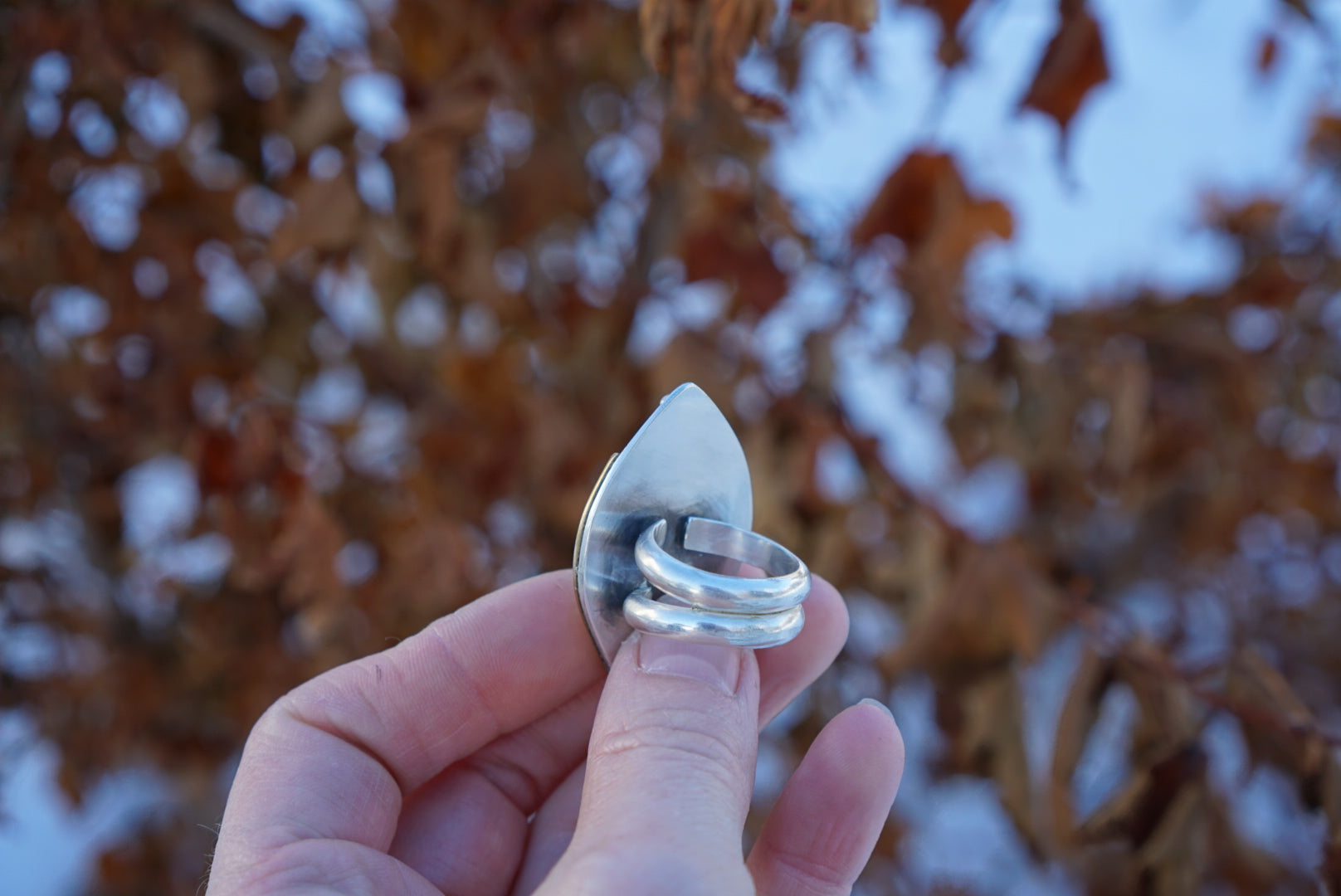 This gorgeous thick and hefty ring features a beautiful thick slice of high grade deep green Malachite. The chunky gemstone is nestled inside a thick sterling silver bezel with gorgeous brass layered details along the edge with silver ball accents. The ring face is perched on a hefty double half round split shank ring band creating a sturdy and comfortable fit. The ring band is extra thick and measures a size 6.