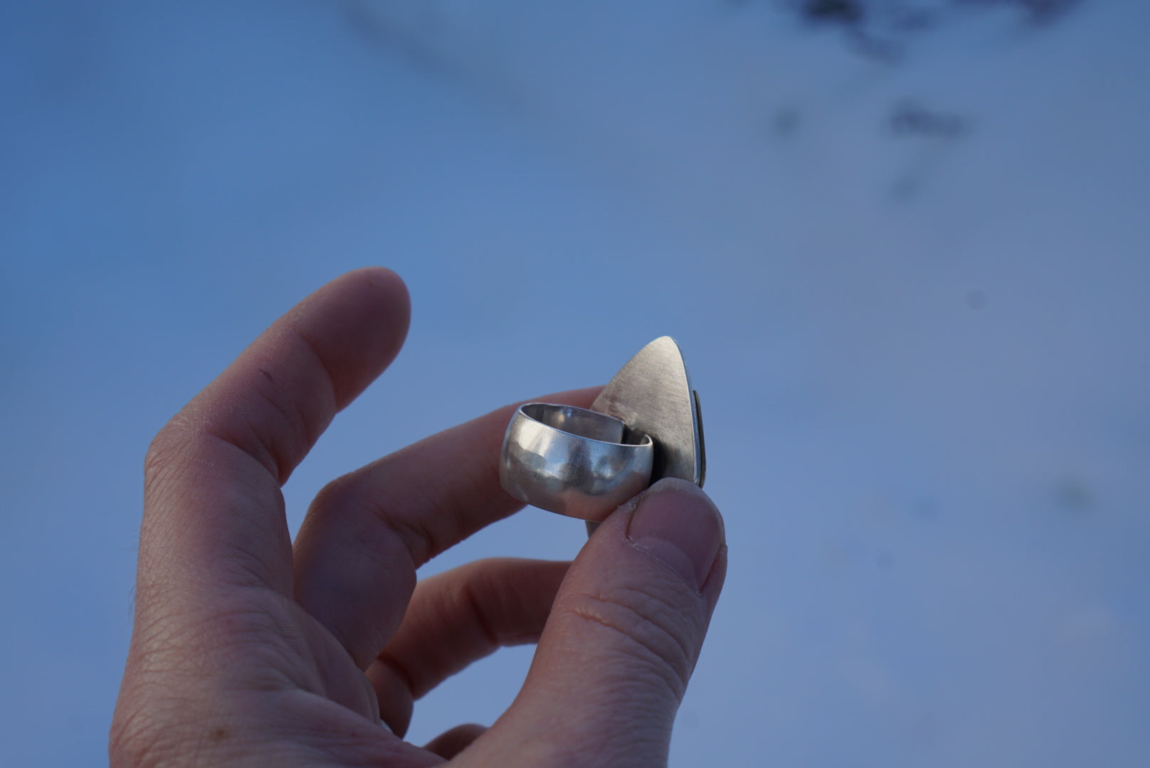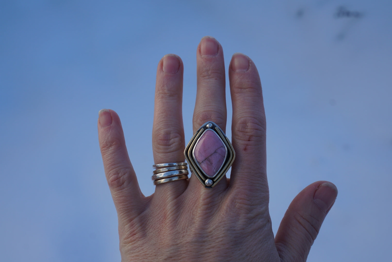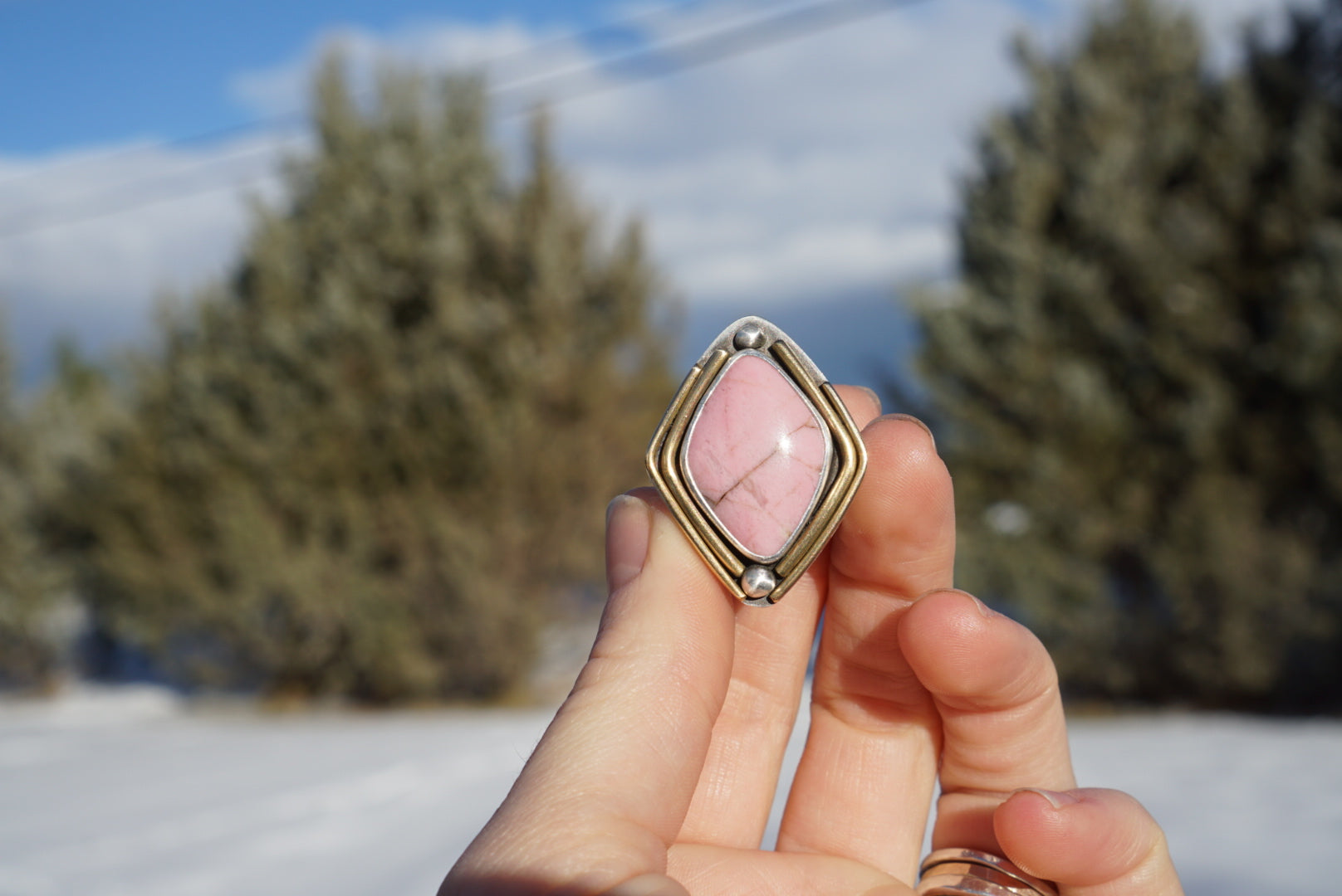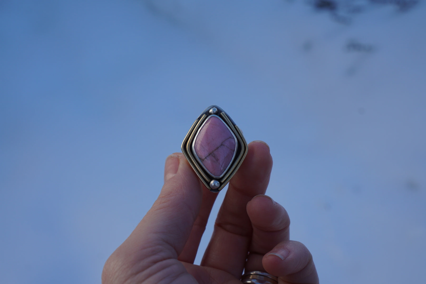 This gorgeous thick and hefty ring features a beautiful thick slice of high grade dusty pink Rhodonite. The chunky gemstone is nestled inside a thick sterling silver bezel with gorgeous brass layered details along the edge with silver ball accents. The ring face is perched on a hefty and wide domed ring band creating a sturdy and comfortable fit. The ring band is extra thick and measures a size 6-6.26.