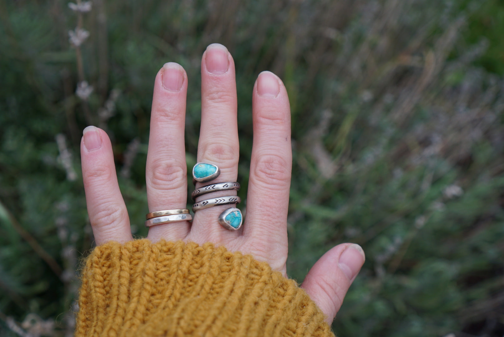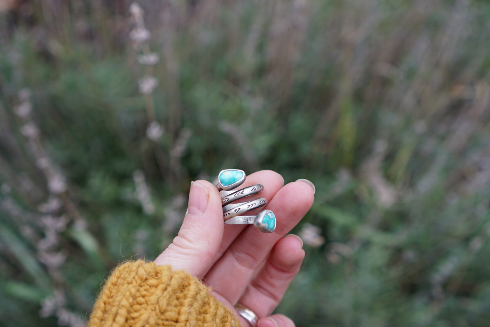 This funky and fun ring features a half round triple twisted band that has been hand stamped and adorned with two little bright blue Sonoran Mountain Turquoise stones at each end. This ring sits wide on the finger. Oxidized and polished for a soft rustic finish and fits a size 5.