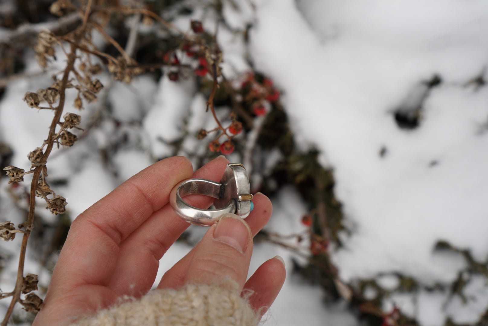 This gorgeous thick and hefty ring features a beautiful thick slice of raw blue old stock Kingman Nugget Turquoise. The matrix is beautiful and even has tiny specks of pyrite inside. Set in a hefty sterling silver setting with brass talon or claw settings along the edge grasping it in place. Unique and beautiful. The band is extra thick and chunky but not too wide, best fits a size 7.25-7.5.