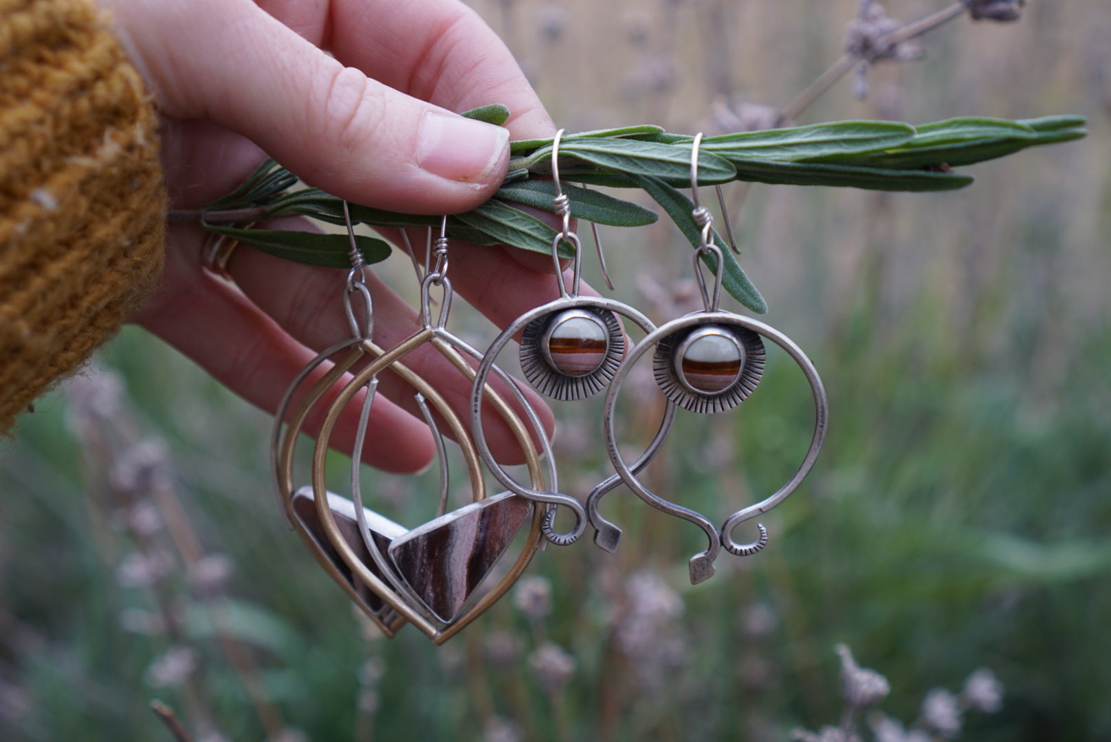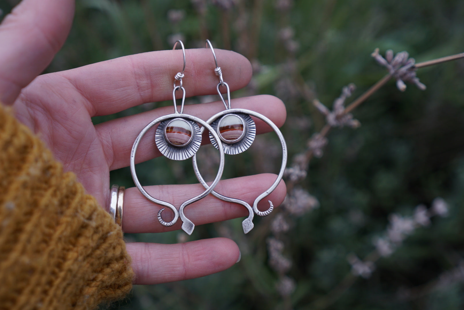 Incredible earrings featuring beautiful slices of rare high grade pink, gray and maroon scenic Jasper gemstones simply set in sterling silver with hand stamped sunburst details. A hand forged snake circles around to create a hoop with its head and curly tail at the base. Earrings dangle just about 2.5 inches long and are finished with hand crafted Sterling silver earwires. Oxidized and polished for a soft rustic finish. These are sure to WOW!