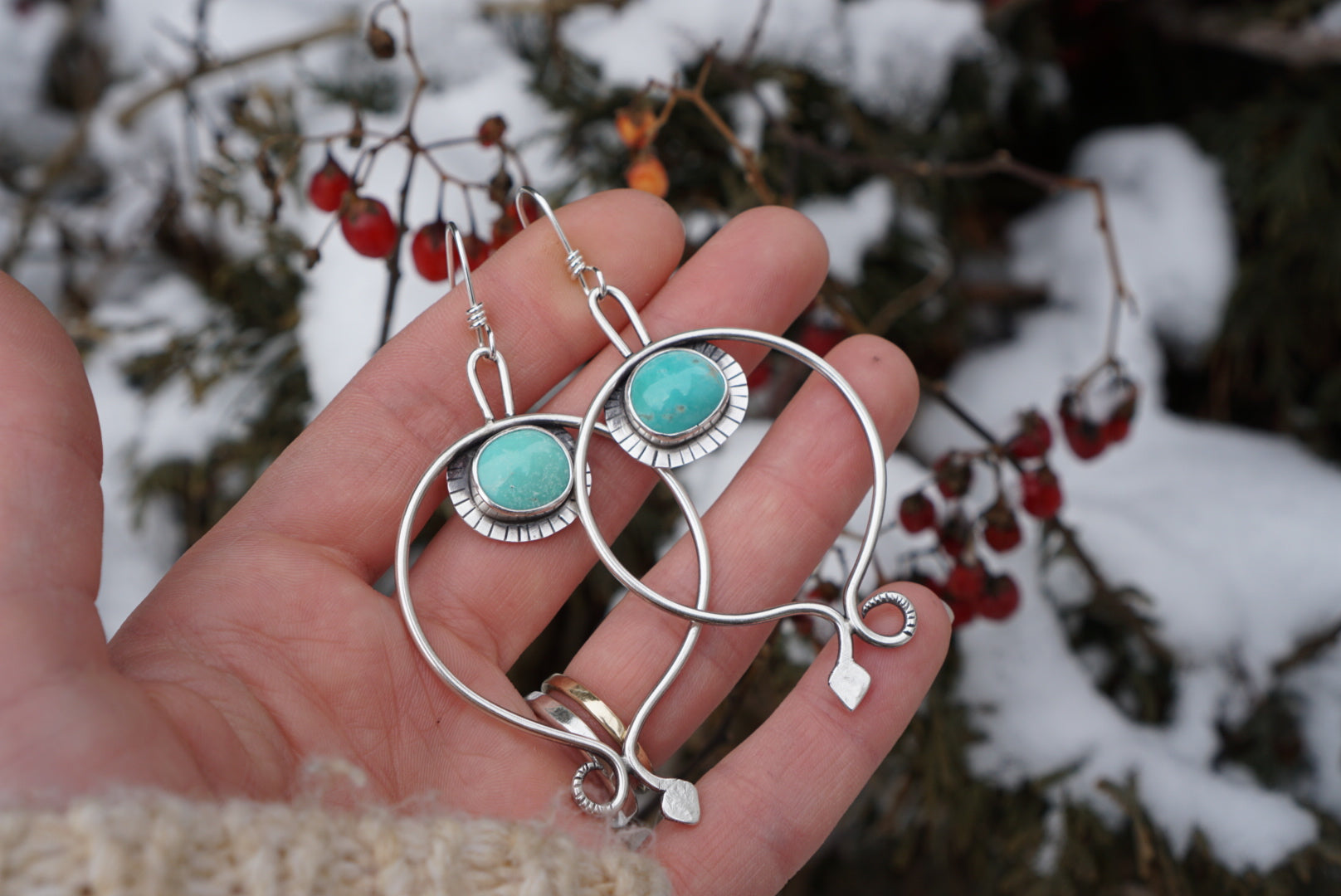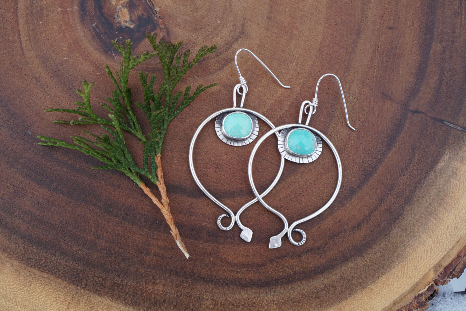 Incredible earrings featuring beautiful slices of turquoise gemstones simply set in sterling silver with hand stamped sunburst details. A hand forged snake circles around to create a hoop with its head and curly tail at the base. Earrings dangle just about 2.5 inches long and are finished with hand crafted Sterling silver earwires. Oxidized and polished for a soft rustic finish. These are sure to WOW!