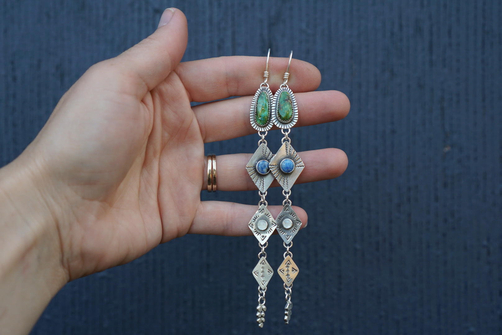 Incredible earrings featuring a unique Diamondback snake design. This pair features green Sonoran Gold Turquoise, Lapis, and Moonstone. Beautiful hand stamped details and handmade rattler charms at the bottom. Earrings dangle just about 4.5 inches long and are finished with hand crafted Sterling silver earwires. Oxidized and polished for a soft rustic finish. These are sure to WOW!