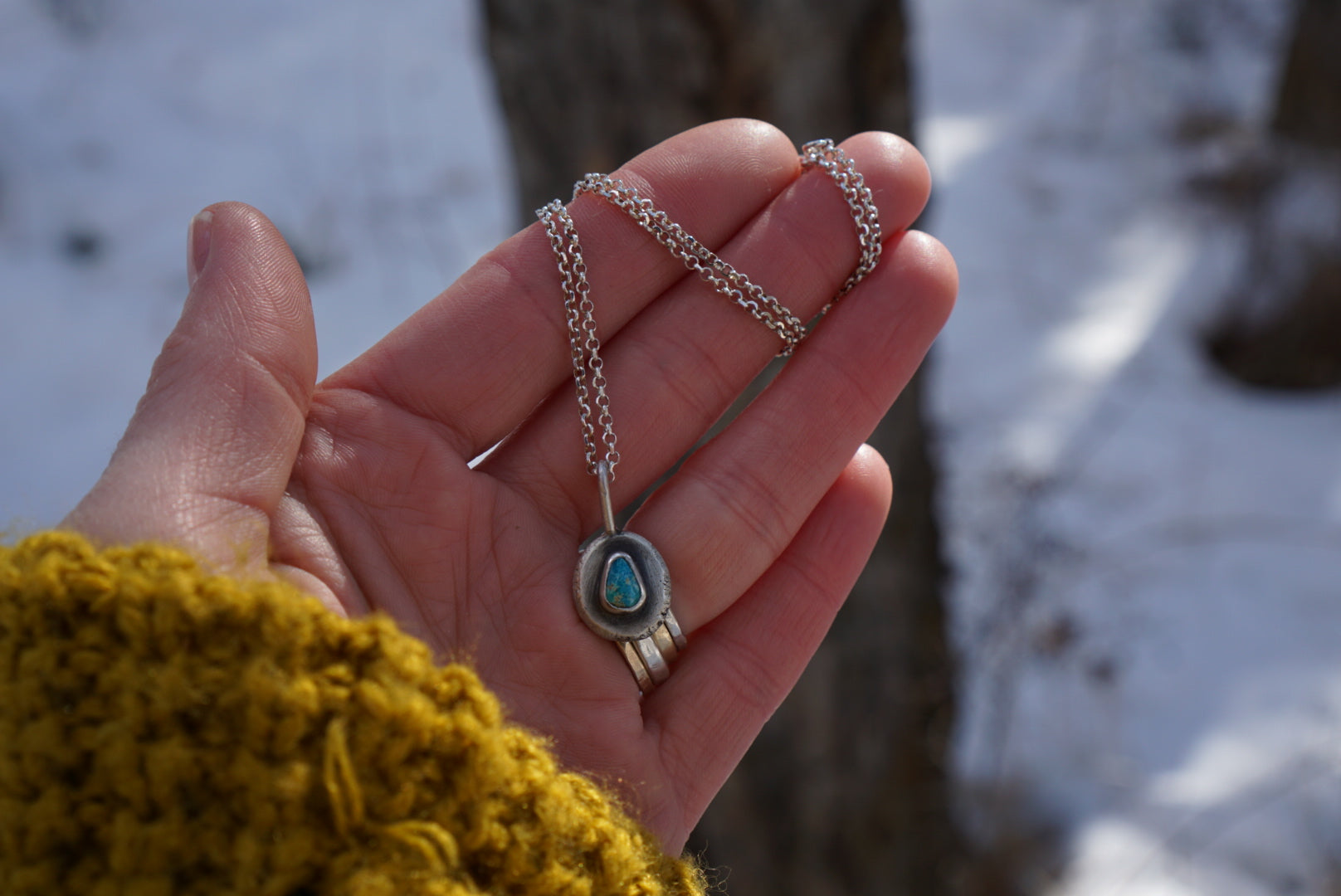 Little handmade and formed reclaimed nugget pendant of solid sterling silver. Raw and rustic with a tiny little American mined turquoise gemstone nestled in the center. This beautiful little pendant will hang from salvaged 16 inch length sterling silver chain. Perfect for everyday!