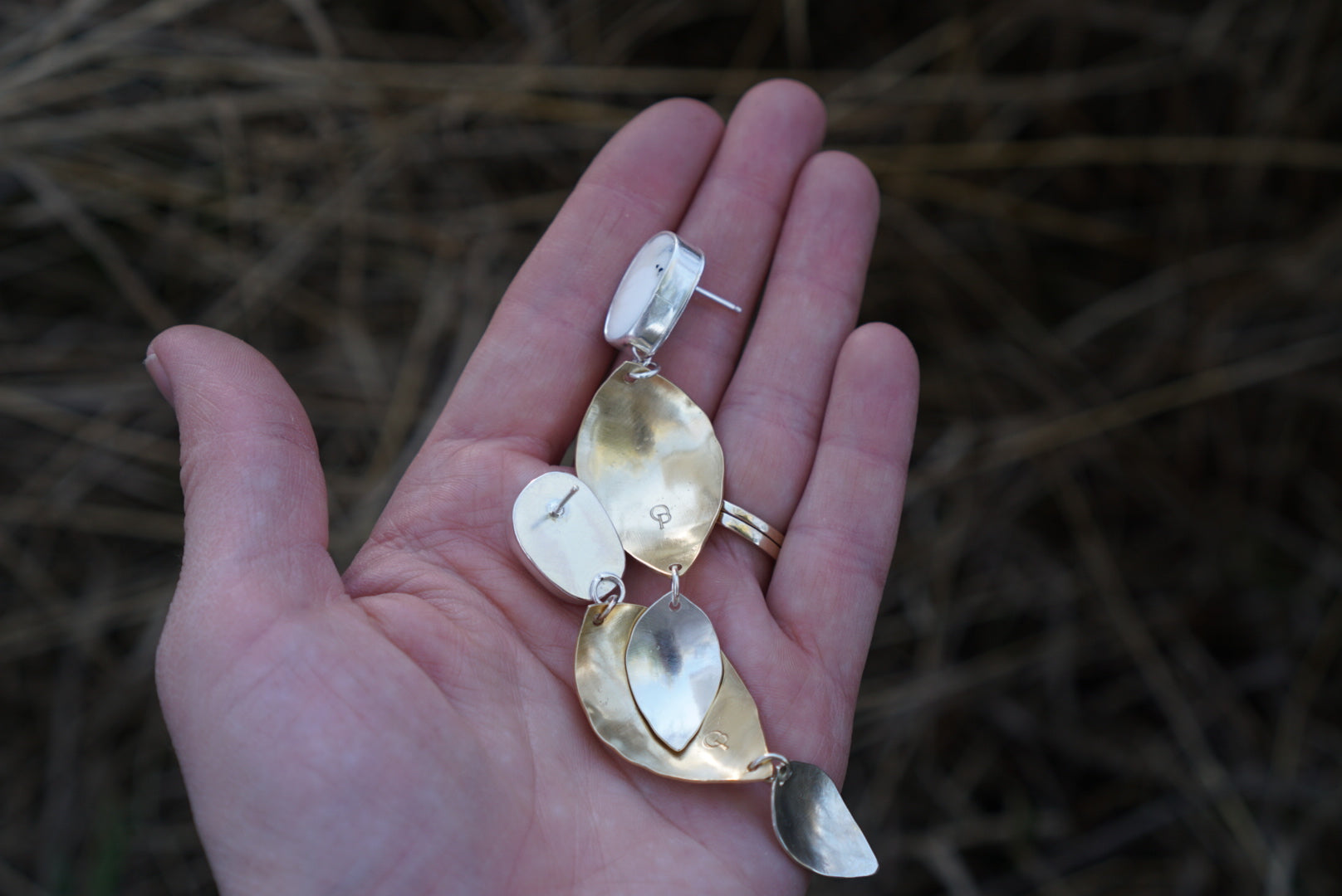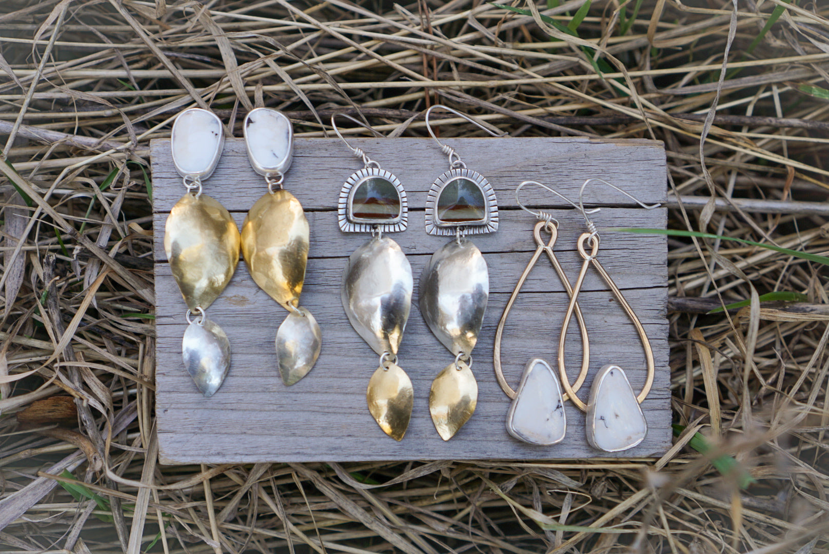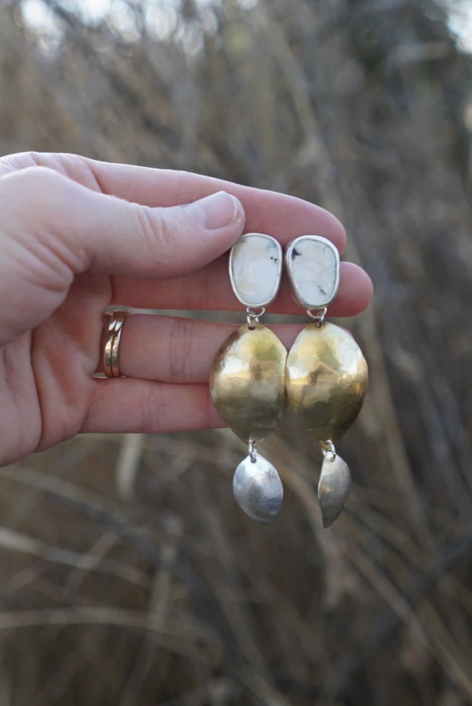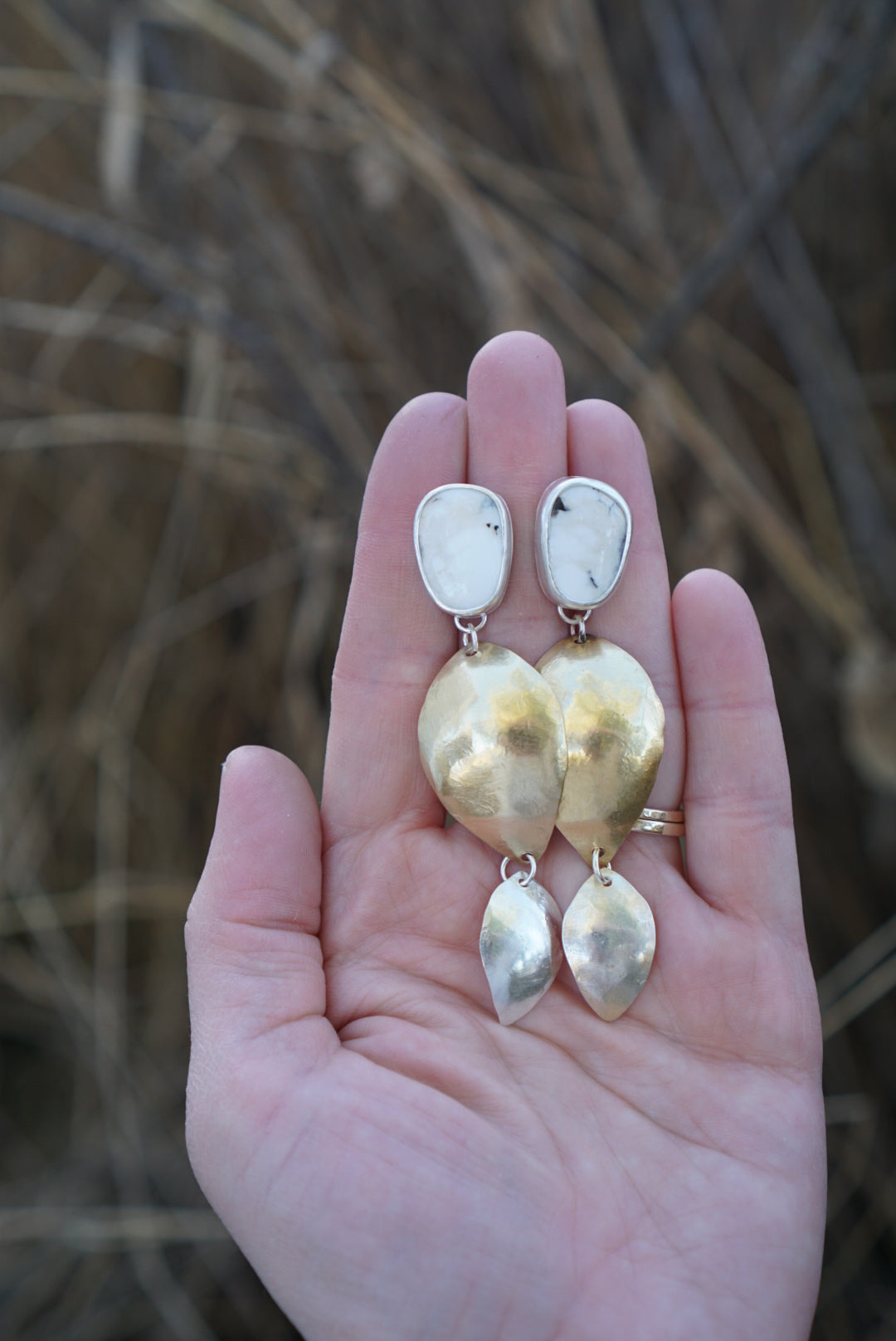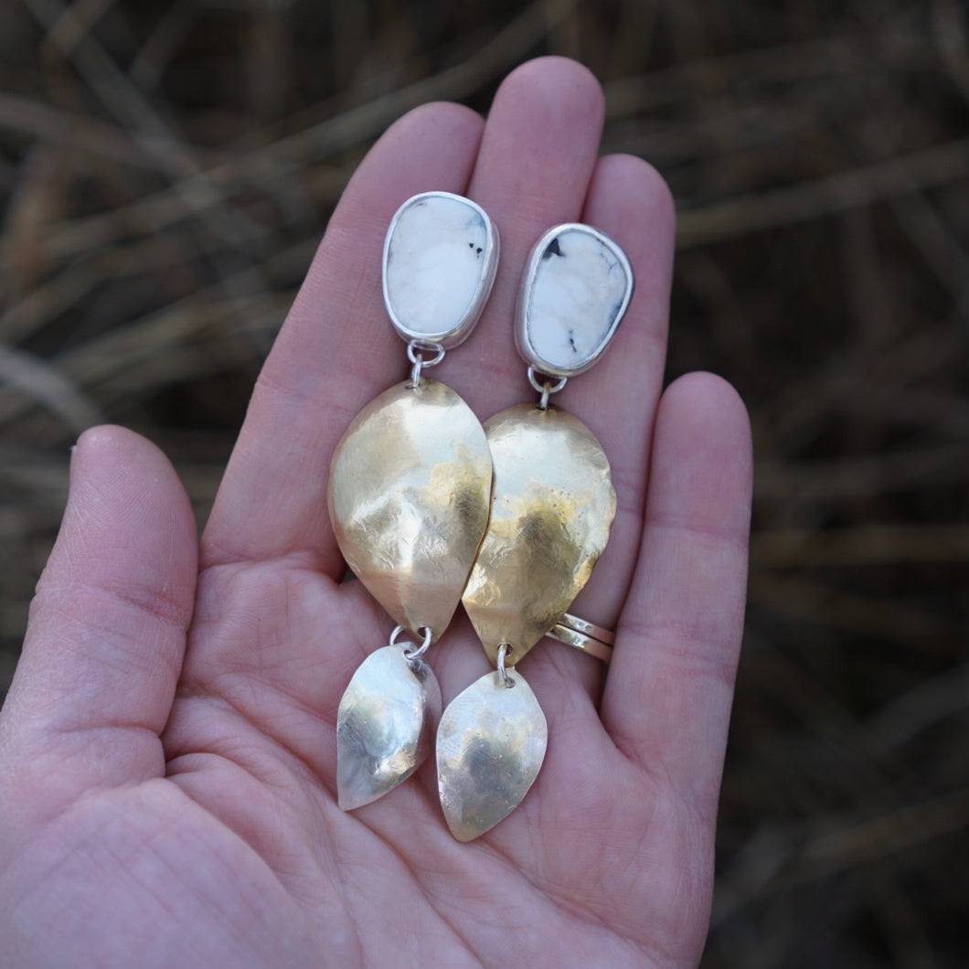 Beautiful earrings featuring amazing White Buffalo stones with mixed metal domed and textured leaves dangling below. These earrings have incredible movement and are light on the ear but still make a statement. These earrings measure about 3 inches in length and are finished with sterling silver ear post and earnuts.