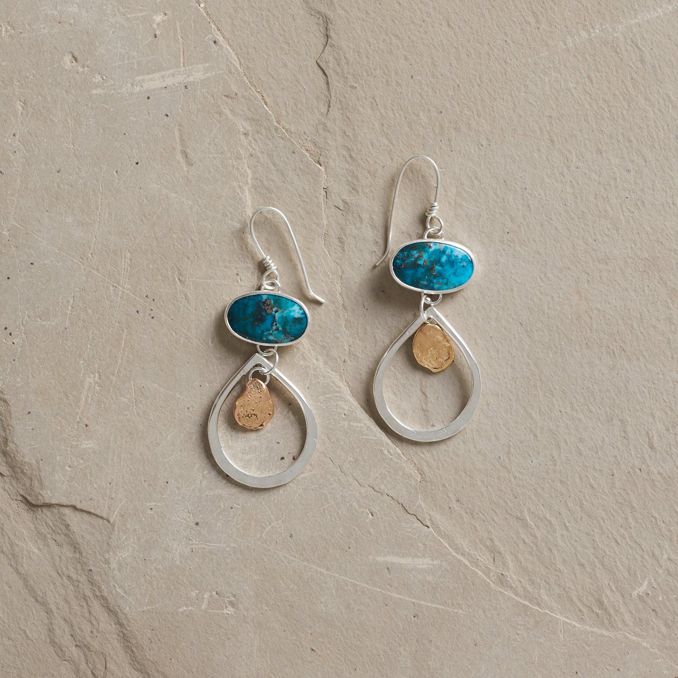 Stunning teardrop hoops featuring the bright blue Turquoise stones set simply in sterling silver with brass ore pressed charms dangling in the hand shaped sterling silver teardrop hoops. Earrings dangle from hand crafted sterling silver ear wires and hang about 2.75 inches in length.