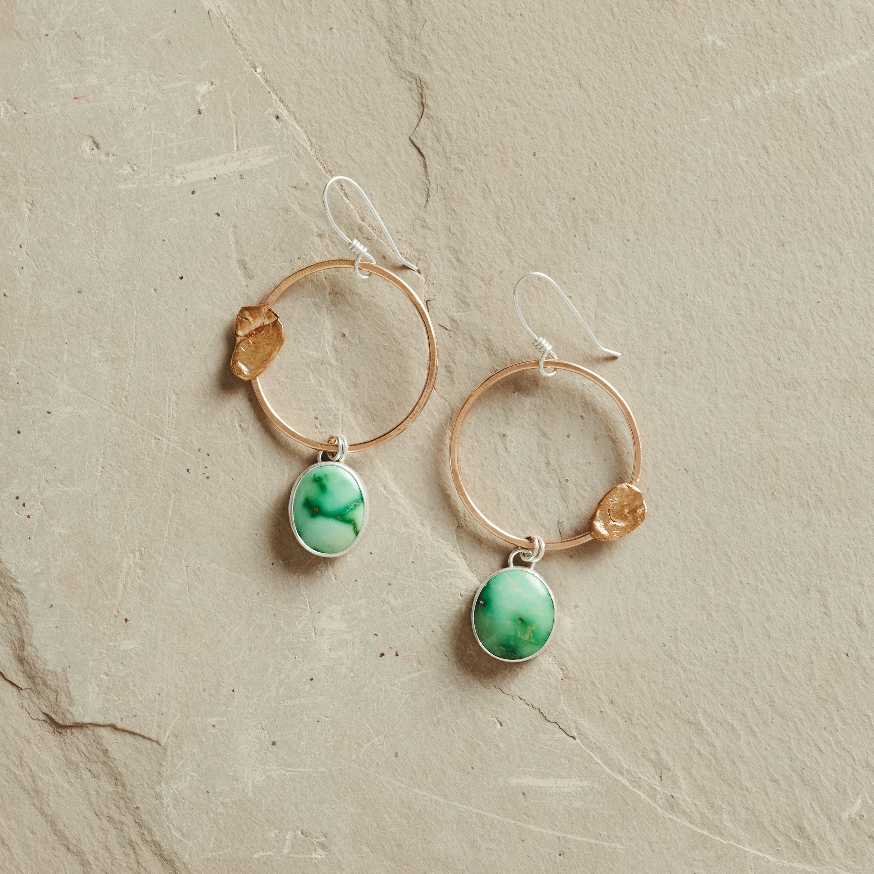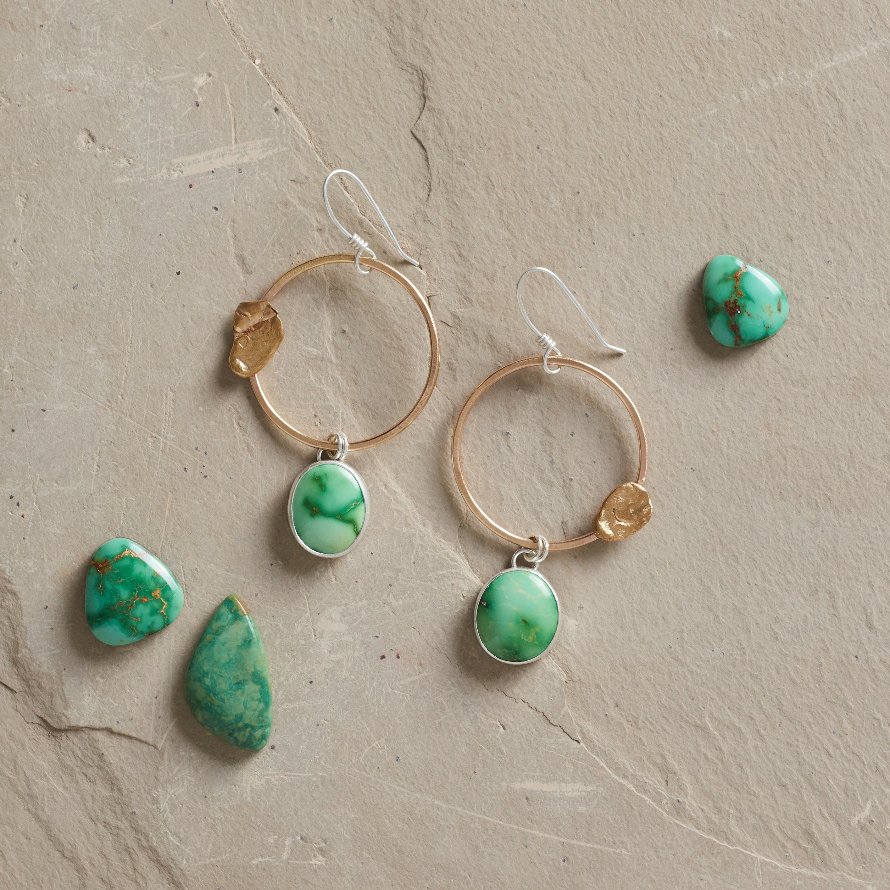 Stunning hoops featuring Emerald Valley Turquoise stones set simply in sterling silver and dangling below hand shaped 14k gold fill brass hoops, with organic shaped hand pressed brass details on the hoop. Earrings dangle from hand crafted sterling silver ear wires and hang about 2.75 inches in length.