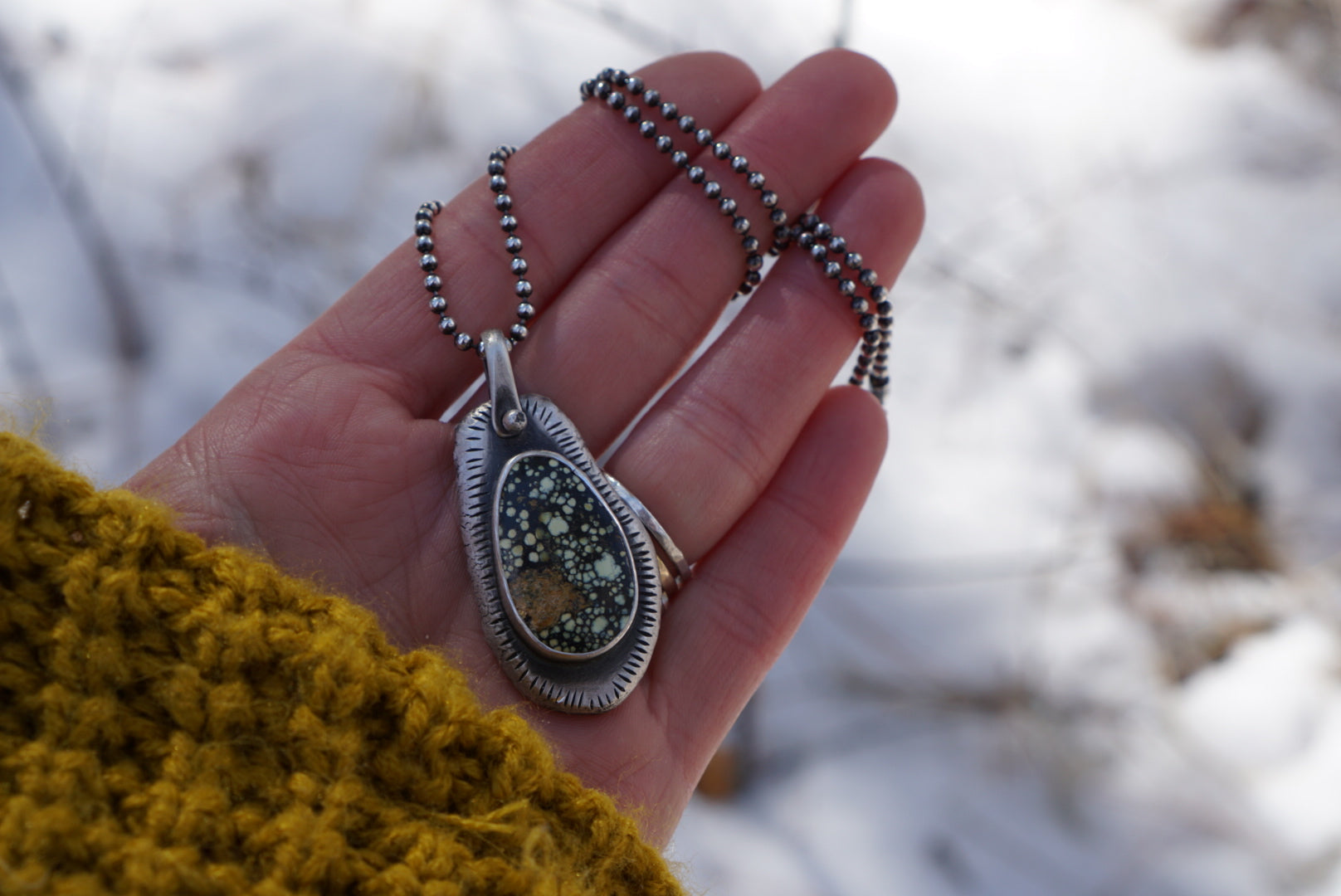Chunky and heavy duty handmade and formed reclaimed nugget pendant of solid sterling silver. Raw and rustic with a big hunk of American mined Variscite gemstone nestled in the center. The stone has a minty yellowish green speckled matrix with black and brown webbing. This beautiful pendant will hang from a 16 inch length oxidized sterling silver ball chain. Perfect for everyday!