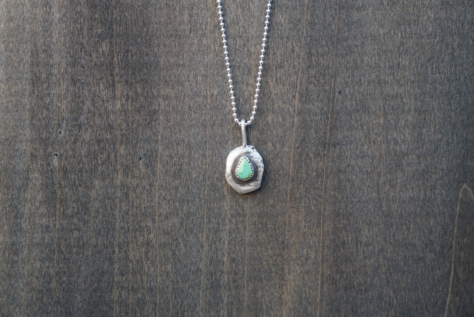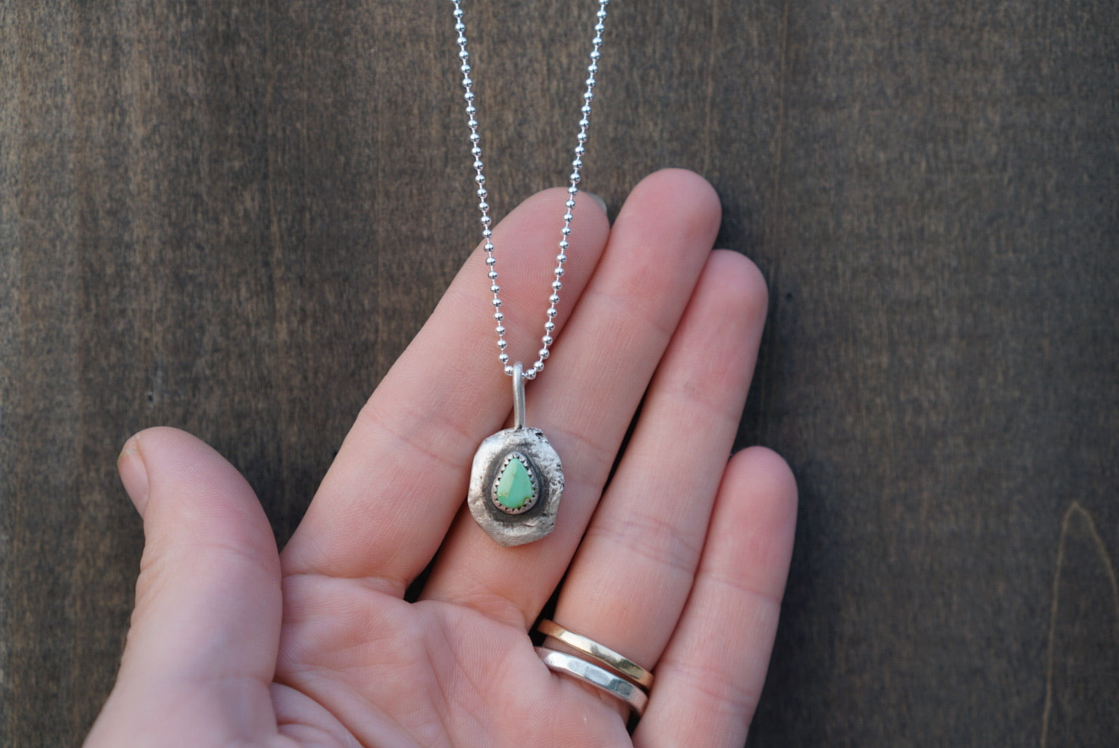 Little handmade and formed reclaimed nugget pendant of solid sterling silver. Raw and rustic with a tiny little Sonoran Gold turquoise gemstone nestled in the center. This beautiful little pendant will hang from a sterling silver 22 inch ball chain.