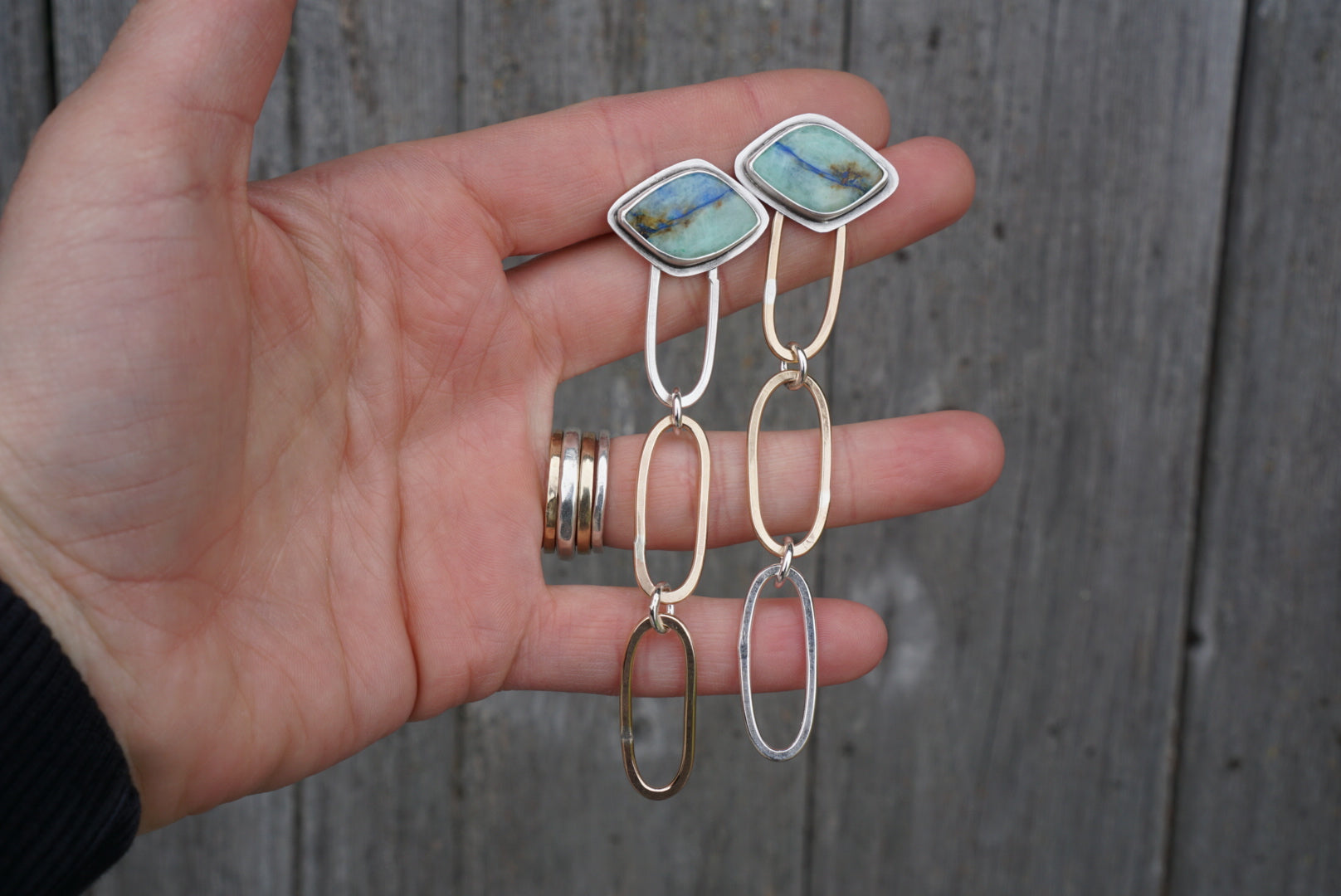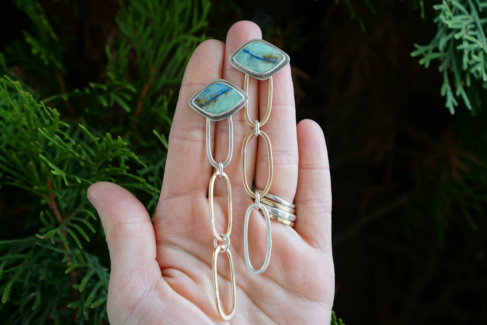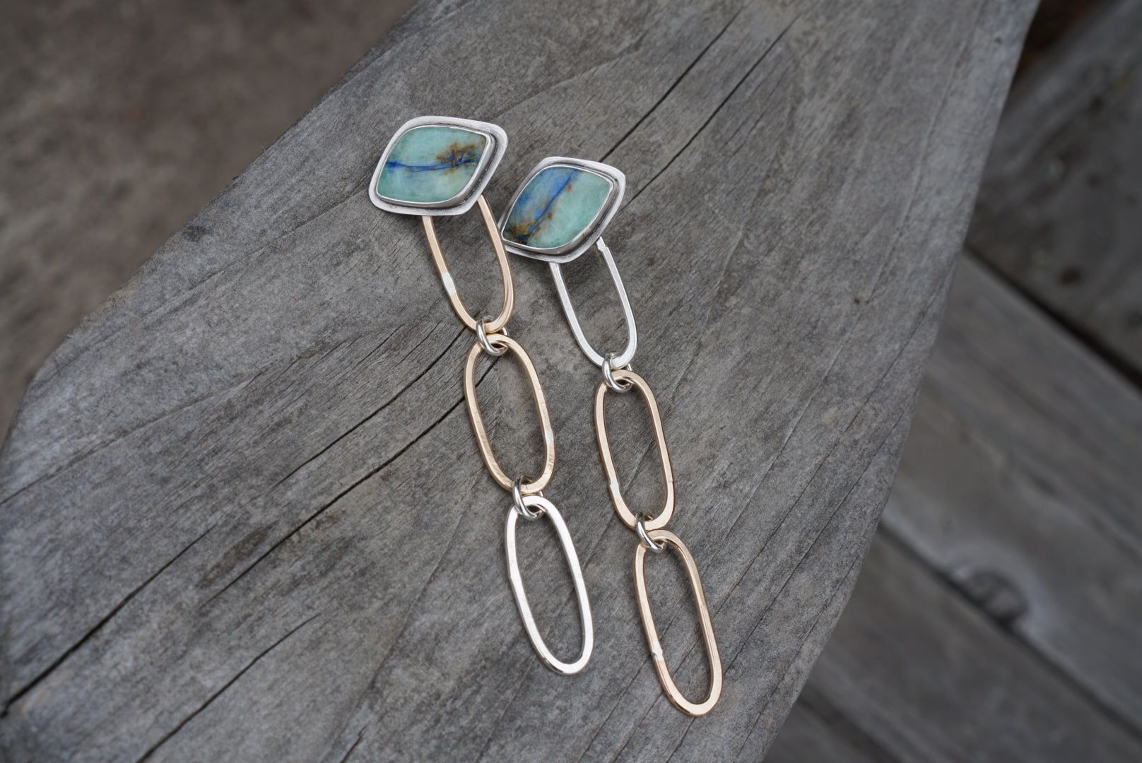 These earrings are so cool. I love how simple they are yet they still make a statement. Gorgeous slices of Azurite Ribbon gemstones are simply set in sterling silver and below dangles mixed metal handcrafted 14K Goldfill and sterling silver paperclip chain links. These are so easy to wear and go with everything. Finished with sterling silver ear posts and comfort clutch earnuts. They measure about 3.5 inches from the top of the post to the bottom of the chain.