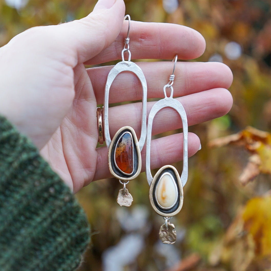 These earrings are so so special. Created from hand forged oblong links hammered and shaped for a rustic feel with shadow box set stones set perched at the base; consisting of one rock hounded and cut Yellowstone Montana Agate and one locally harvested Montana Elk Ivory. Each gem is circled by a halo of brass with hand pressed brass ore charm dangling below. These are one of a kind beauties. They measure 3.25 inches long and dangle from hand crafted sterling silver earwires.
