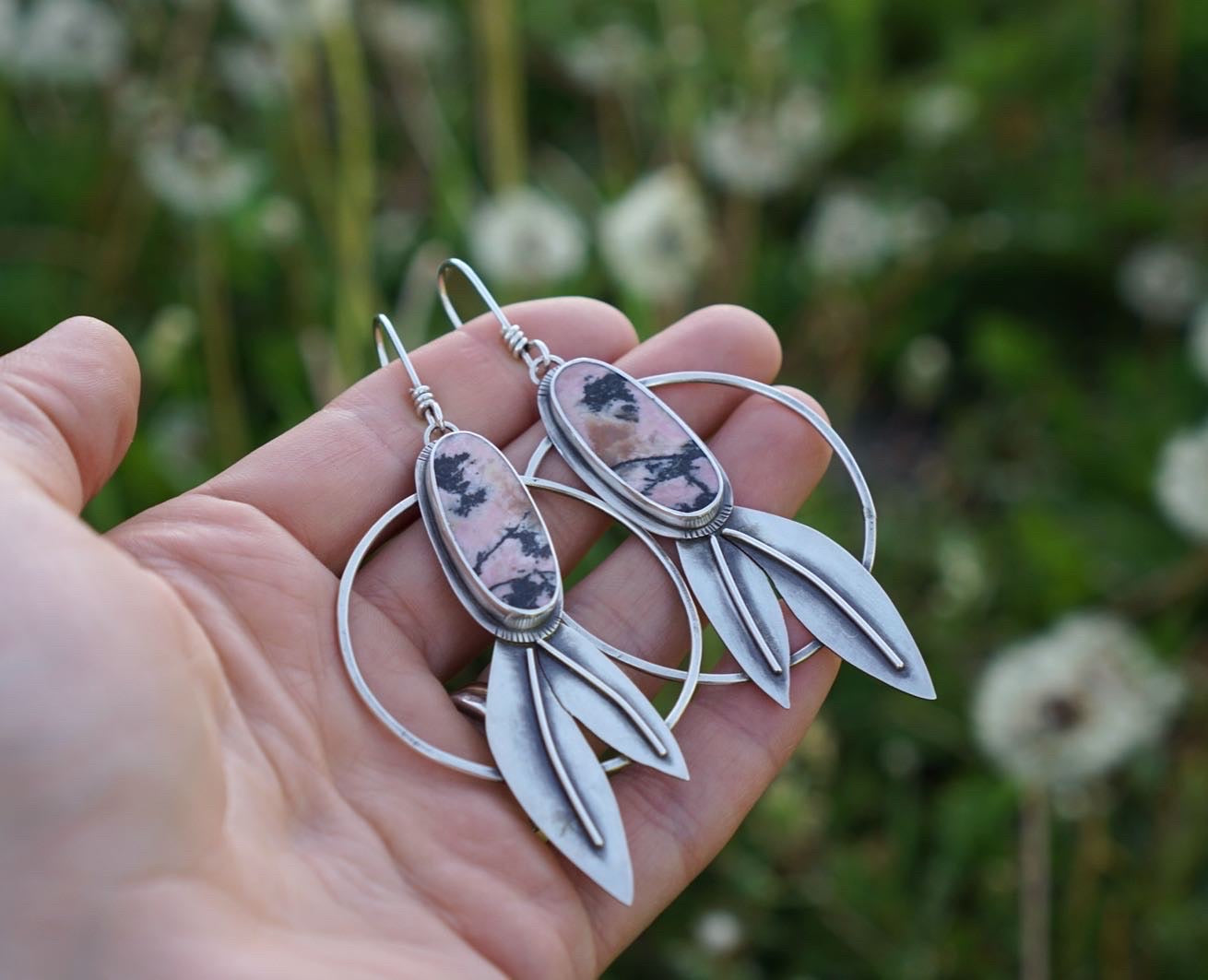 Lovely earrings featuring hand fabricated leaf designs in the center of medium sized sterling silver hoops. Nestled long the top are gorgeous slices of high grade Rhodanite. The matrix in these stones is stunning and features hues of pink, black and tan. Earrings dangle about 3.25 inches long and are finished with hand crafted Sterling silver earwires. Oxidized and polished for a soft rustic finish. These are sure to WOW!