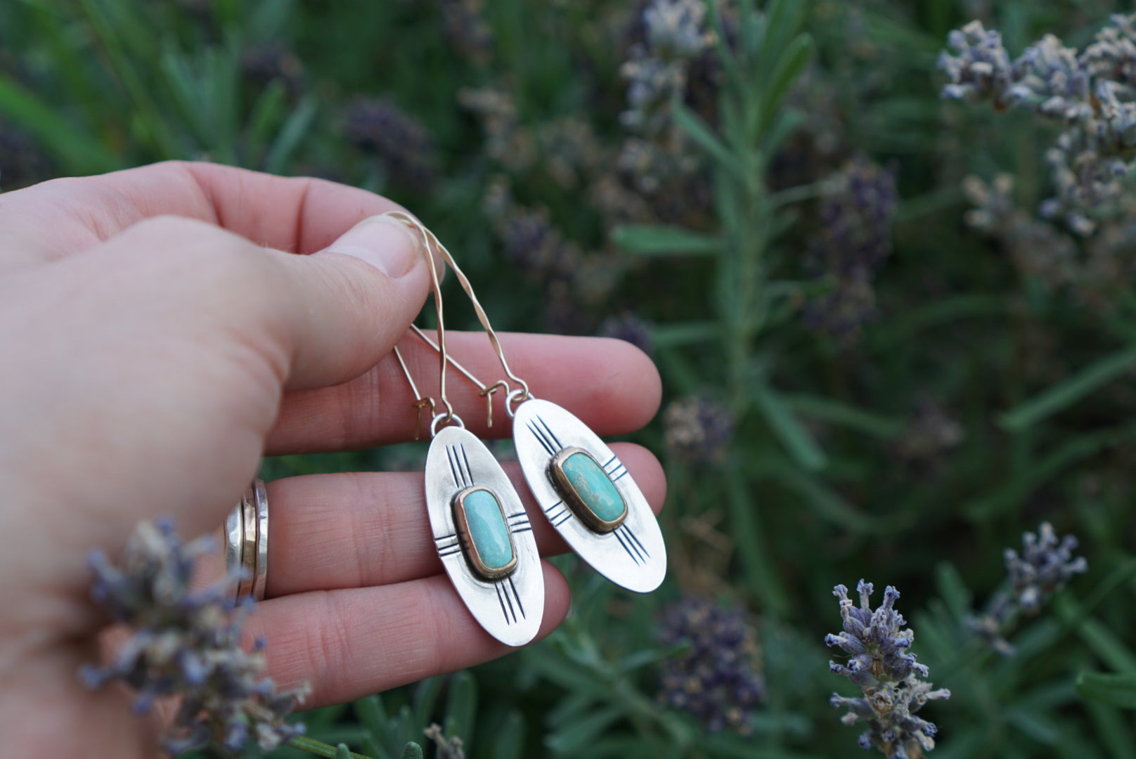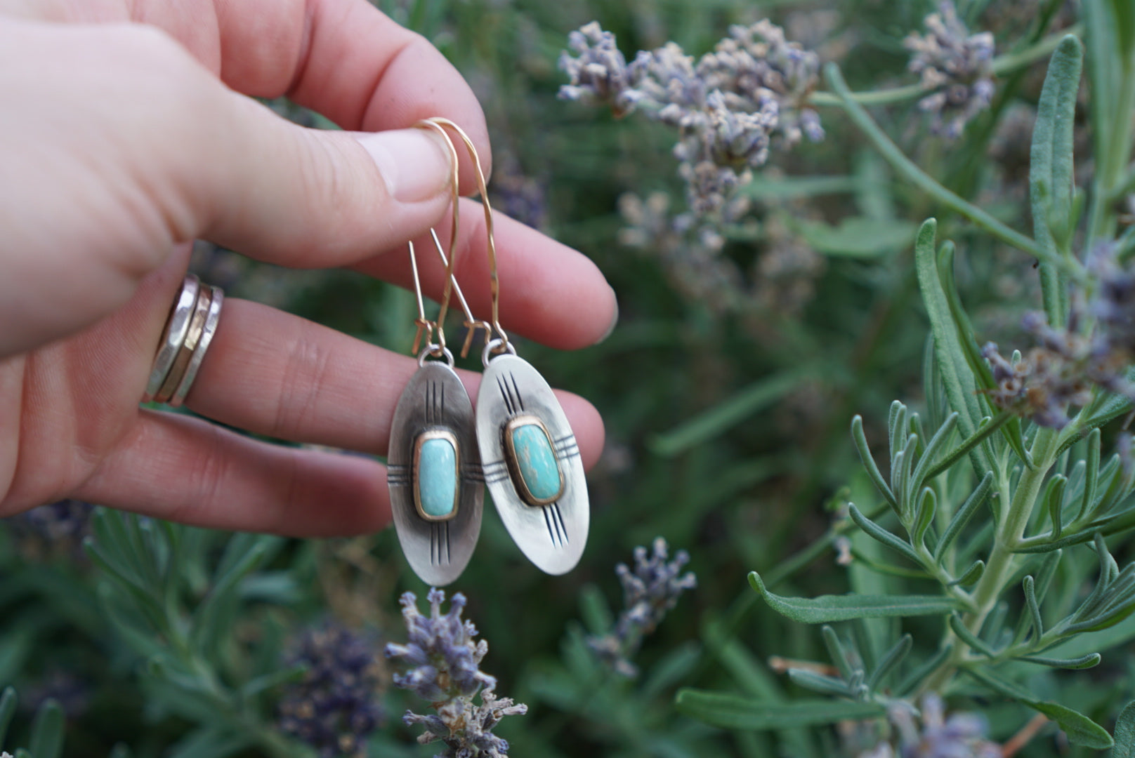 Perfect everyday earrings. Mixed metals of Sterling Silver and 14K Gold Fill with beautiful turquoise and hand stamped details. Super light weight. Finished with 14K Gold Fill kidney earwires. These measure just about 2.5 inches long.