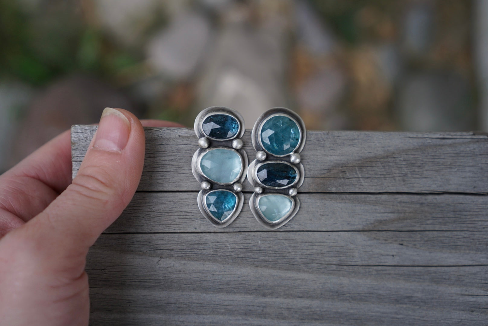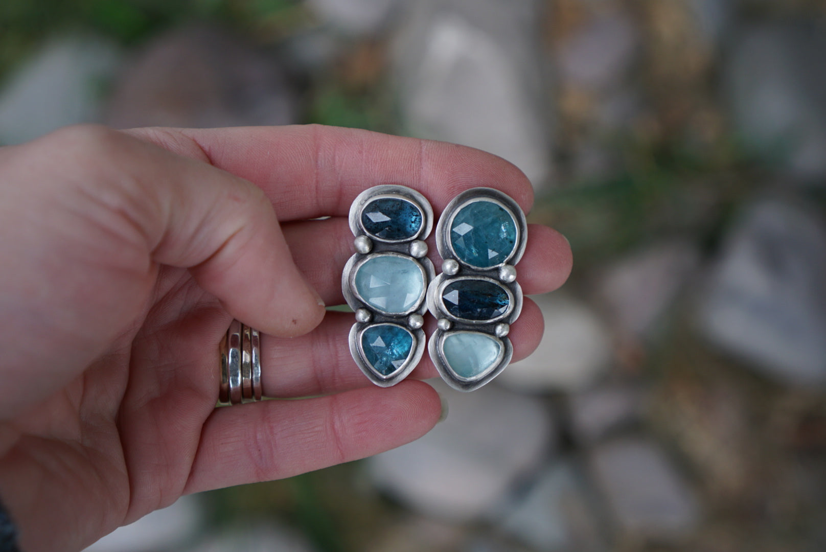 The perfect multi stone posts. Fantastic slices of shimmery and sparkly Aquamarine and light and dark blue Kyanite stones stacked atop each other. These are simple but stunning. Posts are sturdy and comfortable and finished with sterling silver comfort clutch earnuts. Earrings are oxidzed and polished for a soft rustic finish.