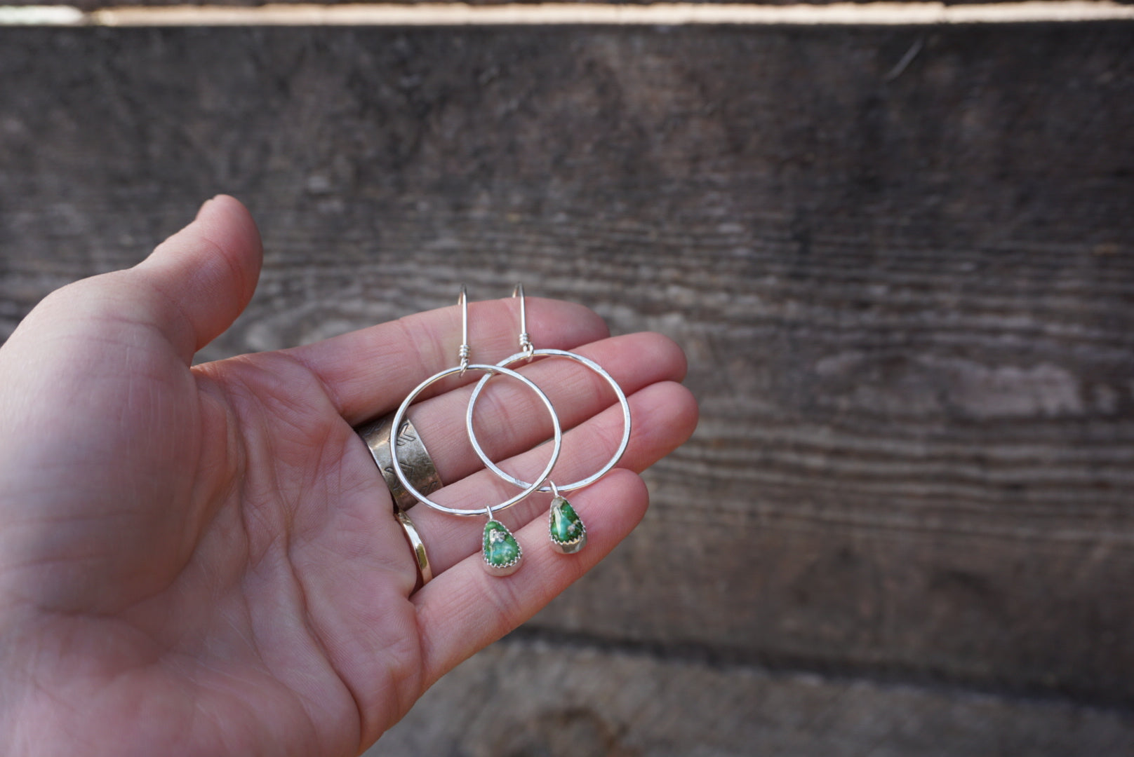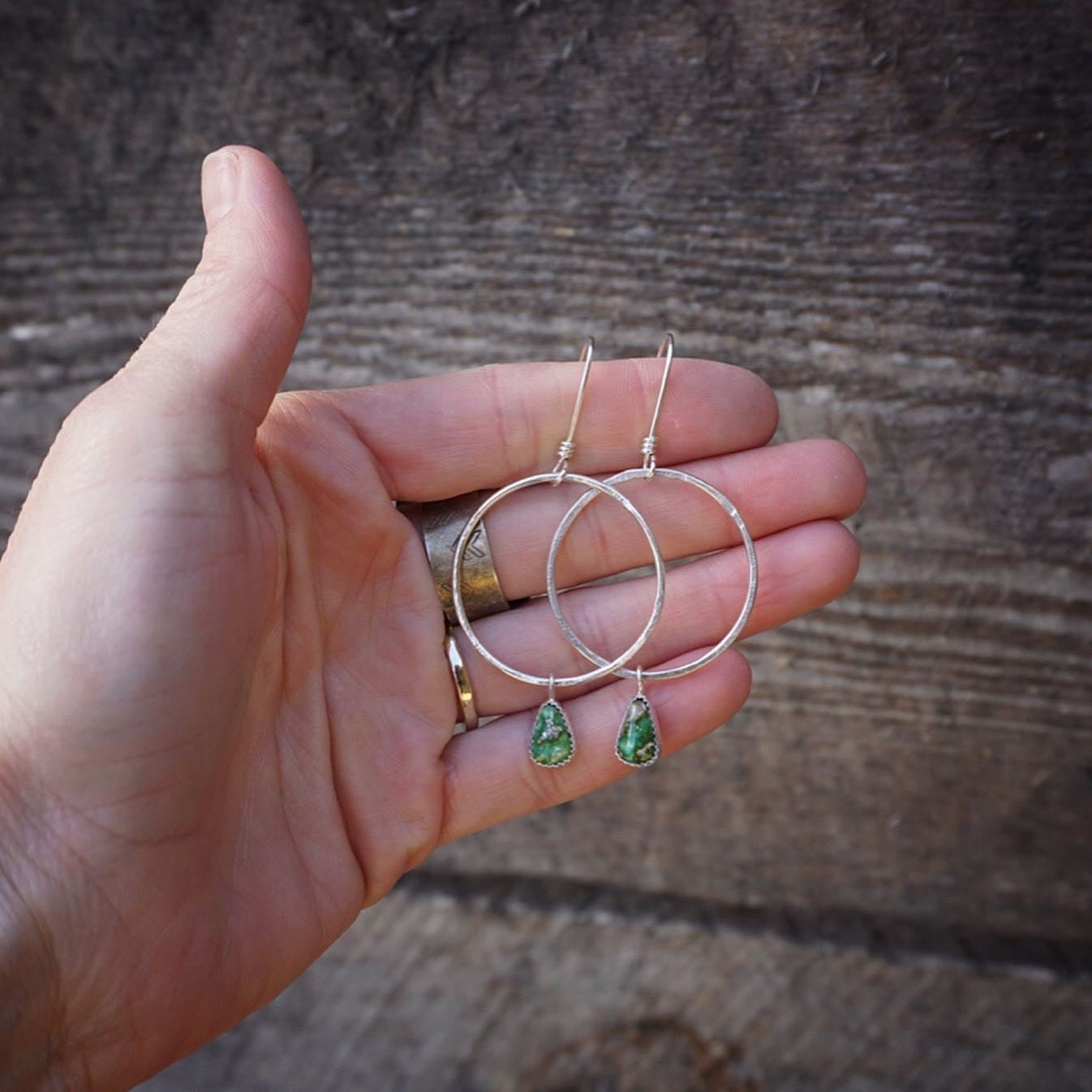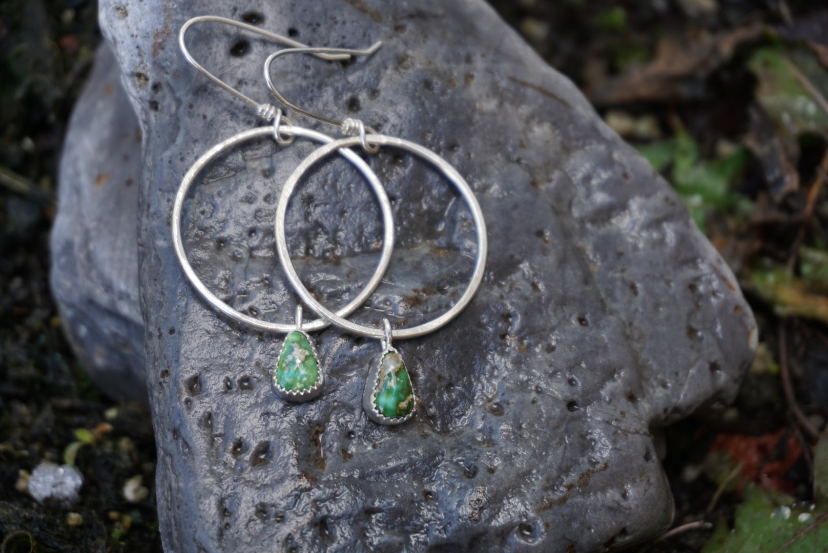 Beautiful smaller sized everyday hoops featuring gorgeous Sonoran Gold green turquoise gemstones. Earrings are completely handmade from fine and sterling silver and dangle from handmade sterling silver earwires. Hoops measure about 1 inch in diameter and hang about 2.25 inches long and are extra light and comfy for everyday wear.