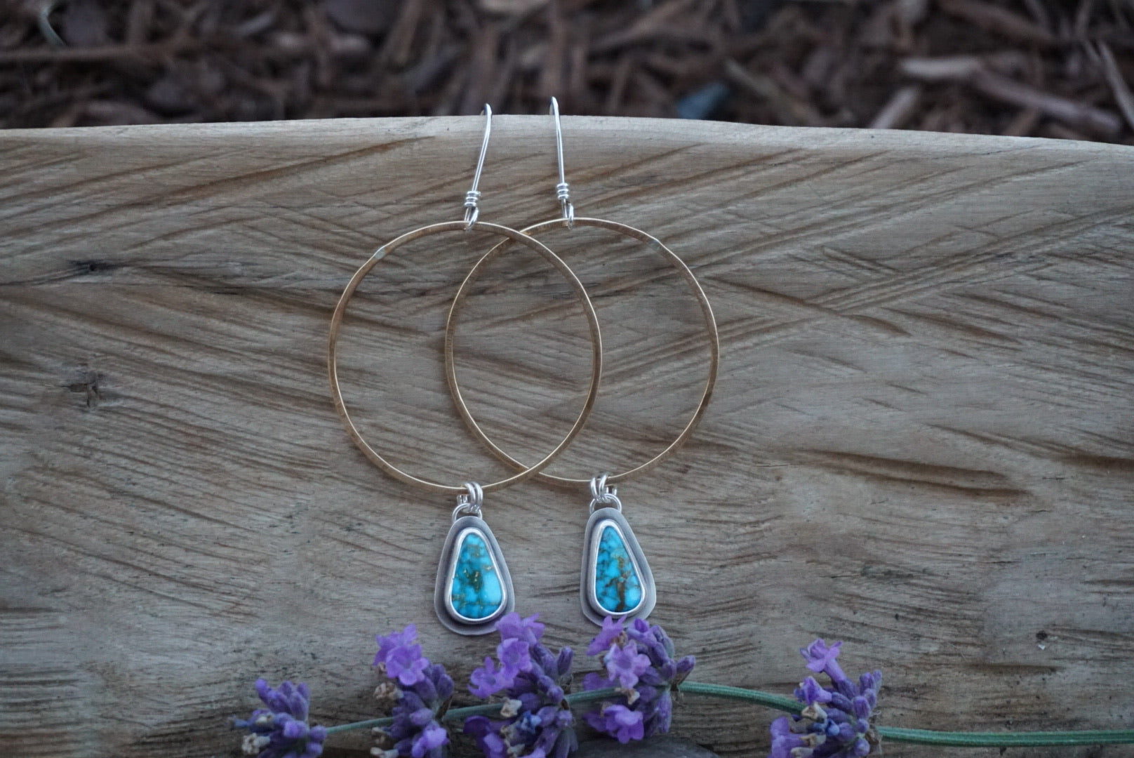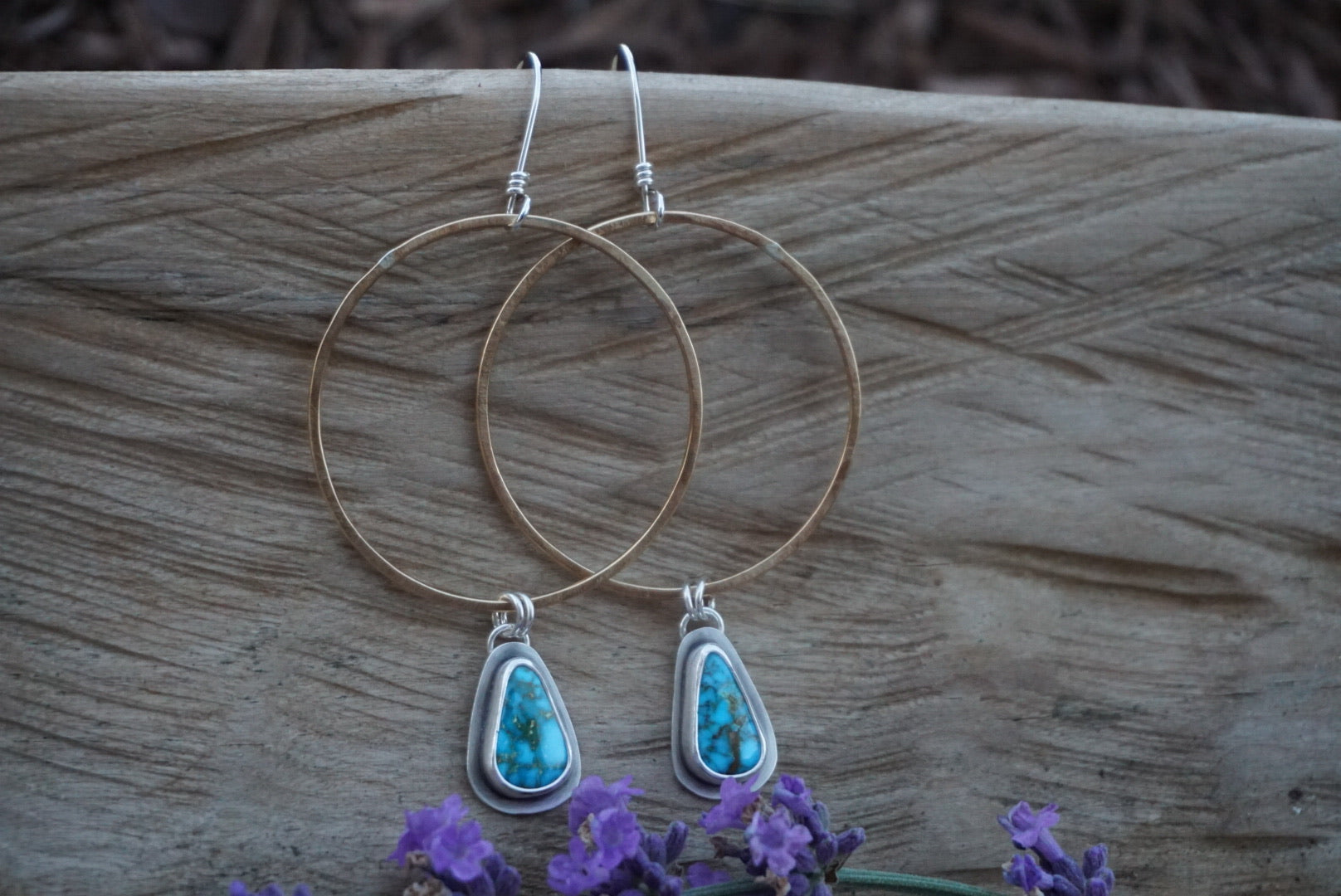 Beautiful medium/large sized everyday hoops featuring gorgeous American mined Kingman blue turquoise gemstones. Earrings are completely handmade from fine and sterling silver with crafted brass hoops and dangle from handmade sterling silver earwires. Hoops measure about 1.75 inches in diameter and hang just over 3 inches long and are extra light and comfy for everyday wear.