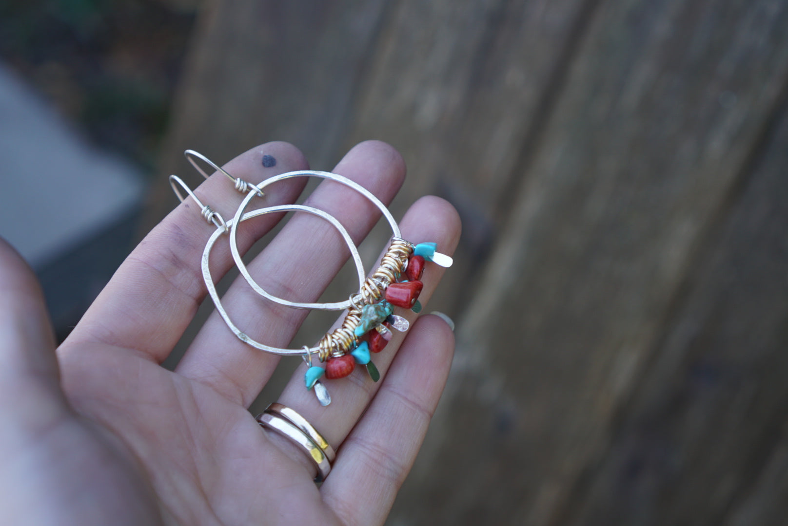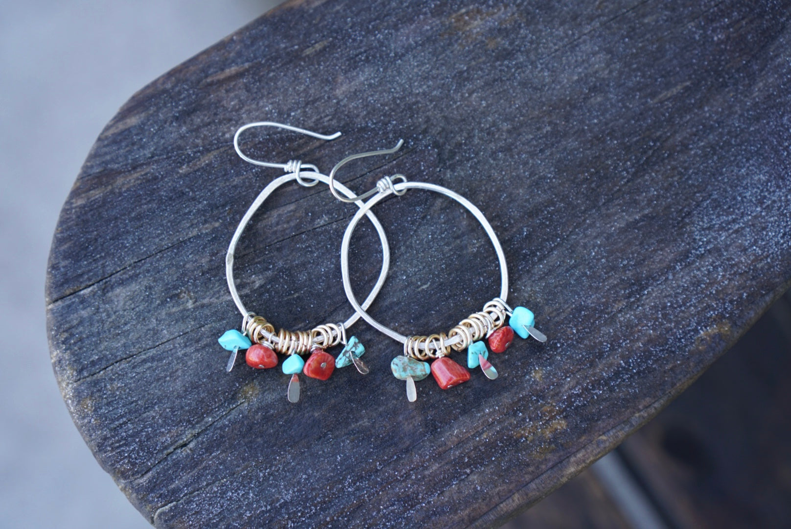 Organic Hoop Earrings- Sterling, Turquoise, Coral