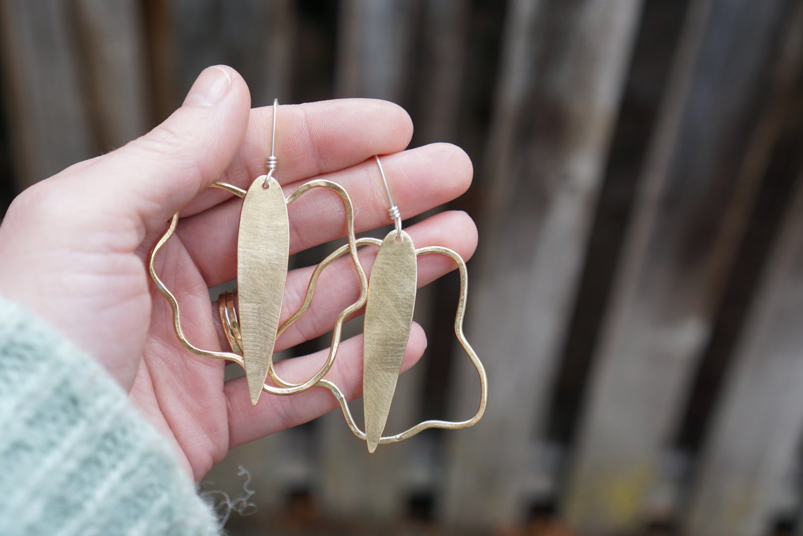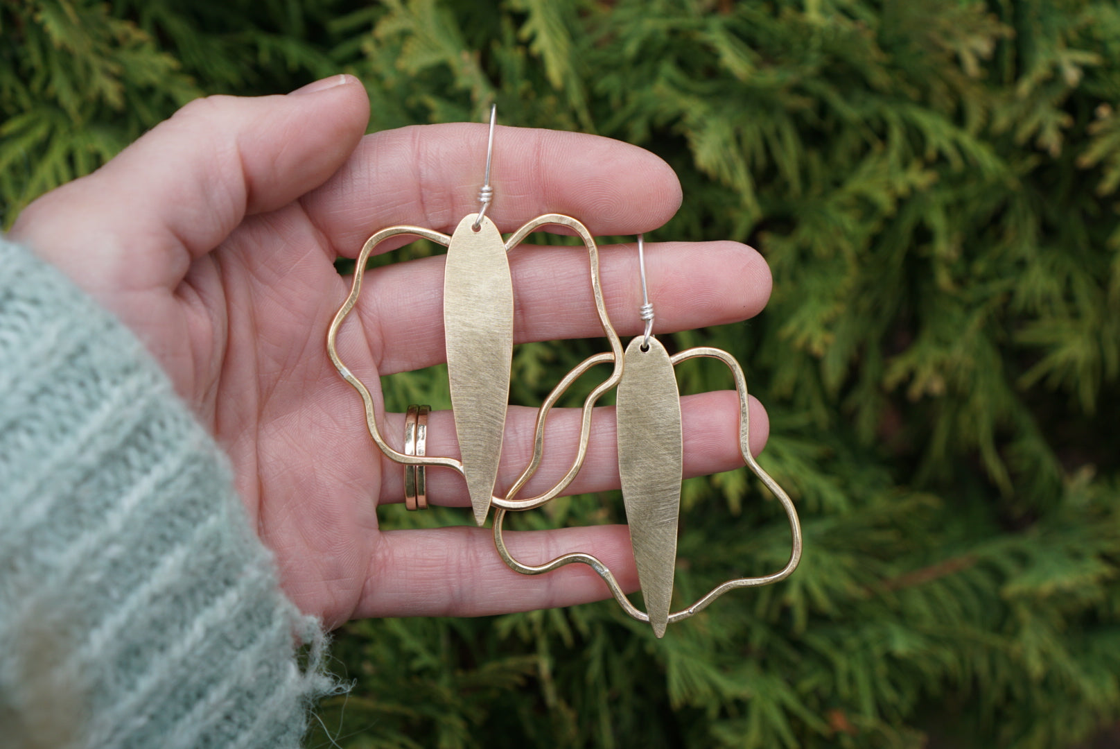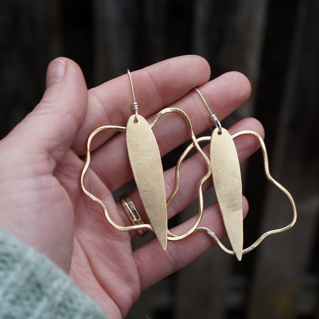 Big beautiful and interesting brass earrings made of organic shaped wobbly hoops and brass dagger shapes in the middle. They resemble Peace Lillies to me and give all the organic, feminine vibes. Finished with handmade earwires. These earrings measure about 2.75 inches in length.