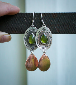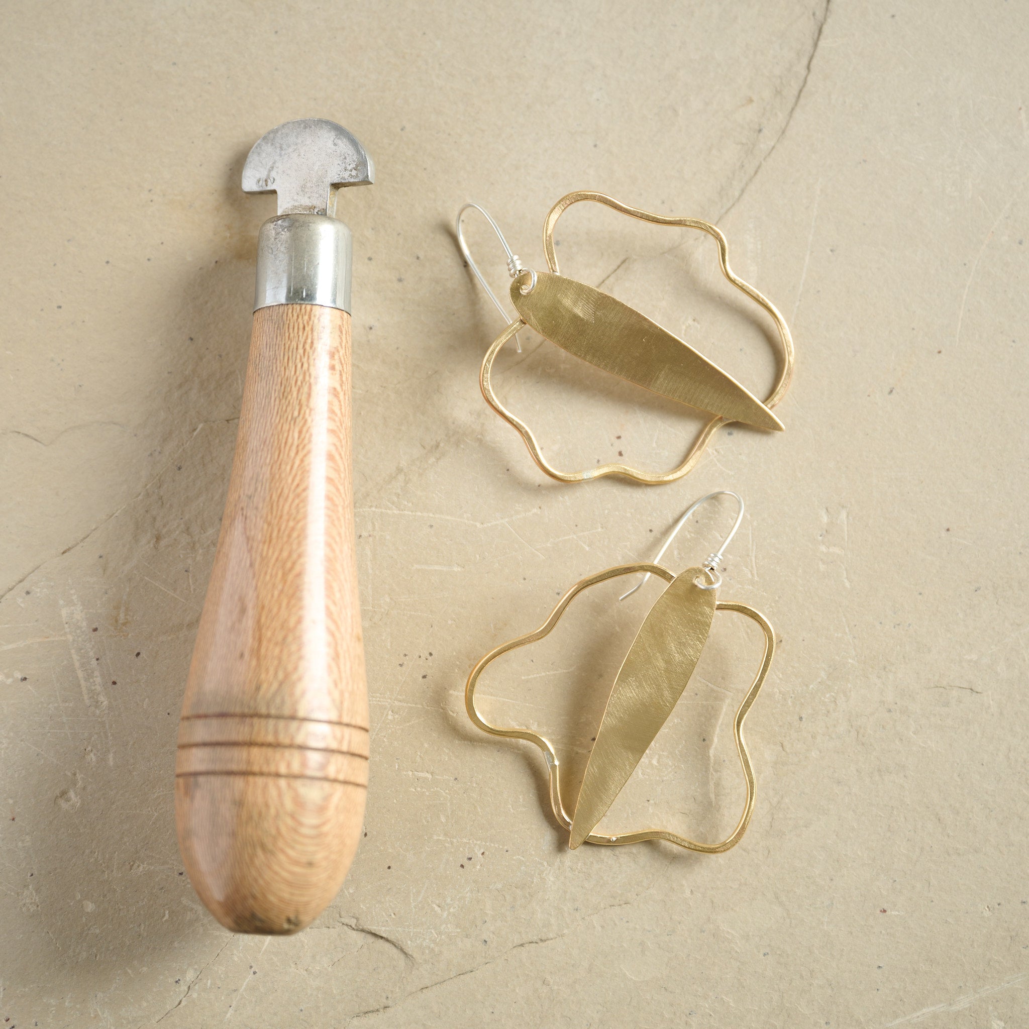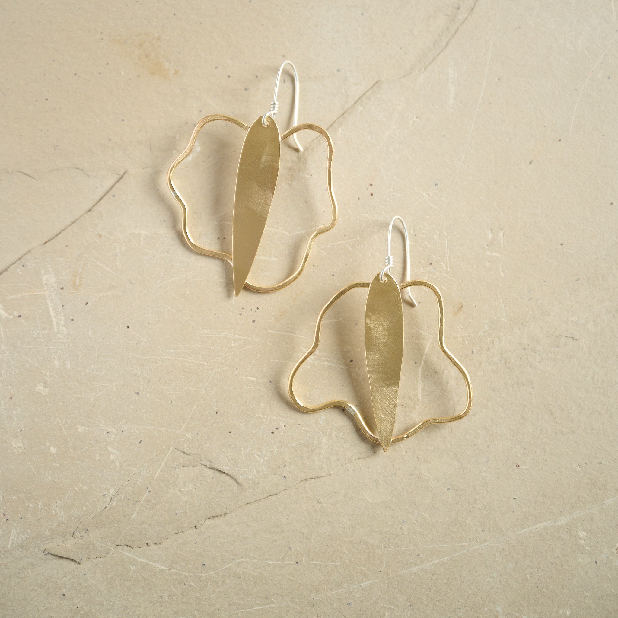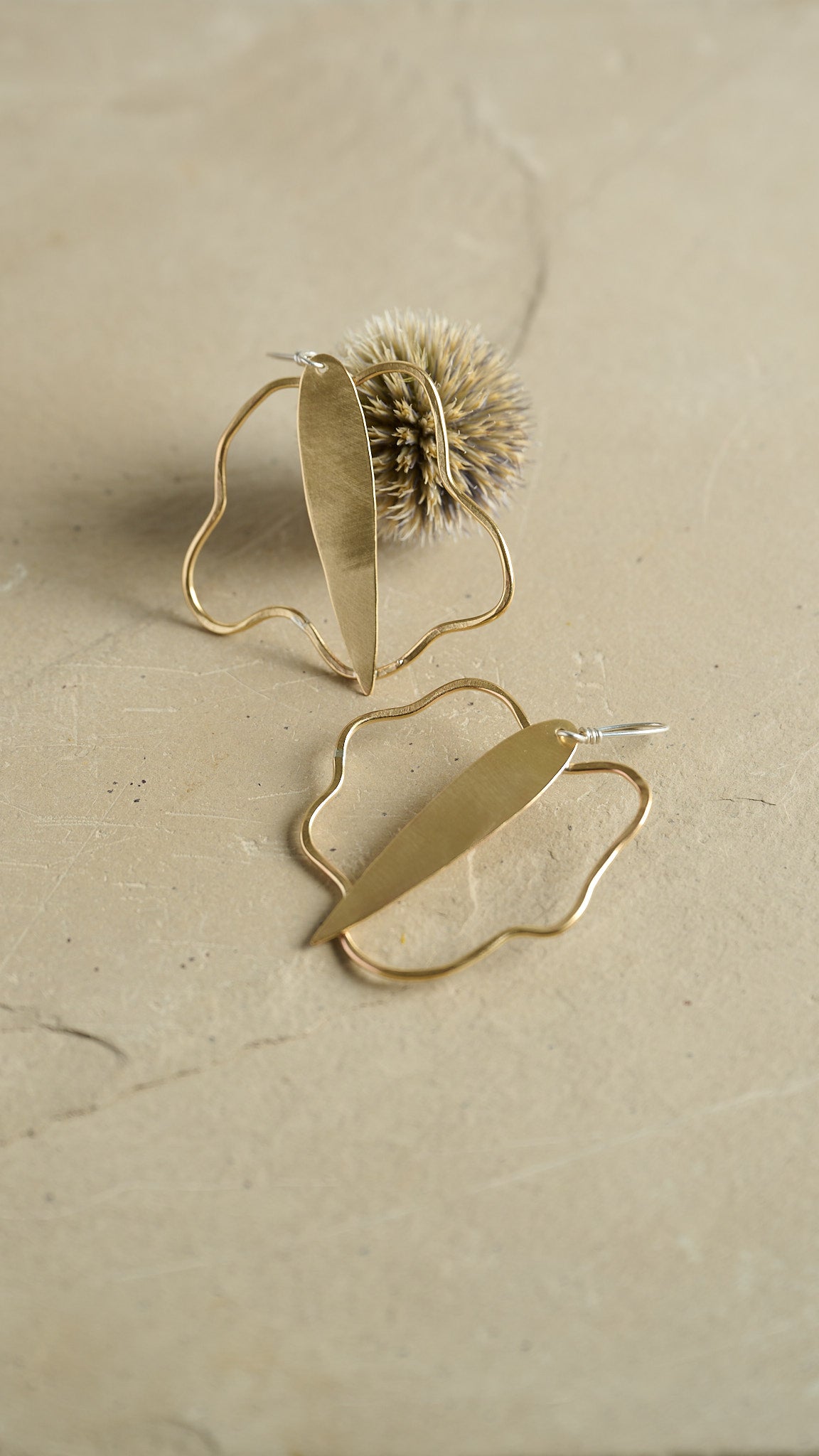 Big beautiful and interesting brass earrings made of organic shaped wobbly hoops and brass dagger shapes in the middle. They resemble Peace Lillies to me and give all the organic, feminine vibes. Finished with handmade earwires. These earrings measure about 2.75 inches in length.