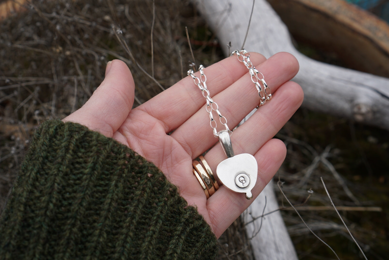 A wonderfully simple necklace and perfect for the everyday, this beauty features a rose cut mother of pearl shell set in silver with a little brass ball detail at the bottom. A unique and chunky bail completes the look. The pendant hangs from a sturdy medium thickness oval rolo chain with lobster clasp and measures 16 niches long.