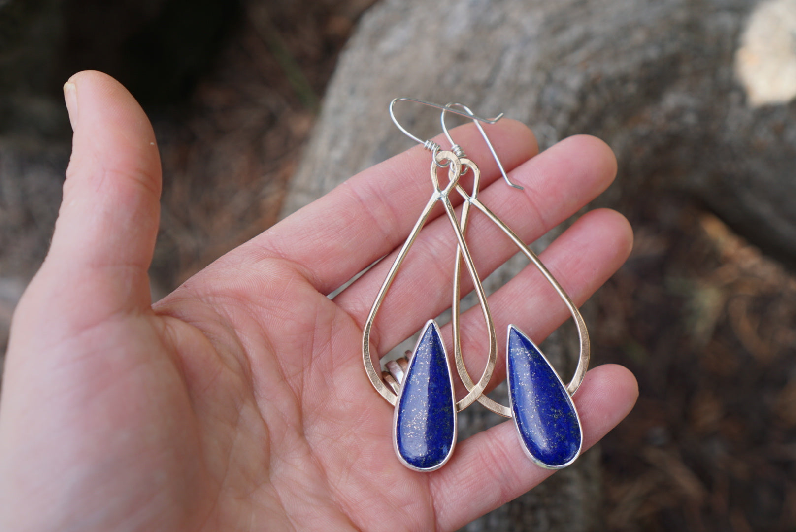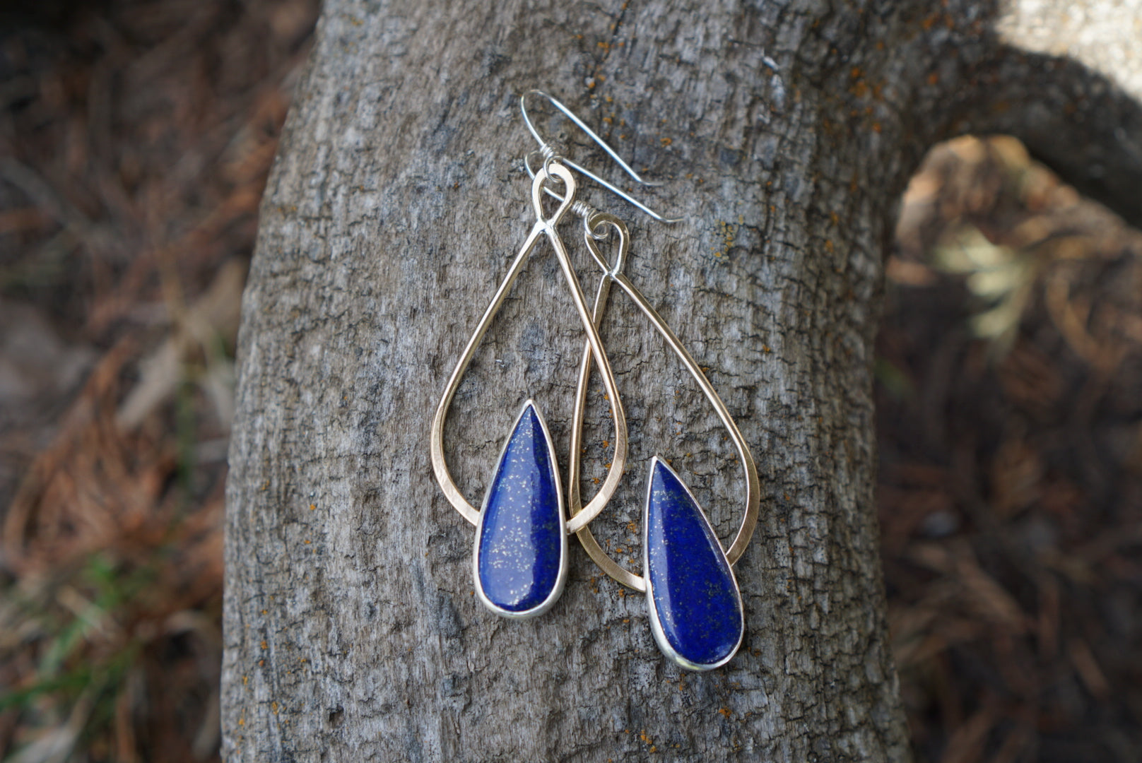 Classics!! Beautiful big hunks of Lapis Lazuli are simply set in fine silver and nestled at the base of large 14K Goldfill handmade raindrop shaped loops. Earrings dangle from handmade sterling silver earwires. Earrings measure just about 3.25 inches in length from the top of the earwires to the base of the earring.