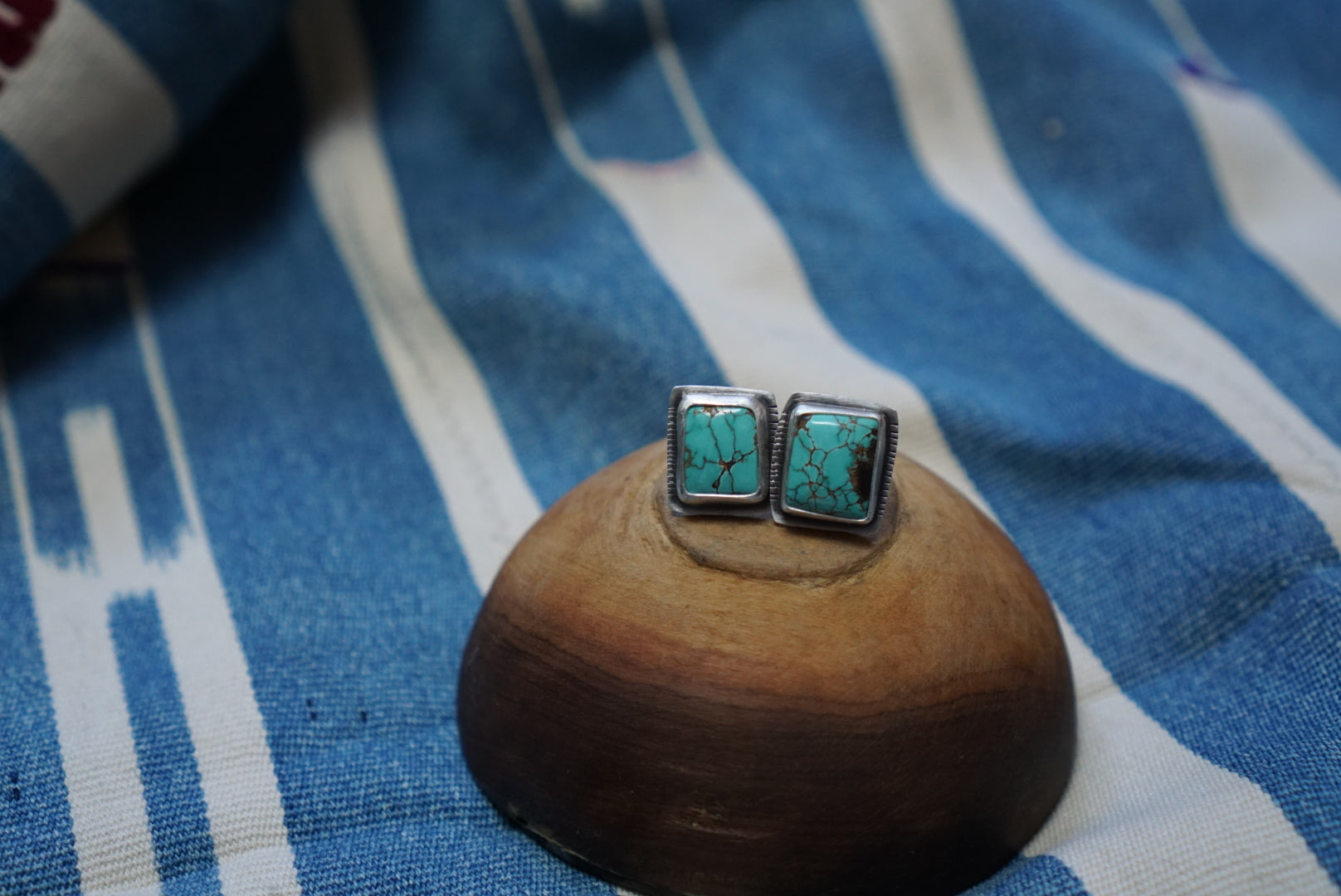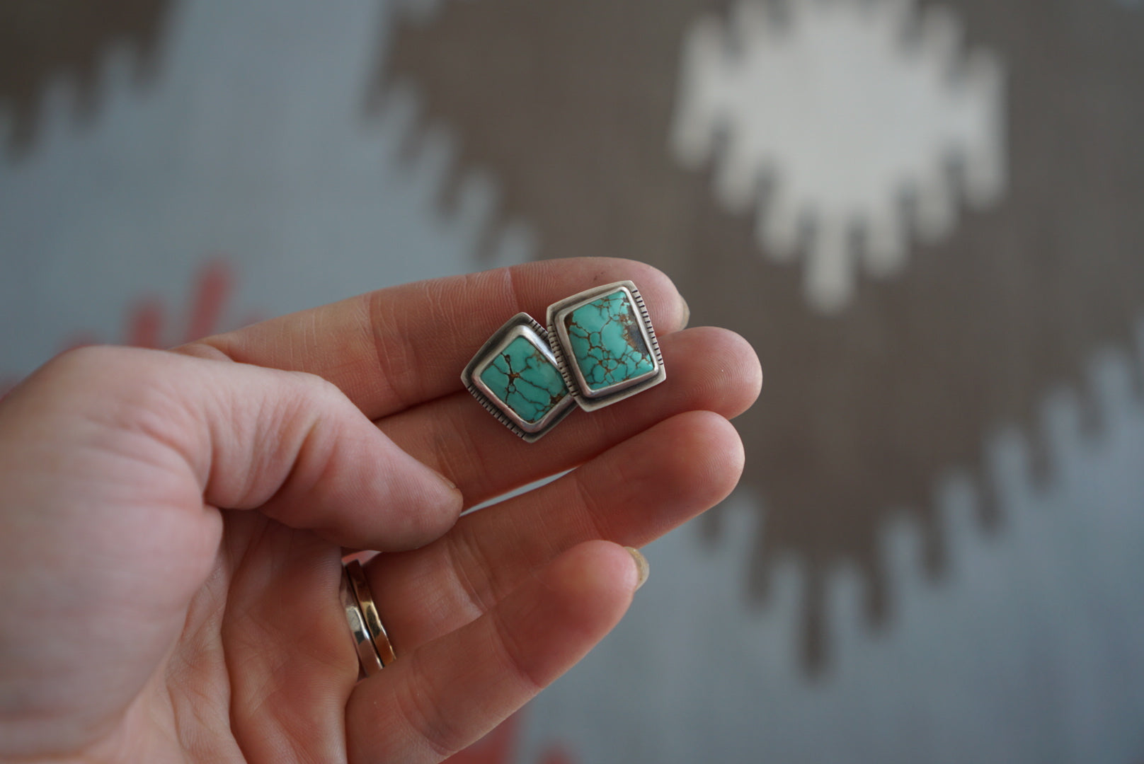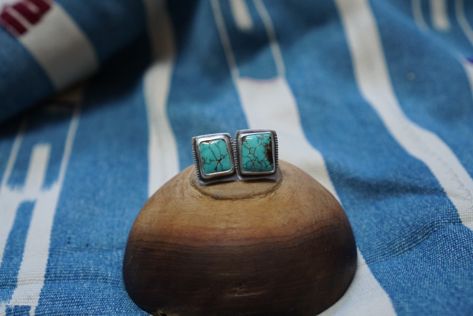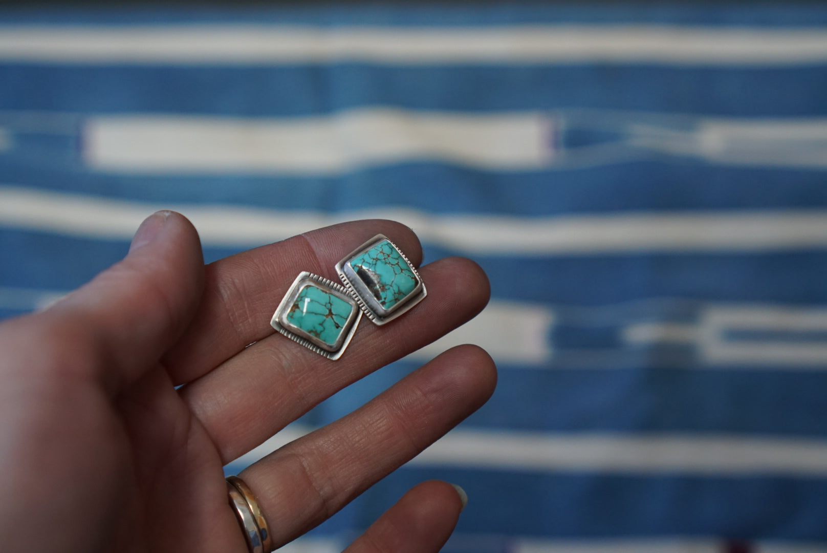 The perfect everyday statement posts. Fantastic slices of square American mined Turquoise are simply set in thick Sterling Silver with hand stamped details along the edge. Posts are sturdy and comfortable and finished with sterling silver earnuts. Earrings are oxidzed and polished for a soft rustic finish.