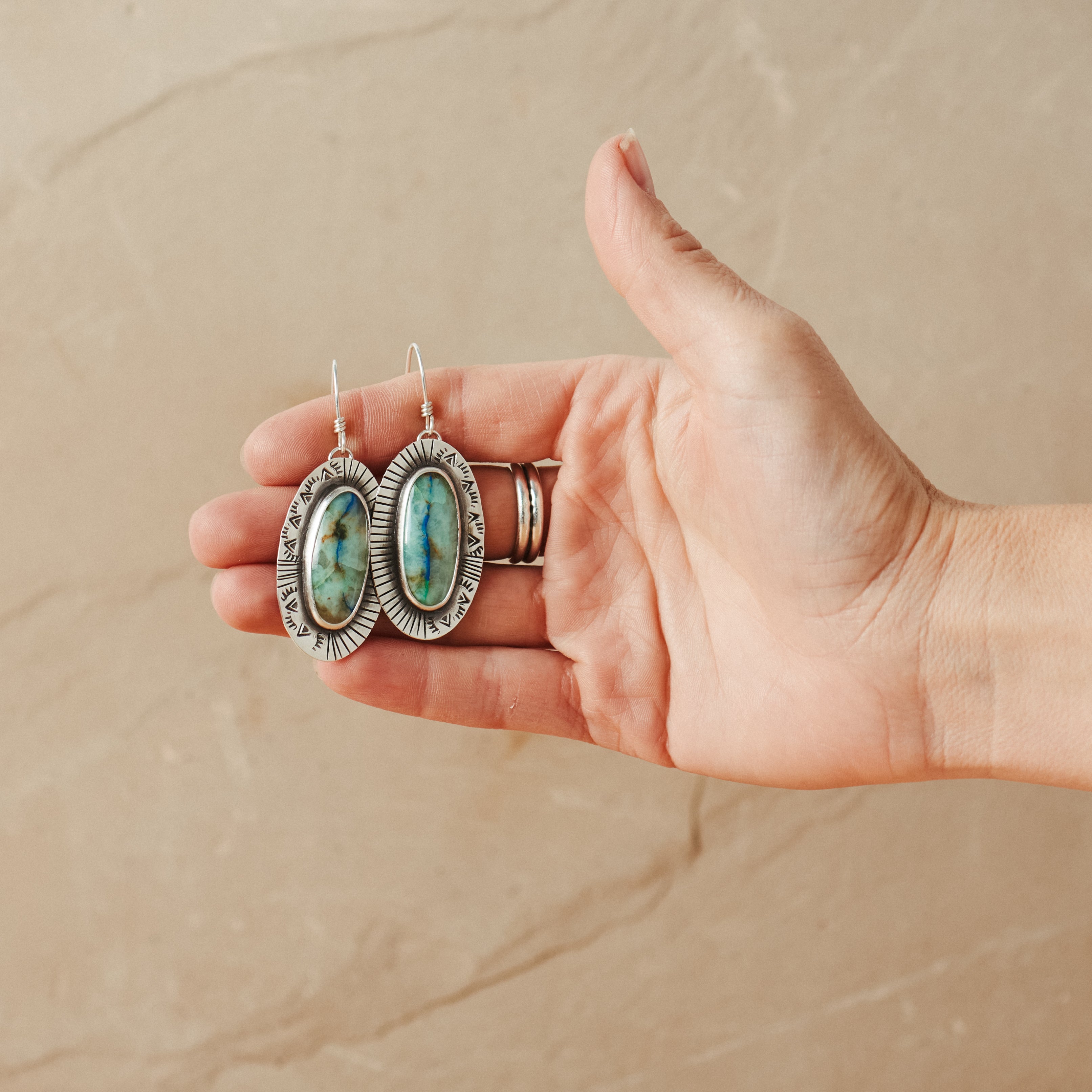 These beautiful earrings are great for everyday. They feature slices of ribbon Azurite stones wrapped in silver and perched on silver discs with hand stamping and sunburst detail around the setting. Finished with sterling silver handcrafted earwires and hang about 2.5 inches in length.