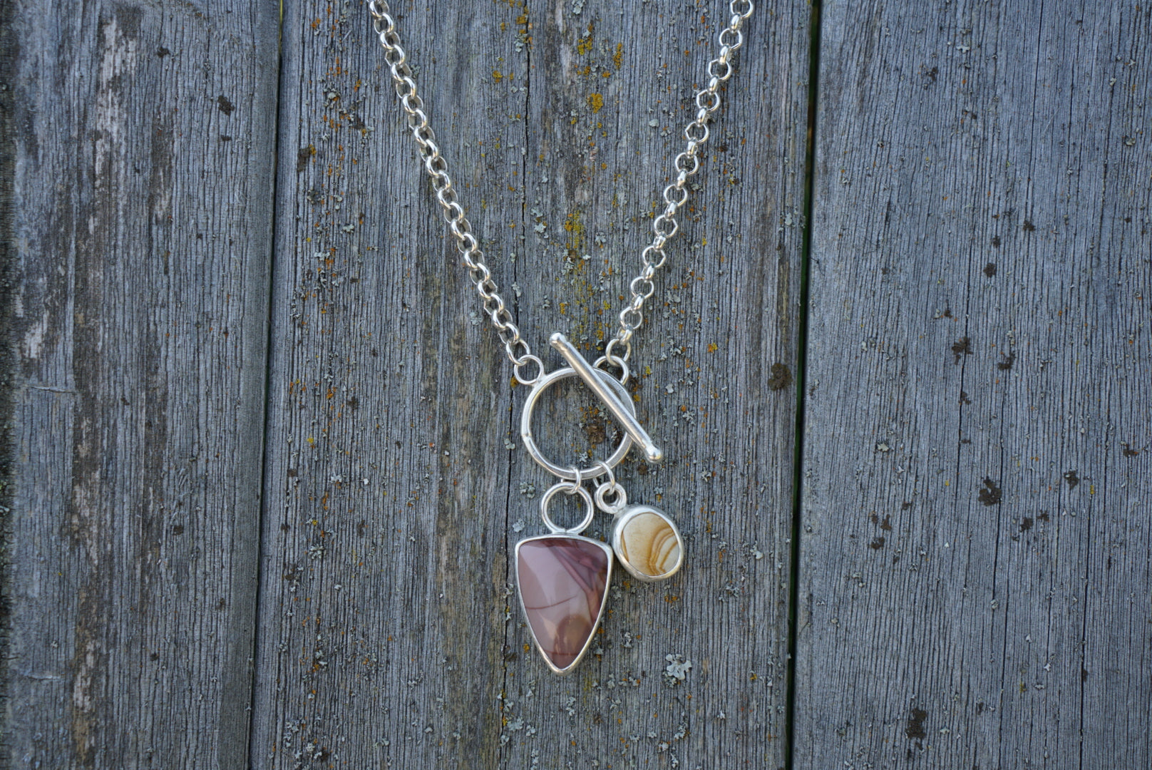 An amazing and eye catching necklace featuring gorgeous pendants of slices of Imperial Jasper and Montana Wonderstone wrapped in sterling silver. This necklace is complete with a handmade front securing toggle clasp and chunky sterling silver Rolo Chain. Measures 16 inches in length and is perfect worn solo or layered with other necklaces!
