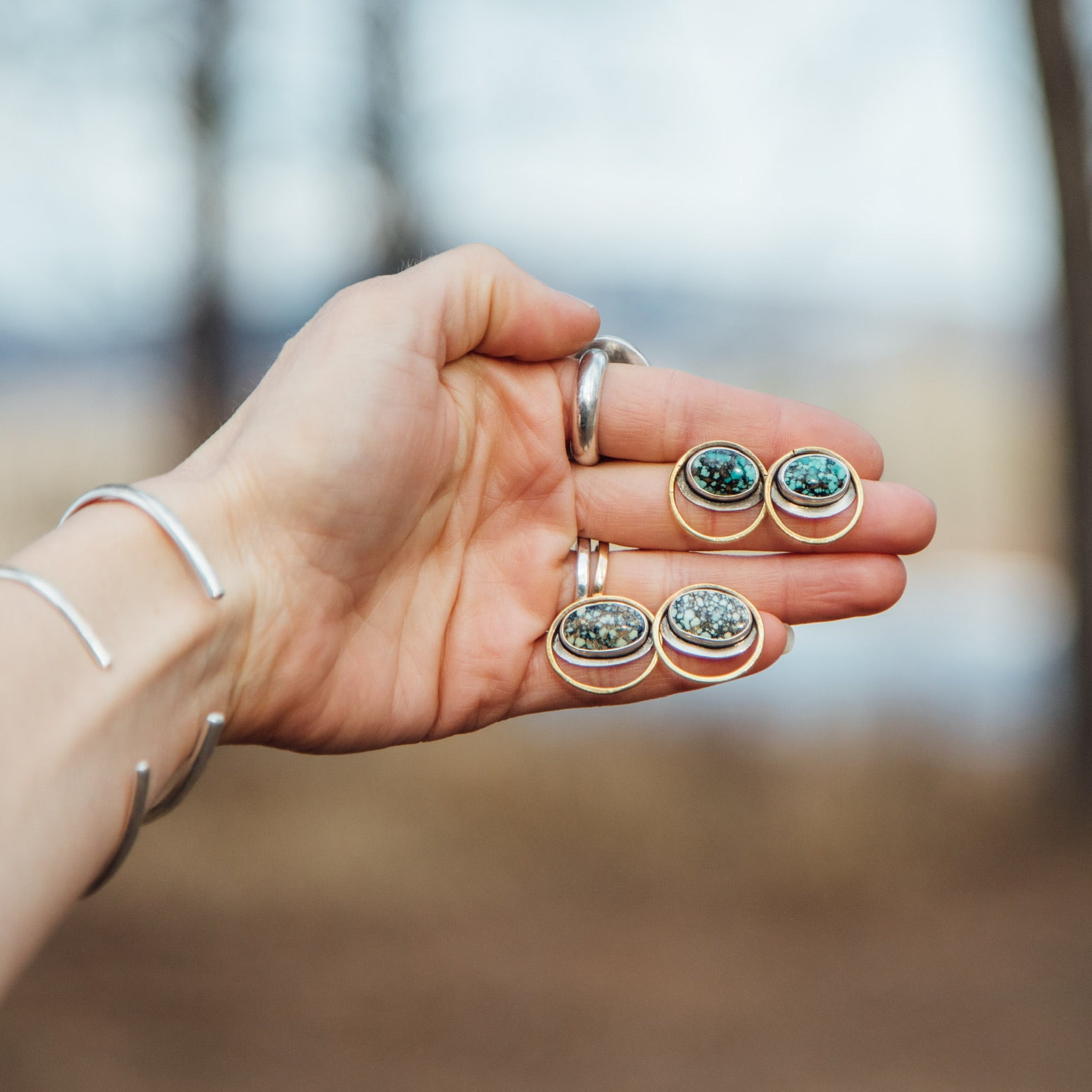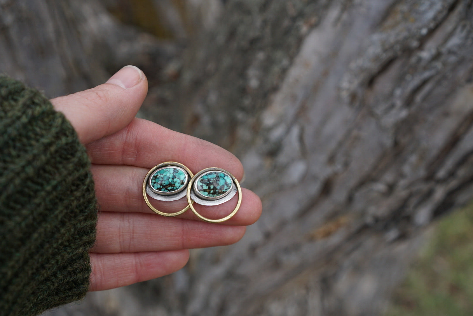 Gorgeous little mixed metal posts perfect and comfortable for the everyday. Made with fantastic pieces of Blue Moon turquoise that are simply set in sterling silver with hand formed and hammered brass hoops looped around the edge like a ring around Saturn. Simple enough to wear with everything, but interesting enough to make a statement.