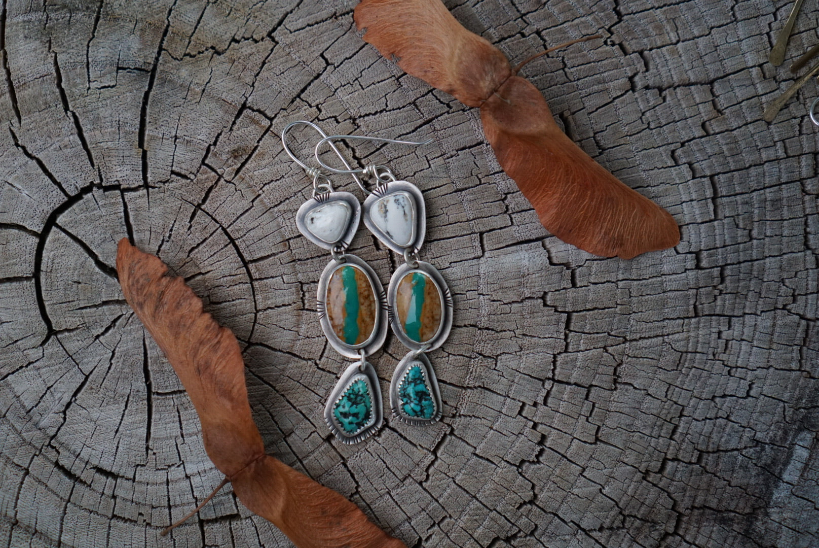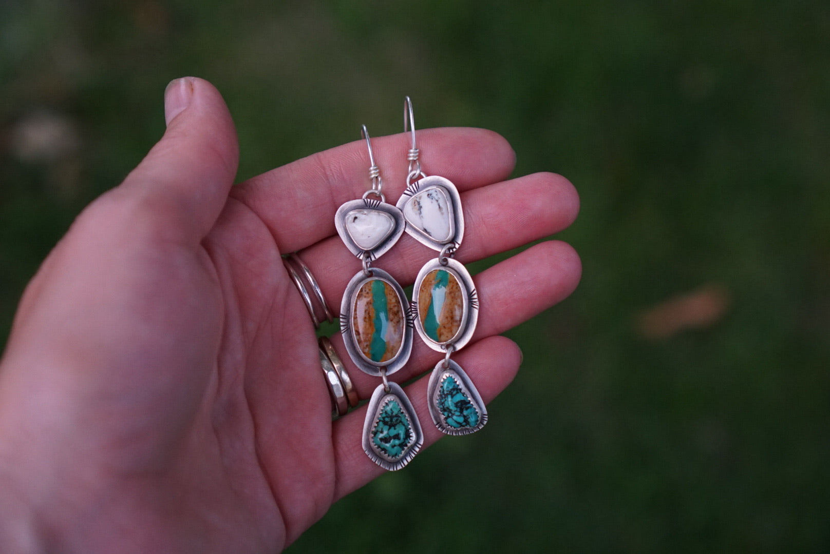 Stunning multi stone earrings featuring White Buffalo, Royston Ribbon Turquoise, and Alacron Nugget Turquoise all simply set in recycled sterling silver, connected together and dangling for lots of beautiful movement. Earrings are completed with handmade sterling silver earwires and dangle about 3.25 inches in length.