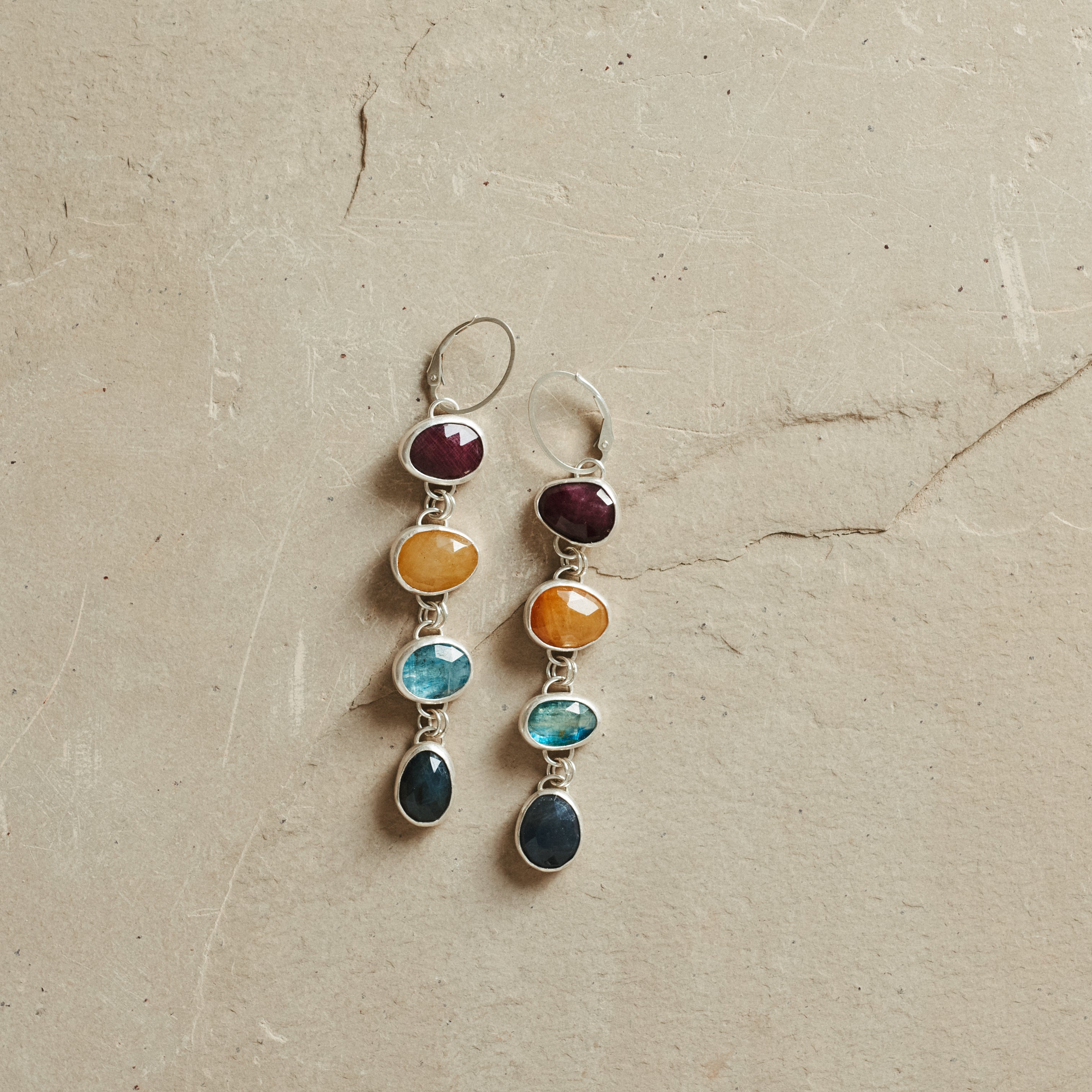 Stunning multi stone earrings featuring four different shades of rose cut Sapphires all simply set in recycled sterling silver, connected together and dangling from oval shaped sterling silver lever back earwires. Earrings dangle about 3.25 inches in length.