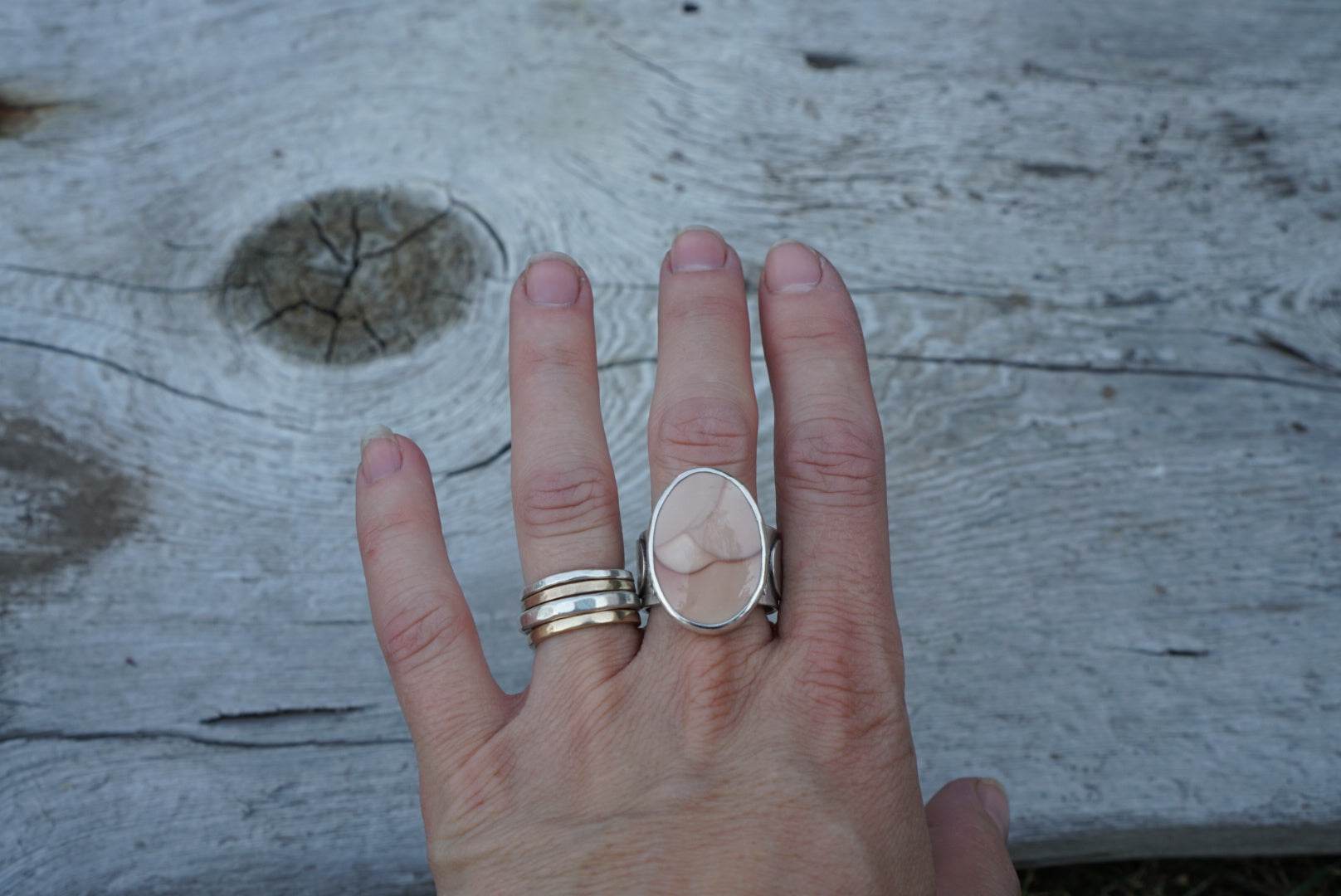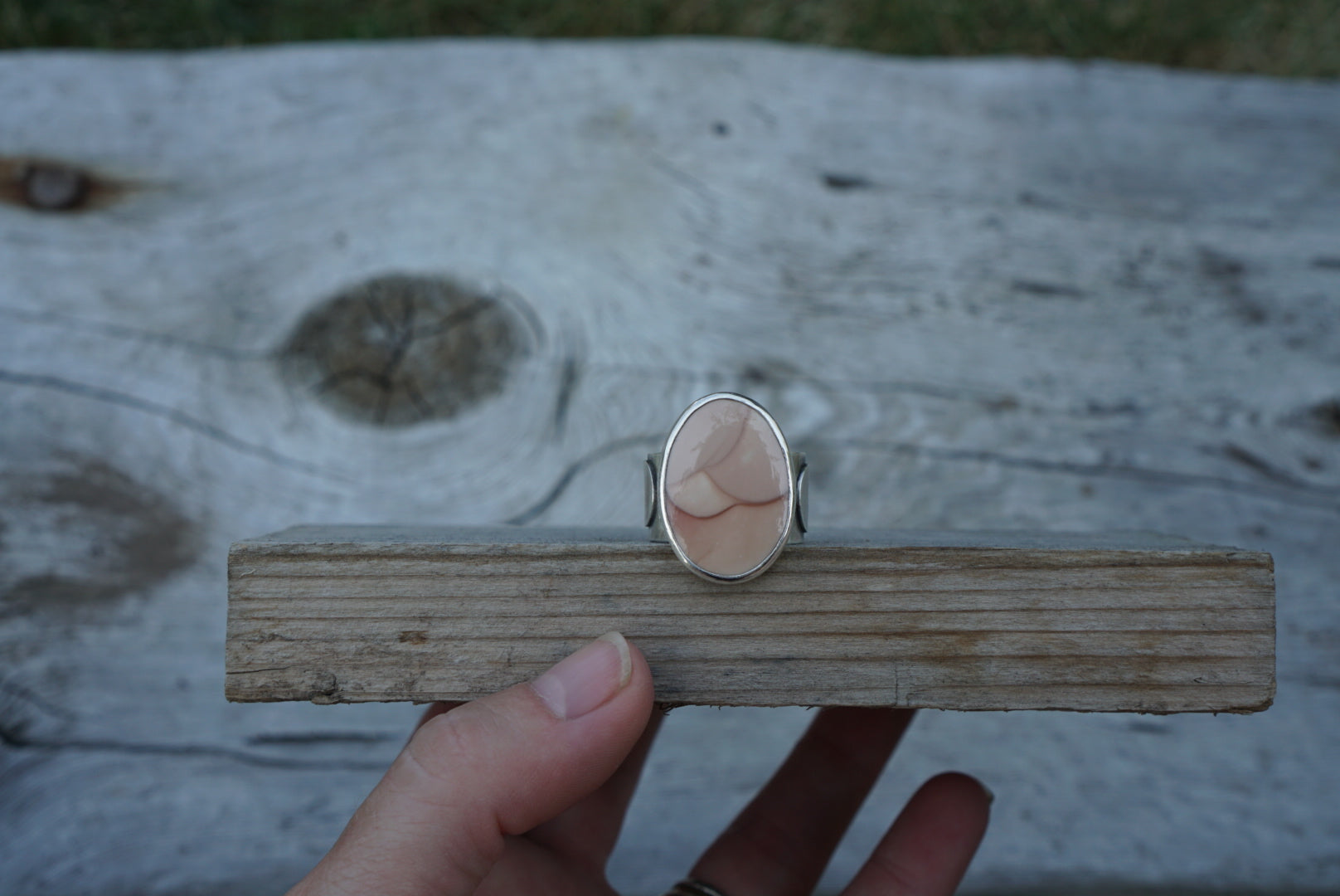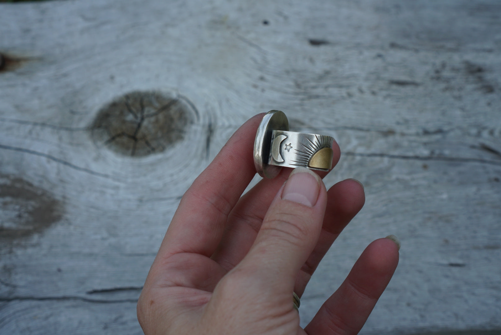 This lovely statement ring is made with an incredible cut of swirly pink Willow Creek Jasper. This ring is simple yet stunning. Featuring a completely hand crafted, incredible Sun, Moon and Stars ring band. The ring band is wide and measures about .5 inches tall. Ring measures a size 9.5 but would best fit a 9 because of its height.