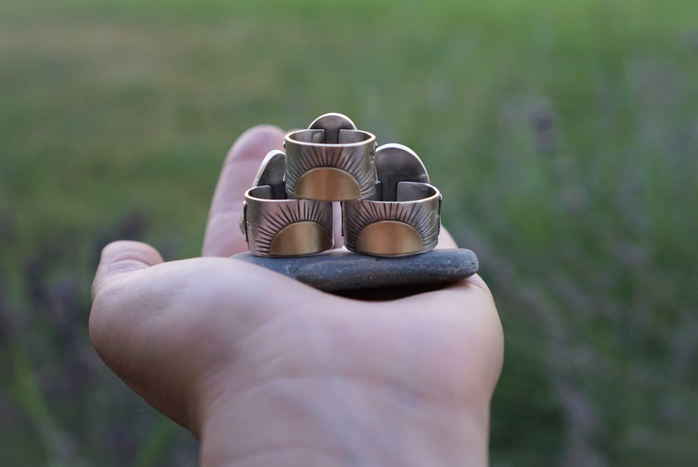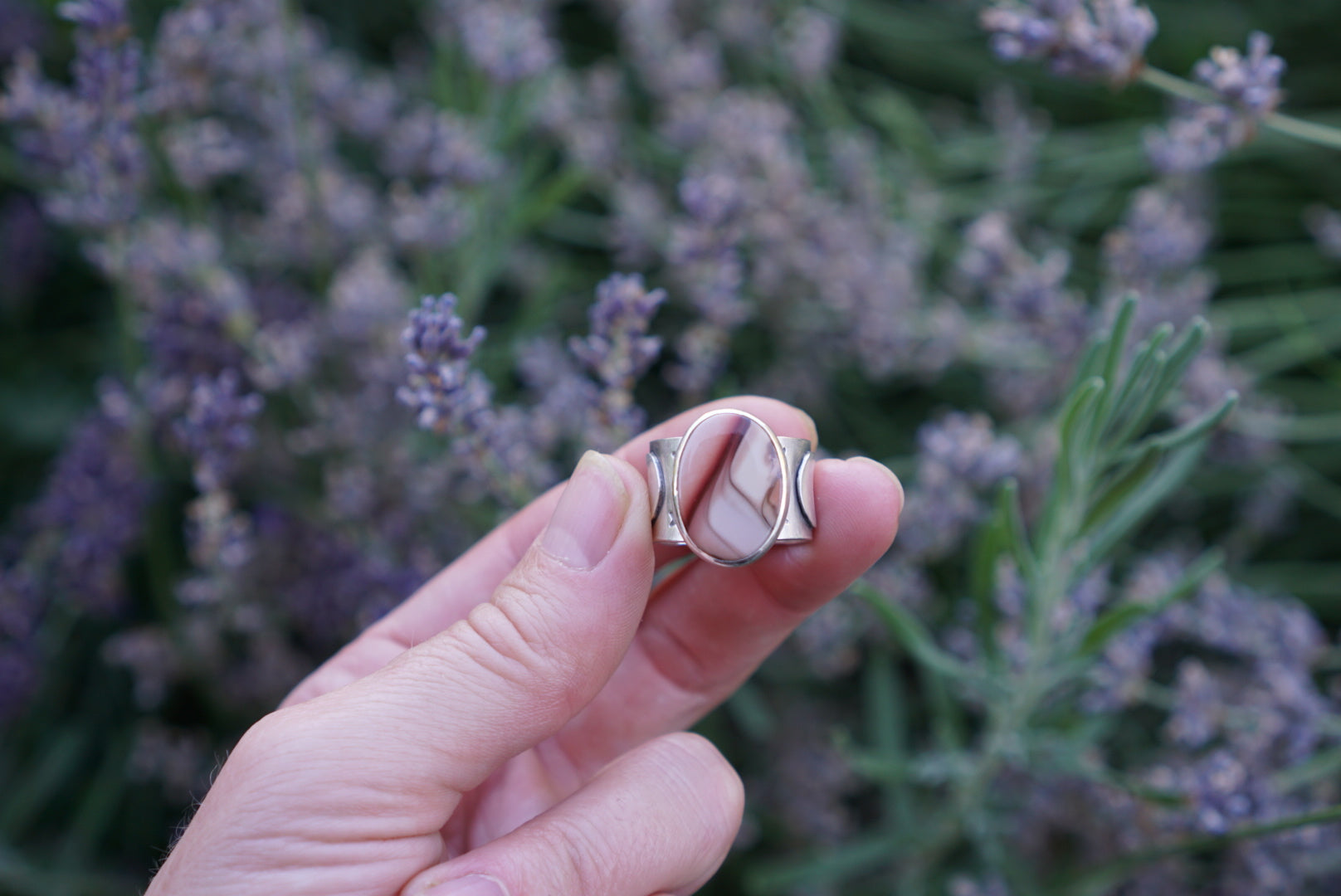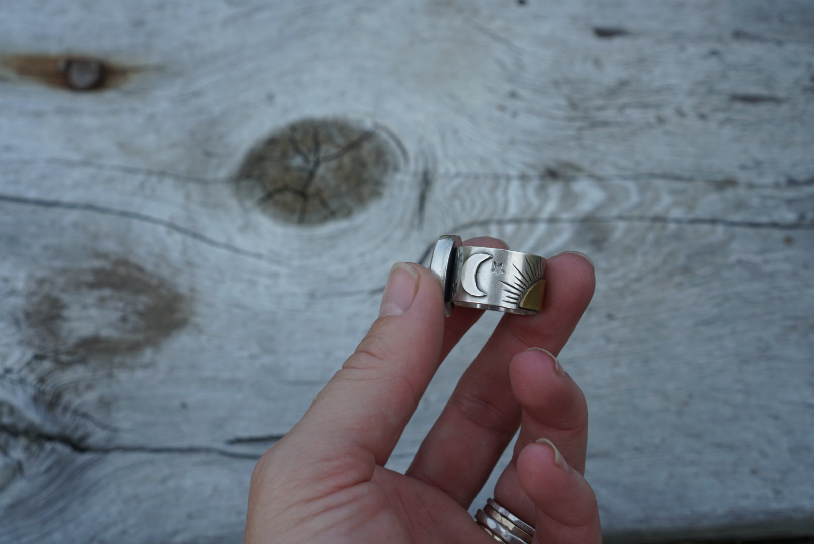 This lovely statement ring is made with an incredible cut of swirly pink Willow Creek Jasper. This ring is simple yet stunning. Featuring a completely hand crafted, incredible Sun, Moon and Stars ring band. The ring band is wide and measures about .5 inches tall. Ring measures a size 7.5 but would best fit a 7 because of its height.