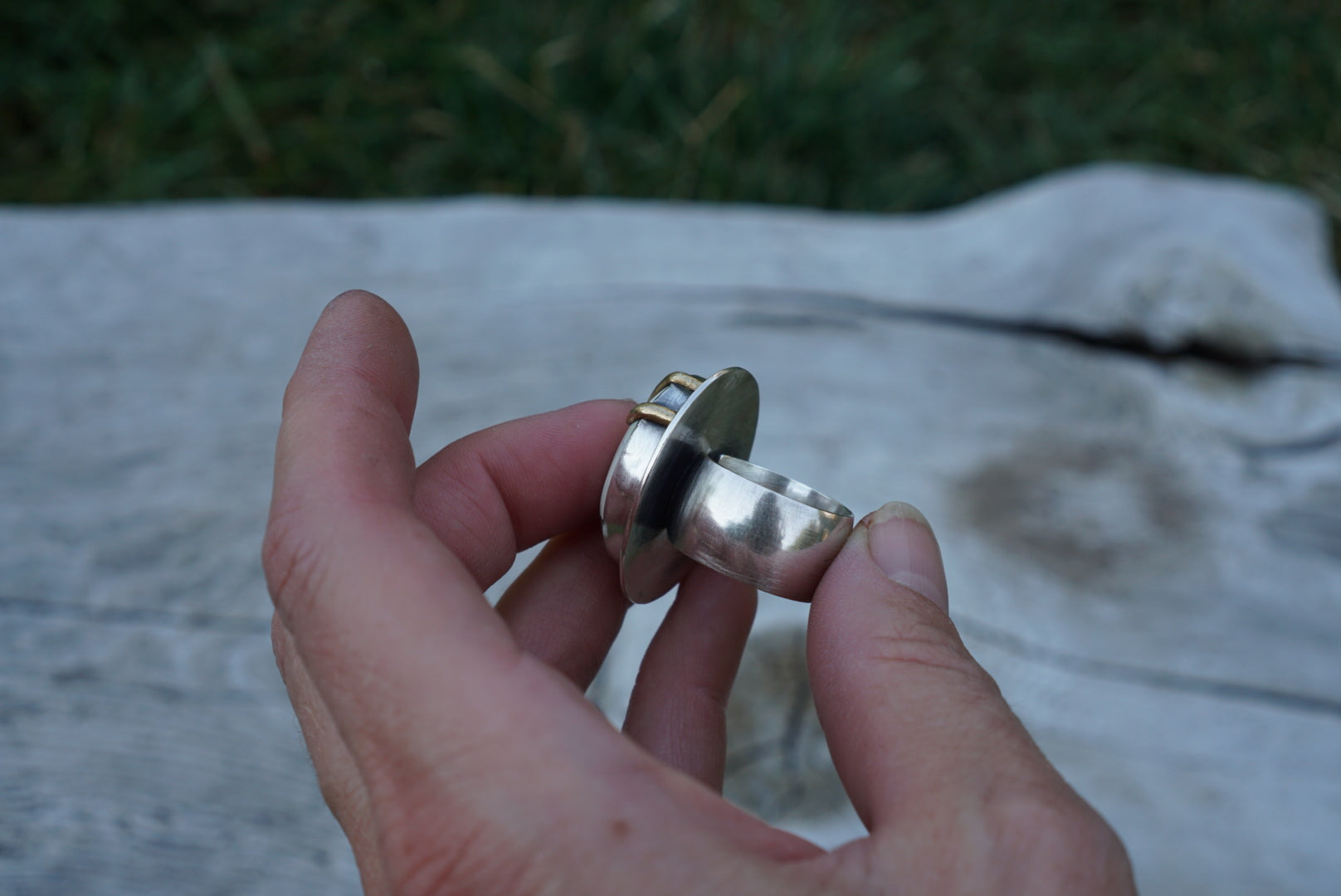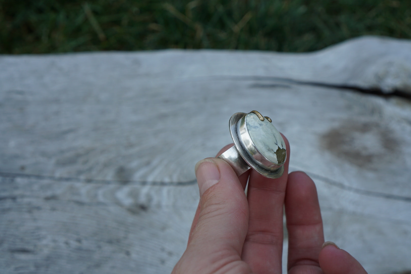 This lovely statement ring is made with an incredible cut of creamy Ivory Creek Variscite. This ring is simple yet stunning. Featuring a domed ring band and a simple setting with two brass accent prongs gripping the stone. The ring band is wide and measures about .5 inches tall. Ring measures a size 6.5 but would best fit a 6 because of its height.