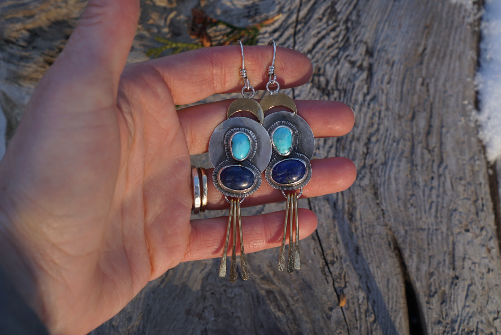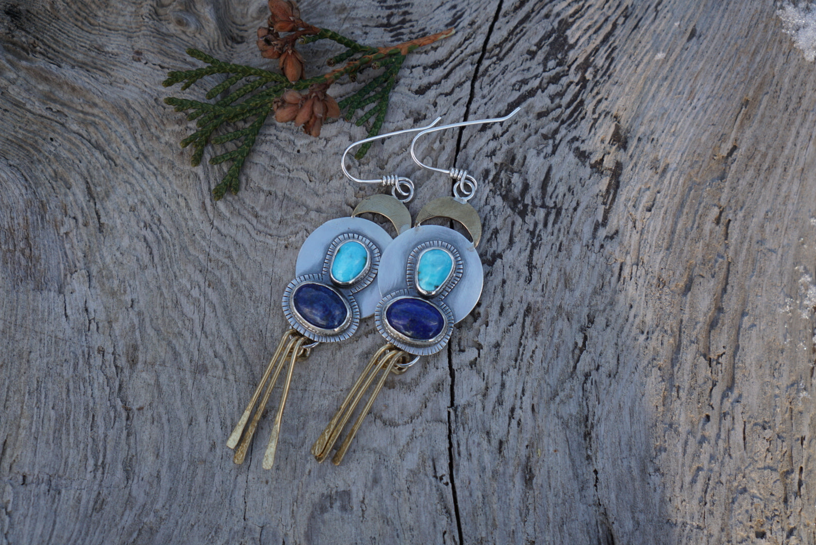 Gorgeous disc earrings featuring pretty little blue Kingman Turquoise and deep blue Lapis Lazuli gemstones set and layered on top with hand stamping along the backplate. Completed with brass crescent moons perched on top and hand formed brass fringe dangling below. Fit for a Queen. These are hand textured and are extra rustic in certain spots. Earrings measure just about 3.5 inches long. Earrings hang from hand crafted earwires and are oxidzed and polished for a soft rustic finish.