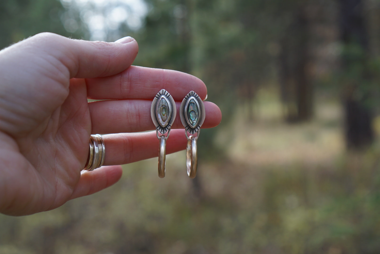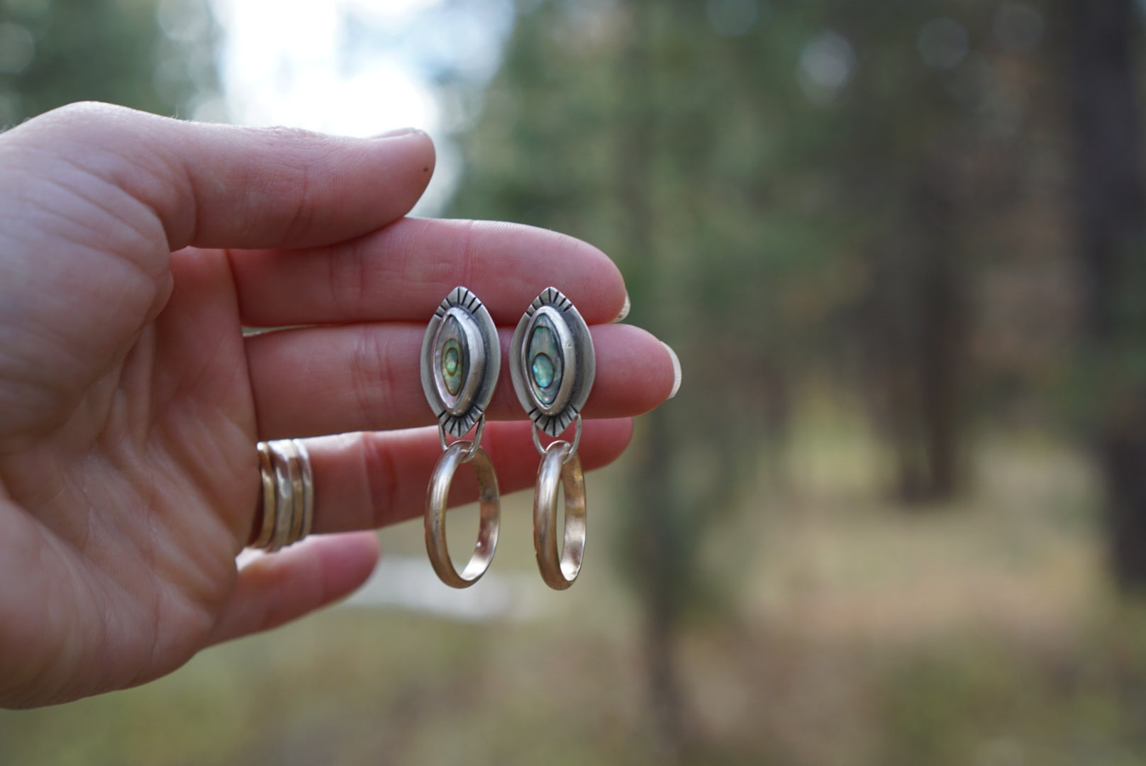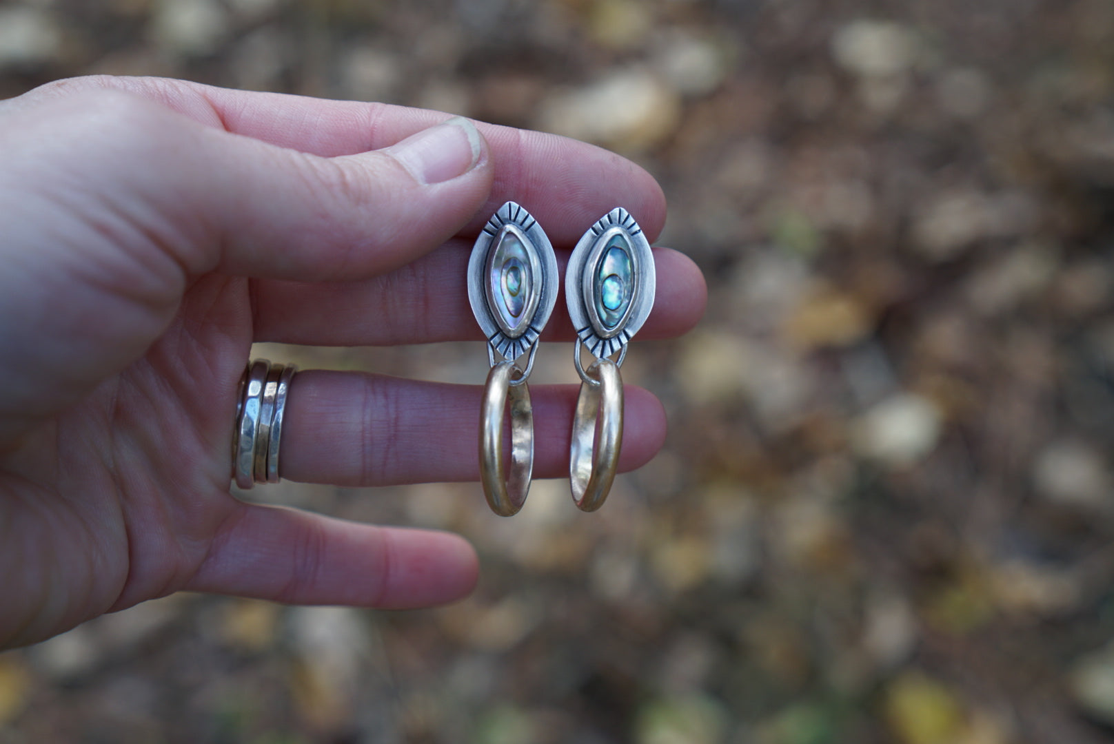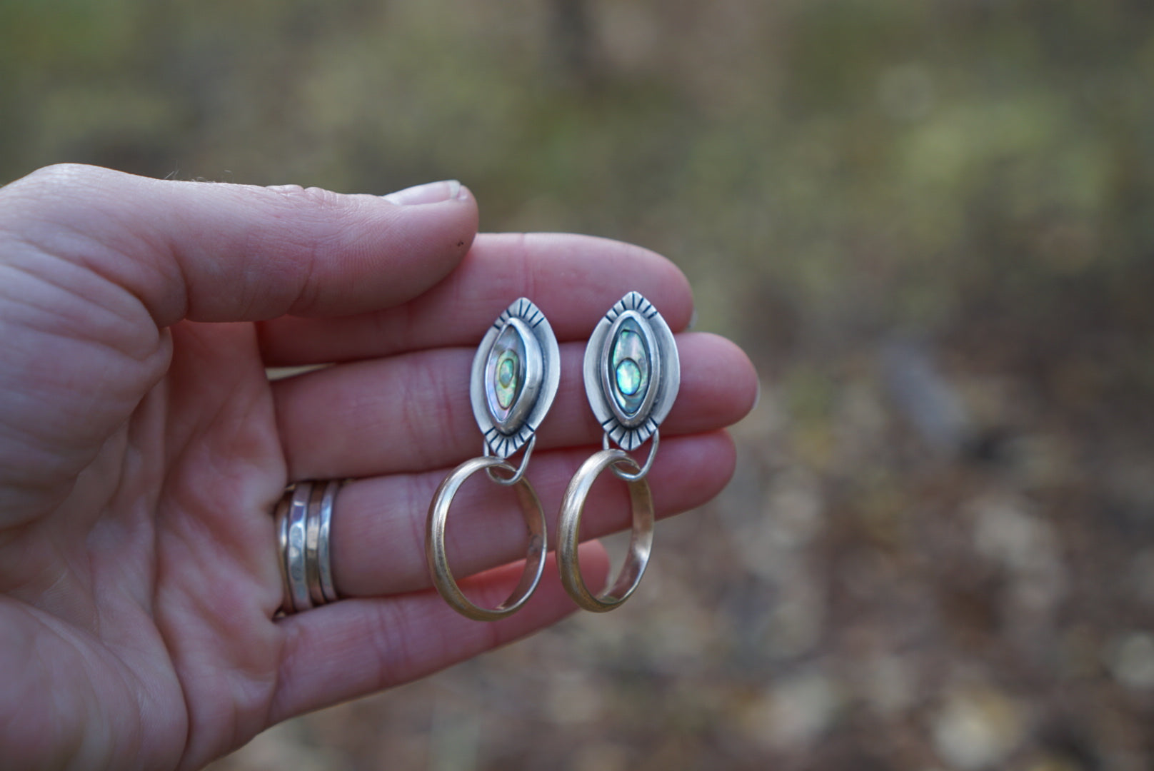 I'm obsessed with these little mixed metal post hoops. This pair features GORGEOUS shimmering Abalone set in sterling silver with 14k Goldfill Hoops looped underneath, Finished with hand stamping, sterling silver posts and comfort earnuts. These measure about 1.75 inches from top to bottom.