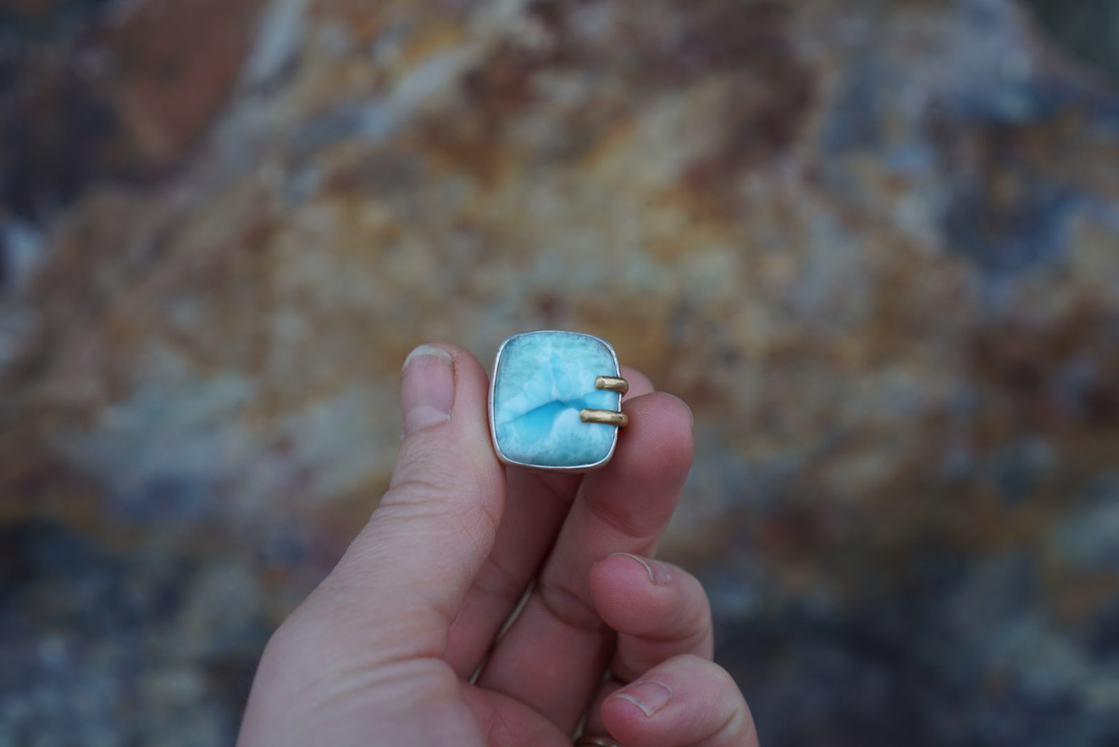 A beautiful thick hunk of raw ocean blue Larimar is simply set in reclaimed and recycled sterling silver with two brass talon claws gripping the right side. Finished with a chunky half round ring band. Rustic glowing finish. This ring best fits a size 6.25.