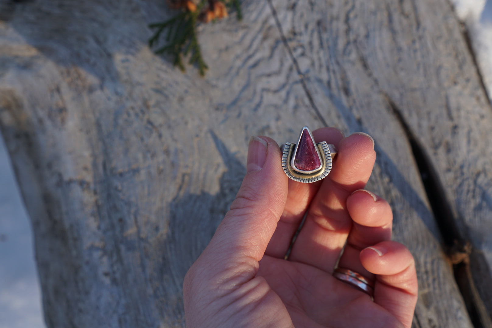 This gorgeous little everyday ring is made with a beautiful teardrop shaped slice of all natural purple/maroon Spiny Oyster Shell. This is a natural shell so small inclusions in the surface are to be expected. The stone is nestled inside sterling silver and completed with a brass loop and sterling silver sunburst detailing at the base. Perched on a unique thick and sturdy triangle ring band and oxidized and polished for a soft rustic finish. This ring best fits a size 6.