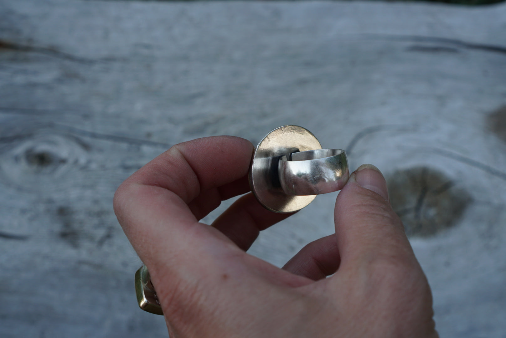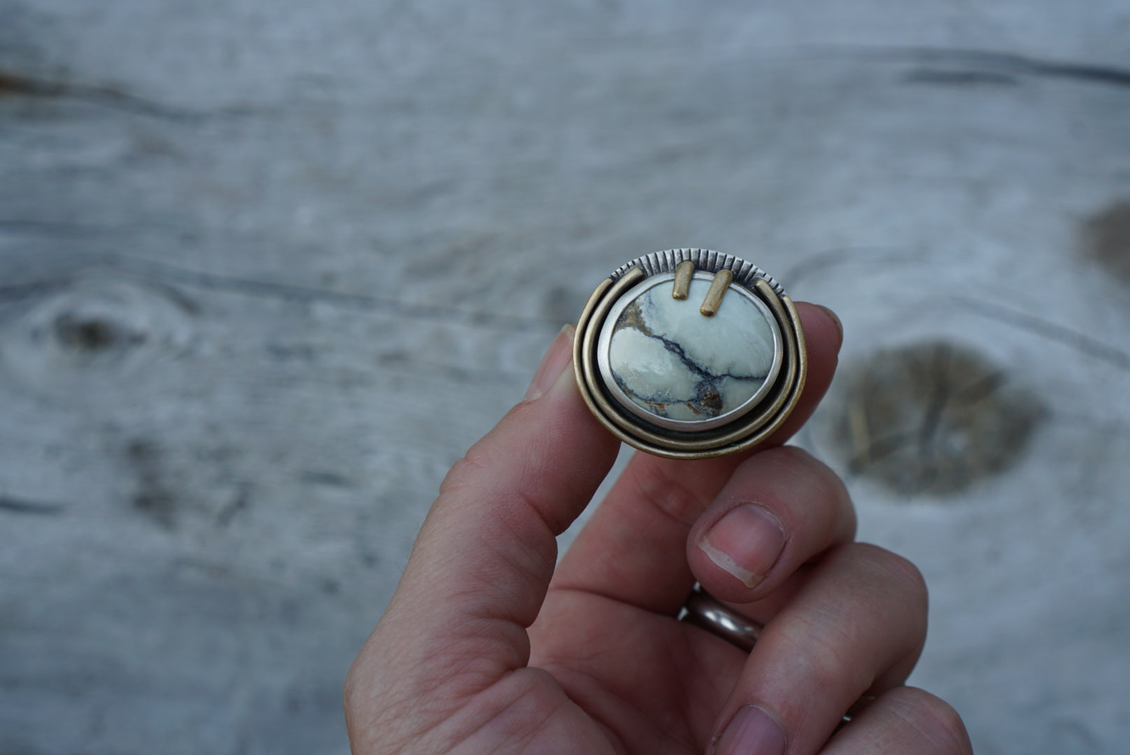 This lovely statement ring is made with an incredible cut of creamy Ivory Creek Variscite. This ring is stunning with brass accents framing the base of the stone. Featuring a domed ring band and a simple setting with two brass accent prongs gripping the stone. The ring band is wide and measures about .5 inches tall. Ring measures a size 8.25 but would best fit a 7.75 because of its height.