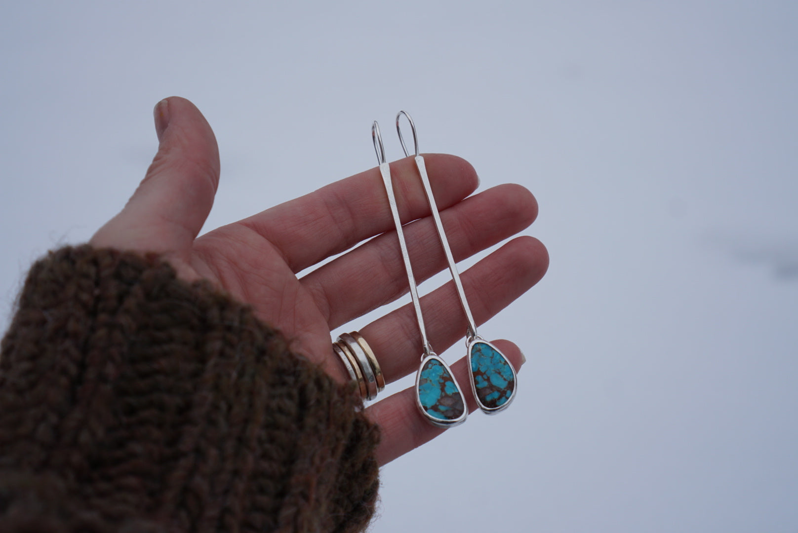 A classic design, perfect for everyday. Reclaimed and textured bars with perfectly complimenting turquoise gemstones set simply in sterling silver dangling below. Finished with handmade sterling silver threader earwires. Earrings dangle about 3.5 inches from the top of the earwire to the base of the stone. Light and comfy and perfect for the everyday.