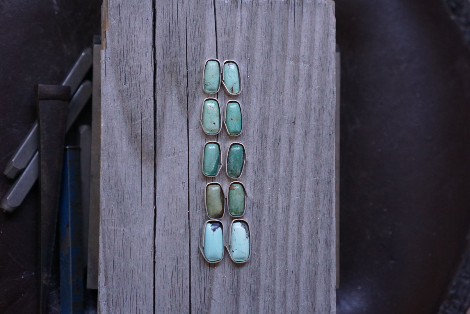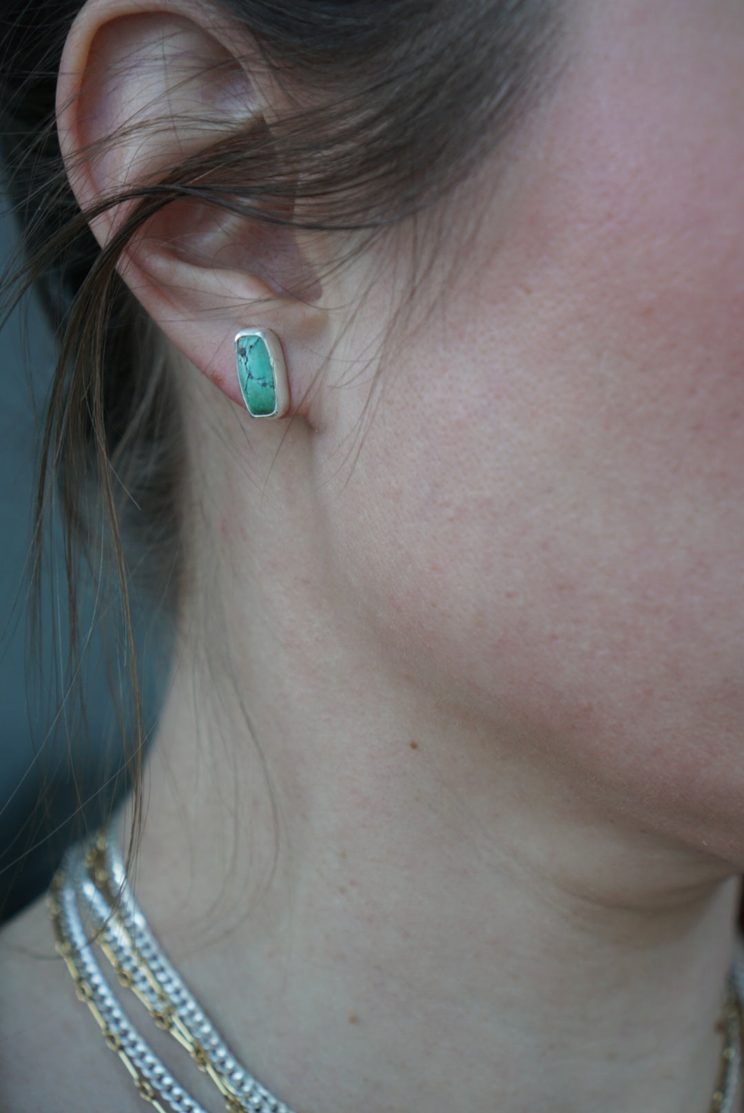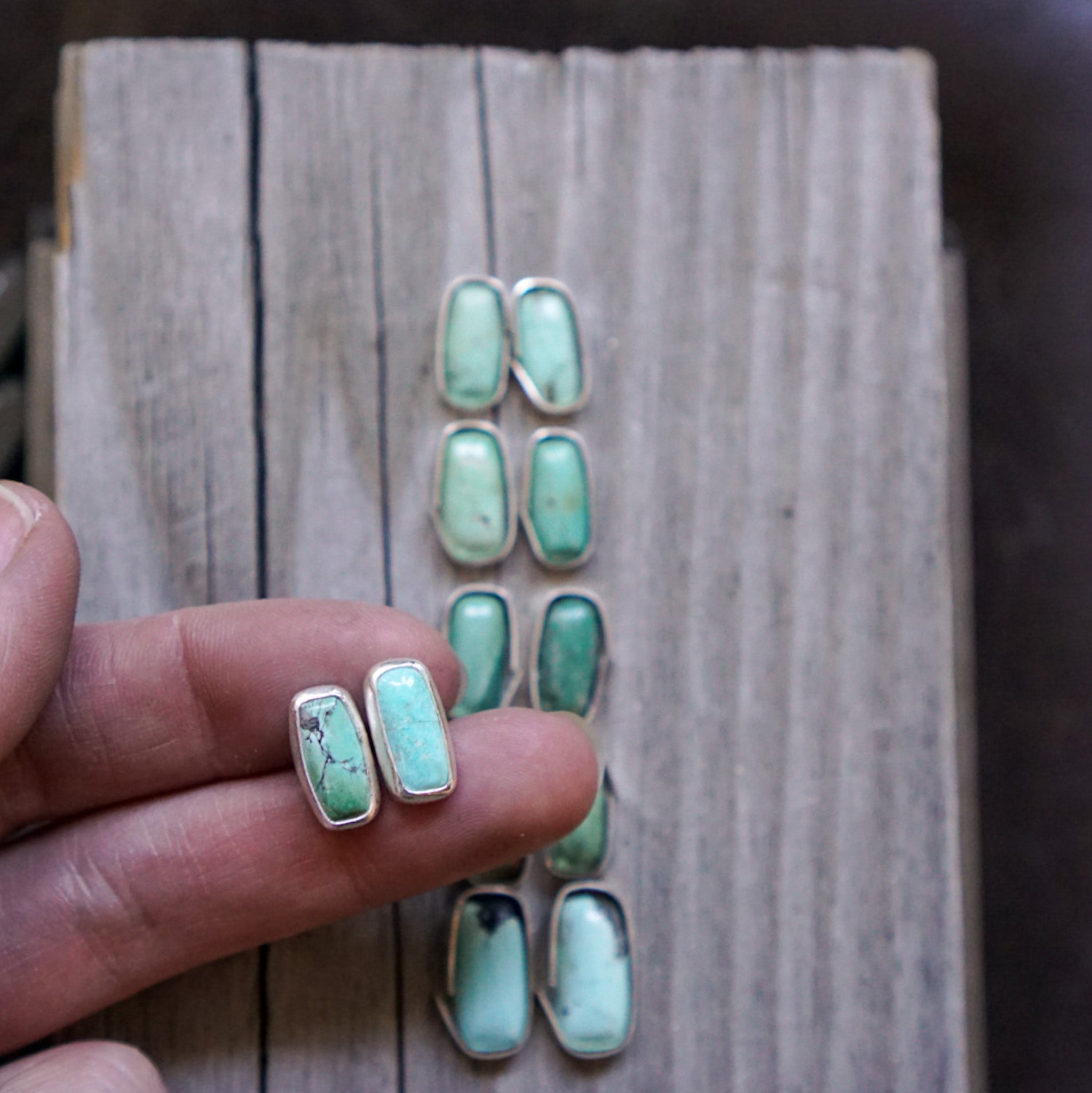 A classic design, perfect for everyday. Mini turquoise bars. Pale colored turquoise bars are simply set in sterling silver with sterling ear posts and earnuts. Pick your set.