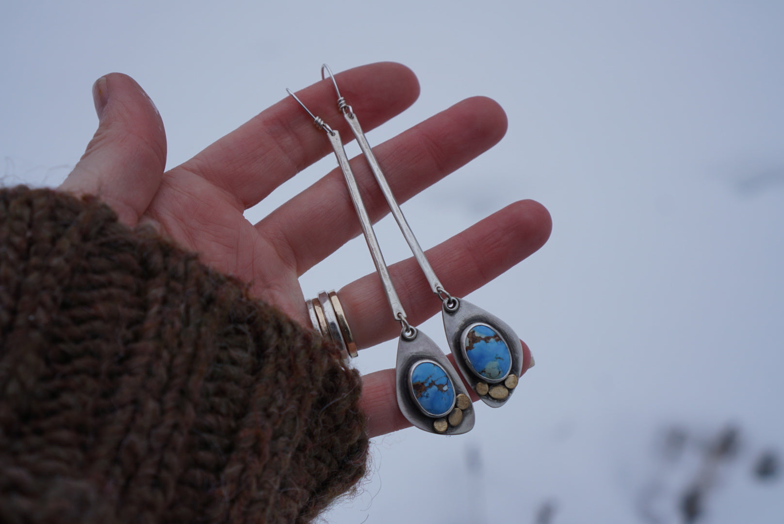 A classic design, perfect for everyday. Reclaimed and textured bars with perfectly complimenting Lavender Turquoise gemstones set simply in sterling silver with brass dot detail dangling below. Finished with handmade sterling silver earwires. Earrings dangle about 3.75 inches from the top of the earwire to the base of the stone. Light and comfy and perfect for the everyday.