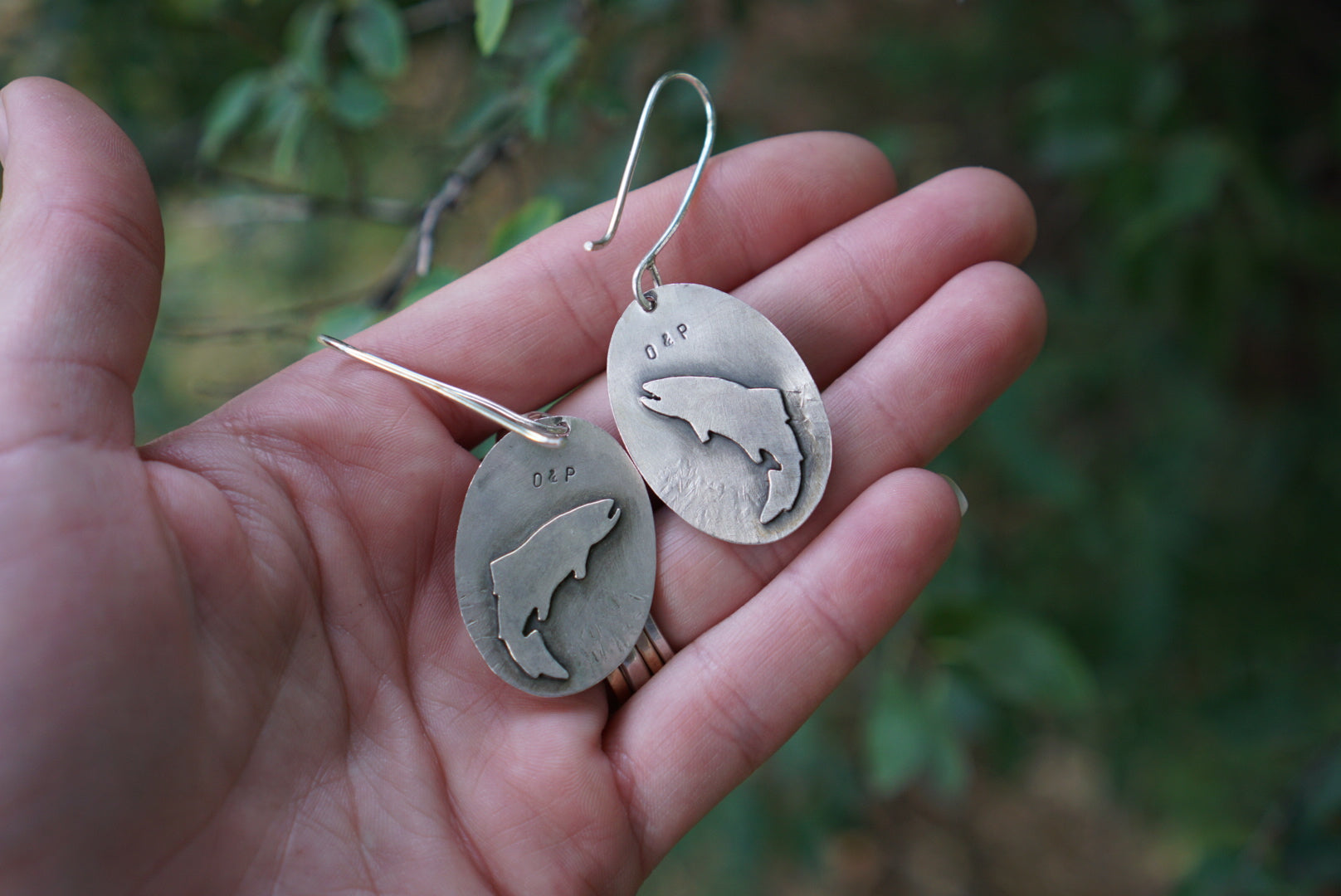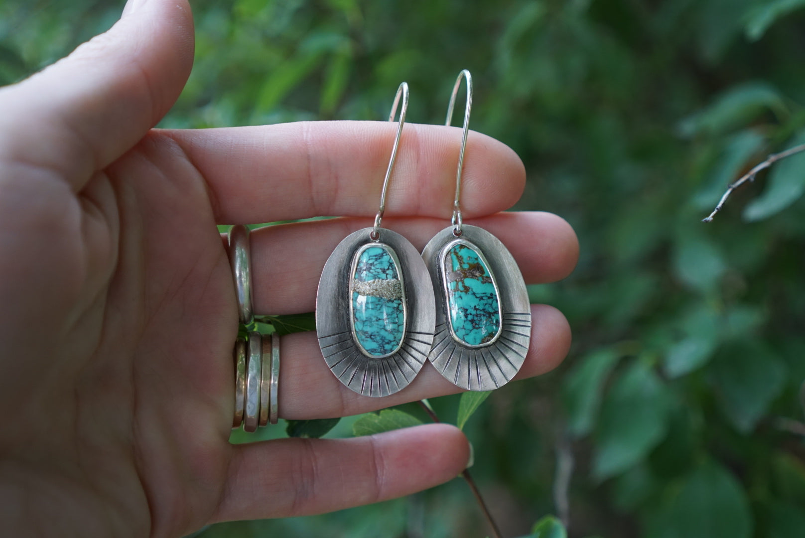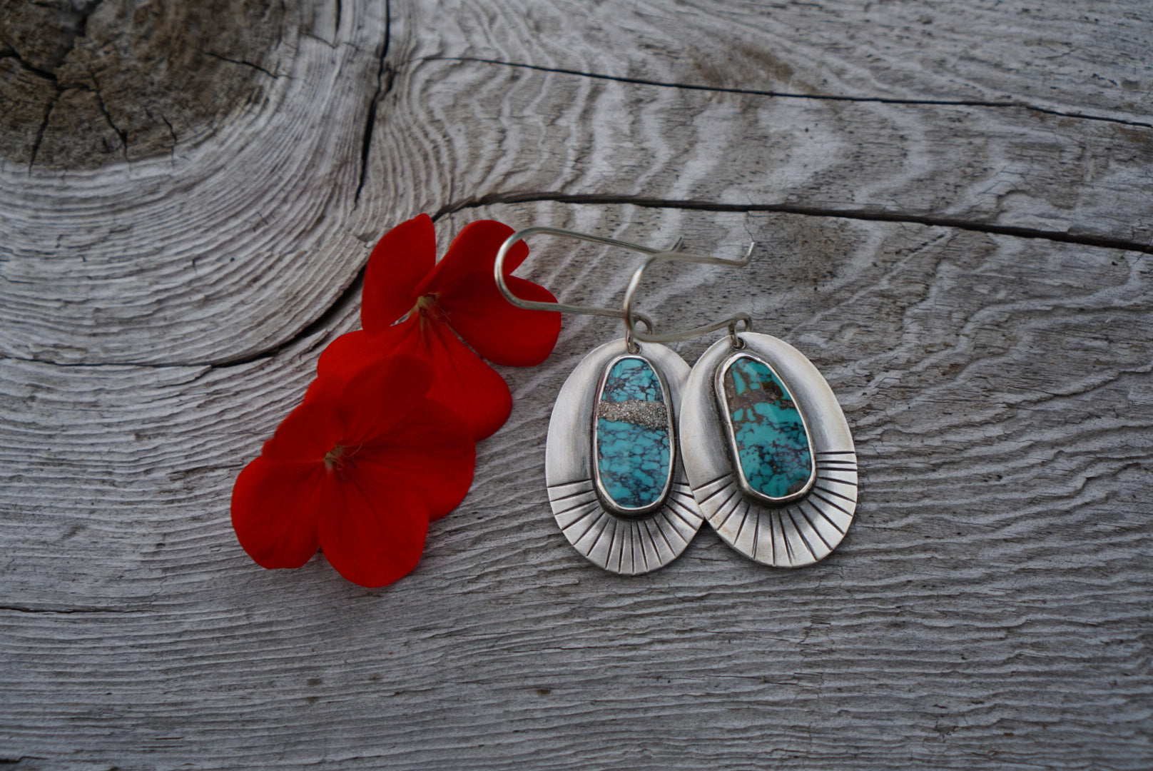These beautiful earrings are great for everyday. They feature two sister stones of Turquoise wrapped in silver and perched on silver discs with sunburst detail at the bottom. One stone was cracked so it was filled with silver dust and resin to add character and reminding the wearer to embrace flaws and imperfections because they make us even more beautiful. These earring also feature two rising trout layered on the back side. Finished with sterling silver handcrafted earwires and hang about 2.25 inches in length.