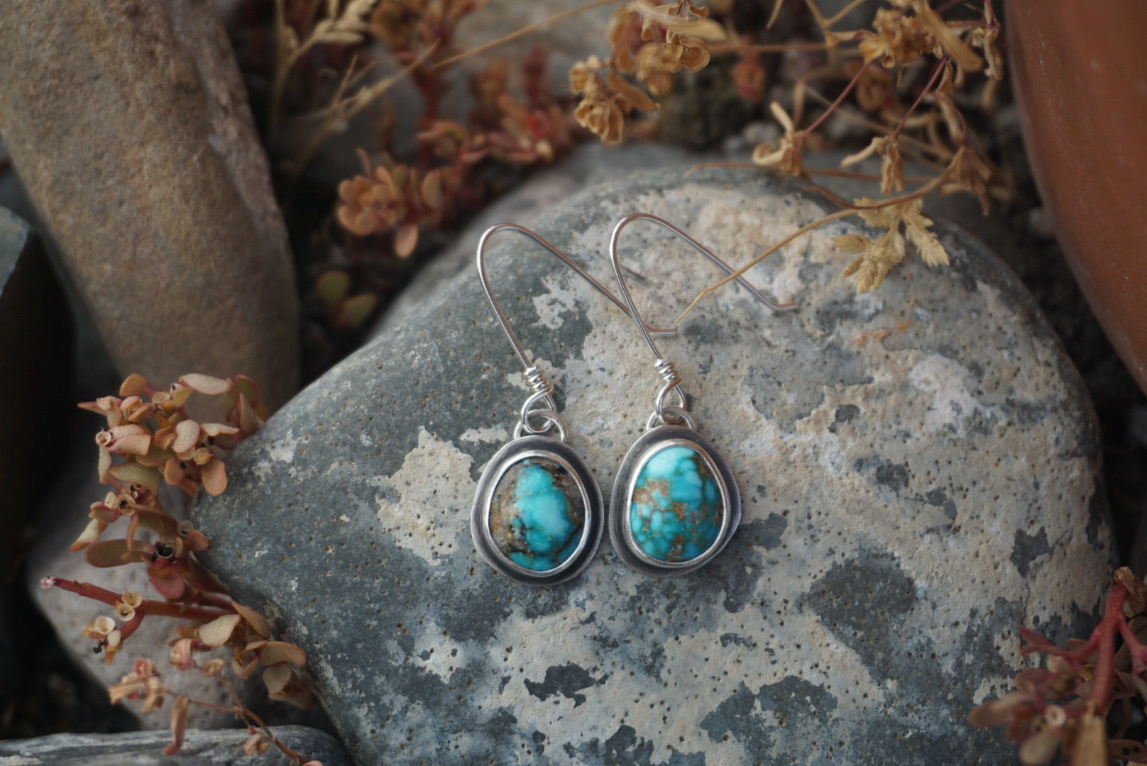 It’s the little things that matter. And, the gorgeous, vibrant, American Mined turqouise from Nevada turquoise of these little dangle earrings will definitely have you feeling that way. Beautiful pieces of Carlin turquoise are simply set in fine and sterling silver and dangle from hand crafted sterling silver earwires. Earrings measure just under 1.5 inches in length from the top of the earwires the tip of the stone. The absolute perfect earrings for everyday.