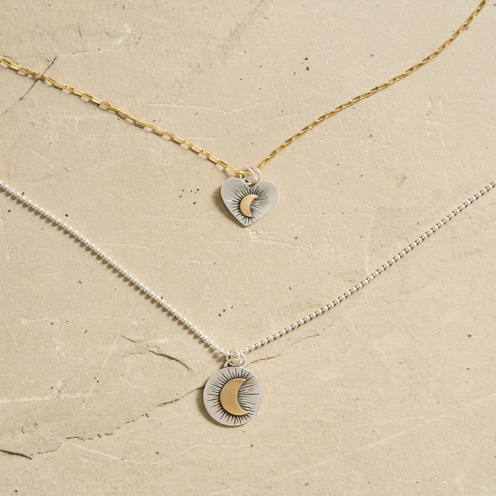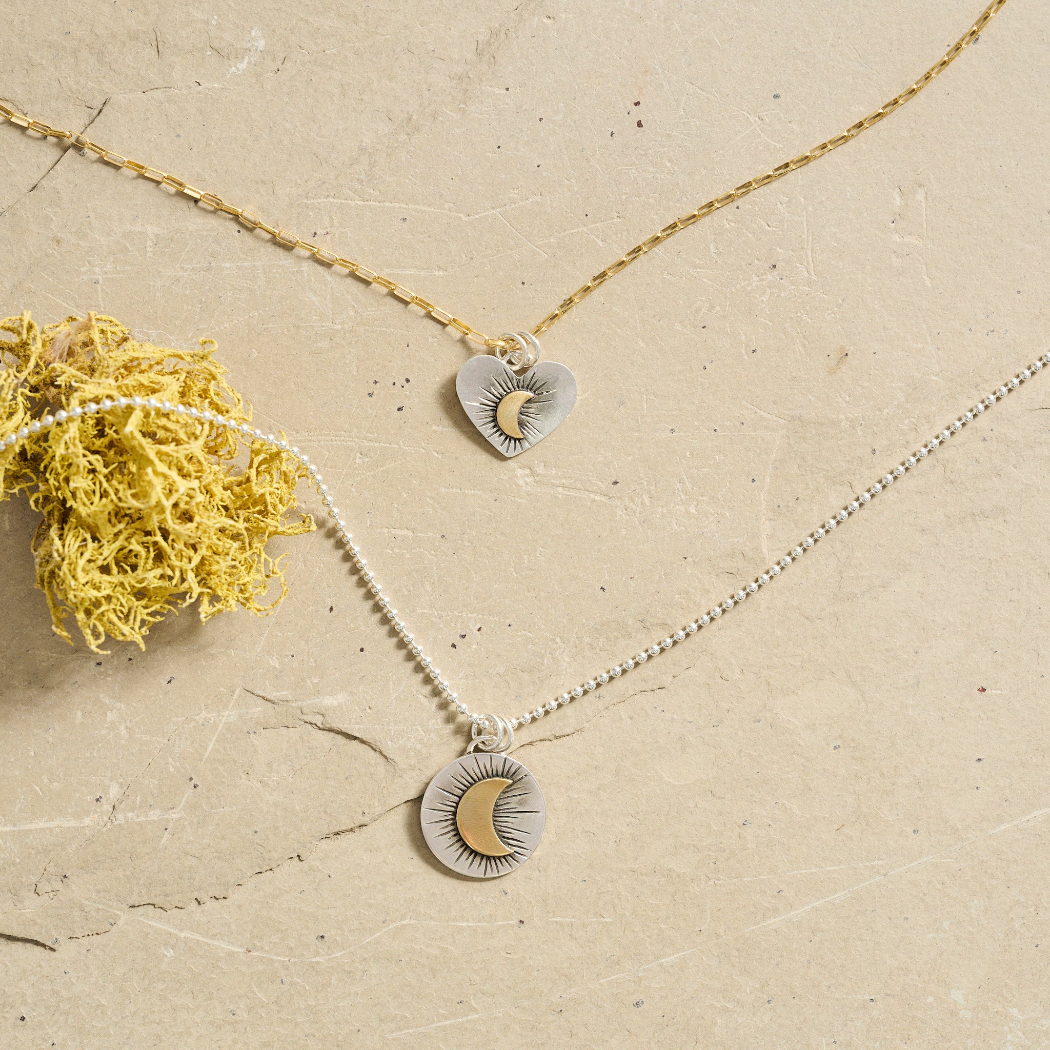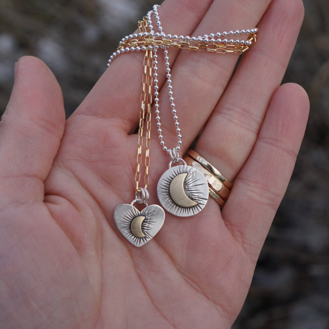 One of my classic necklace designs! These sweet little heart or round charms are hand sawed and feature a teeny tiny little brass crescent moon in the center with radiating hand stamped details. This is my little rendition of "I love you to the Moon" put into jewelry form. Choose your combo of Round Pendant, Heart Pendant, Silver Ball Chain or 14k Gold Fill Elongated Box Chain. Necklaces measure 18" long.