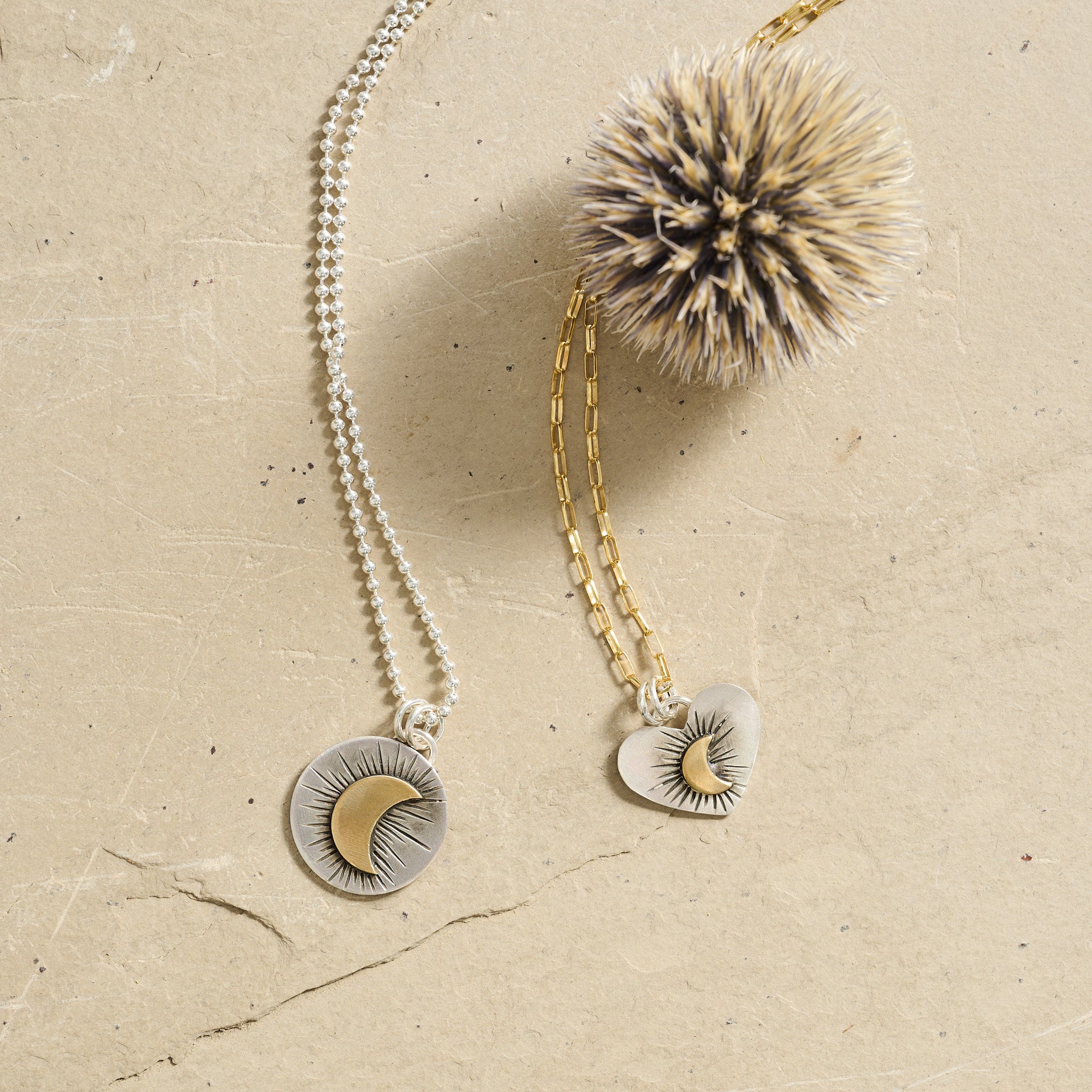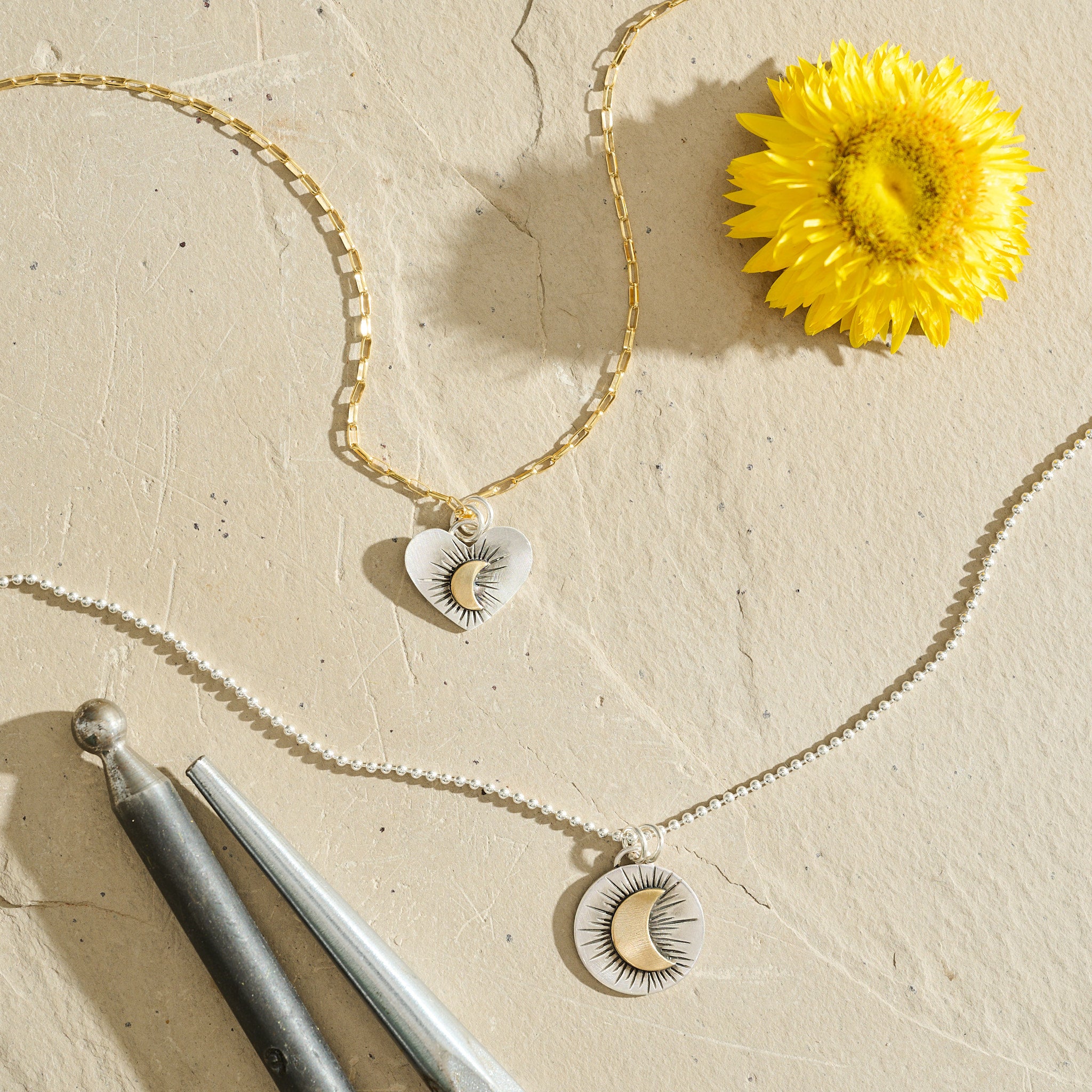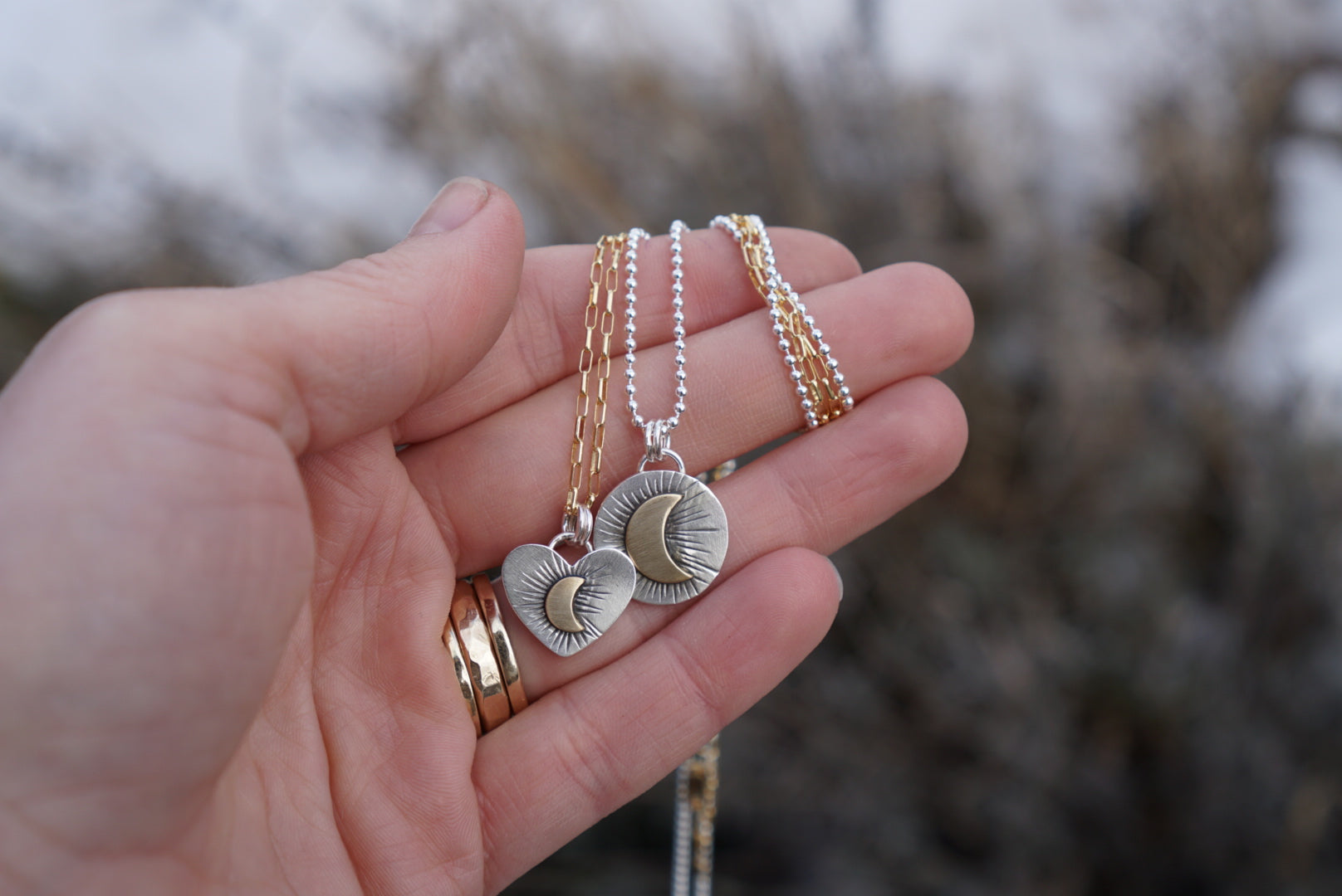 One of my classic necklace designs! These sweet little heart or round charms are hand sawed and feature a teeny tiny little brass crescent moon in the center with radiating hand stamped details. This is my little rendition of "I love you to the Moon" put into jewelry form. Choose your combo of Round Pendant, Heart Pendant, Silver Ball Chain or 14k Gold Fill Elongated Box Chain. Necklaces measure 18" long.