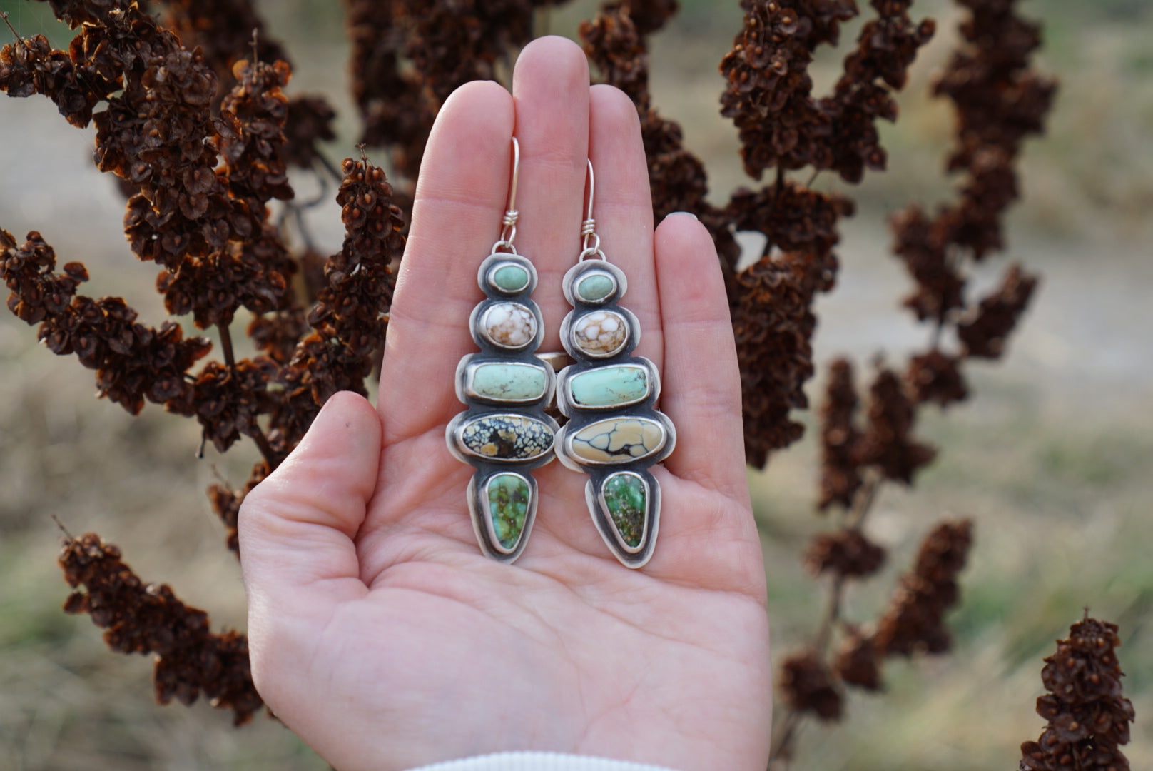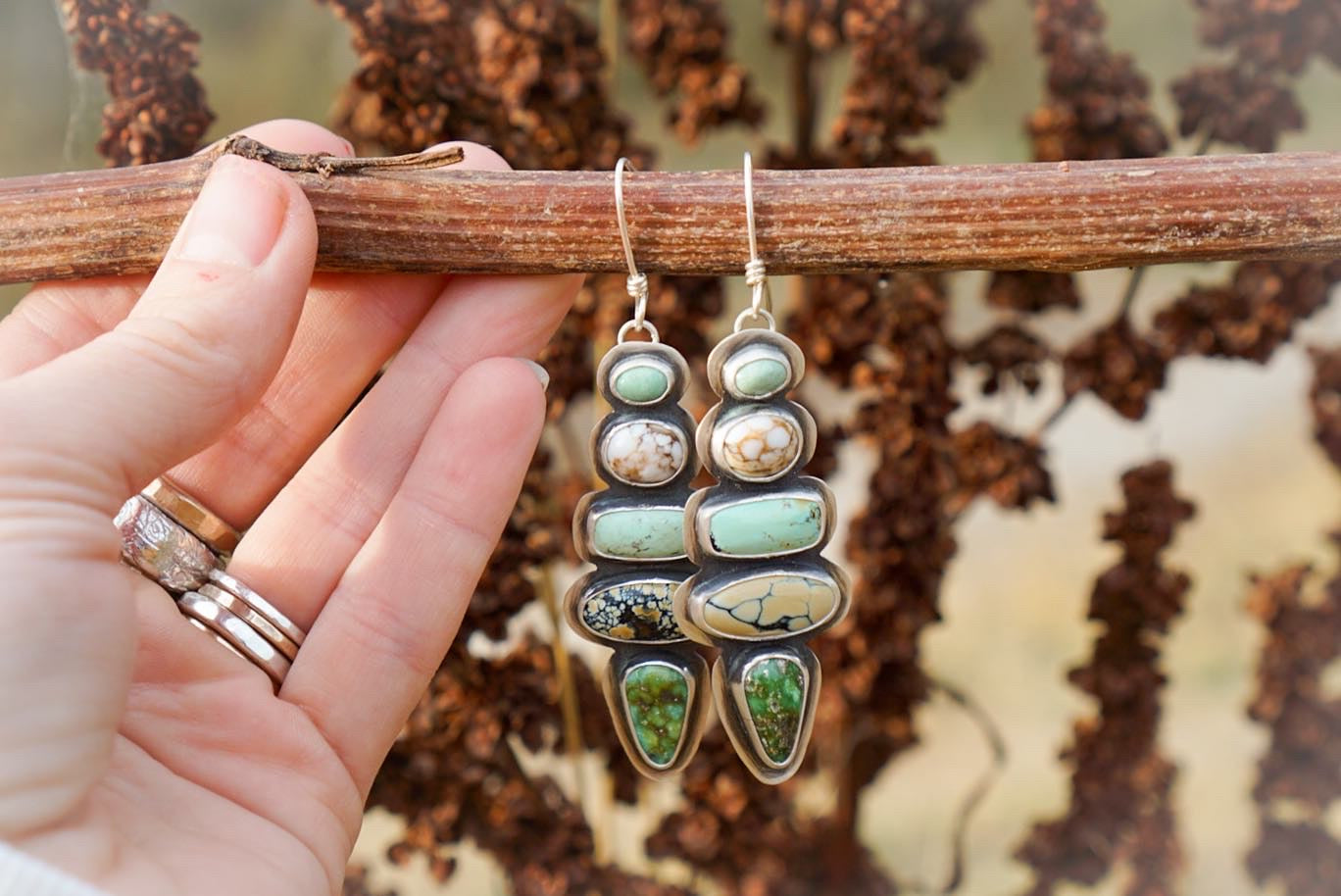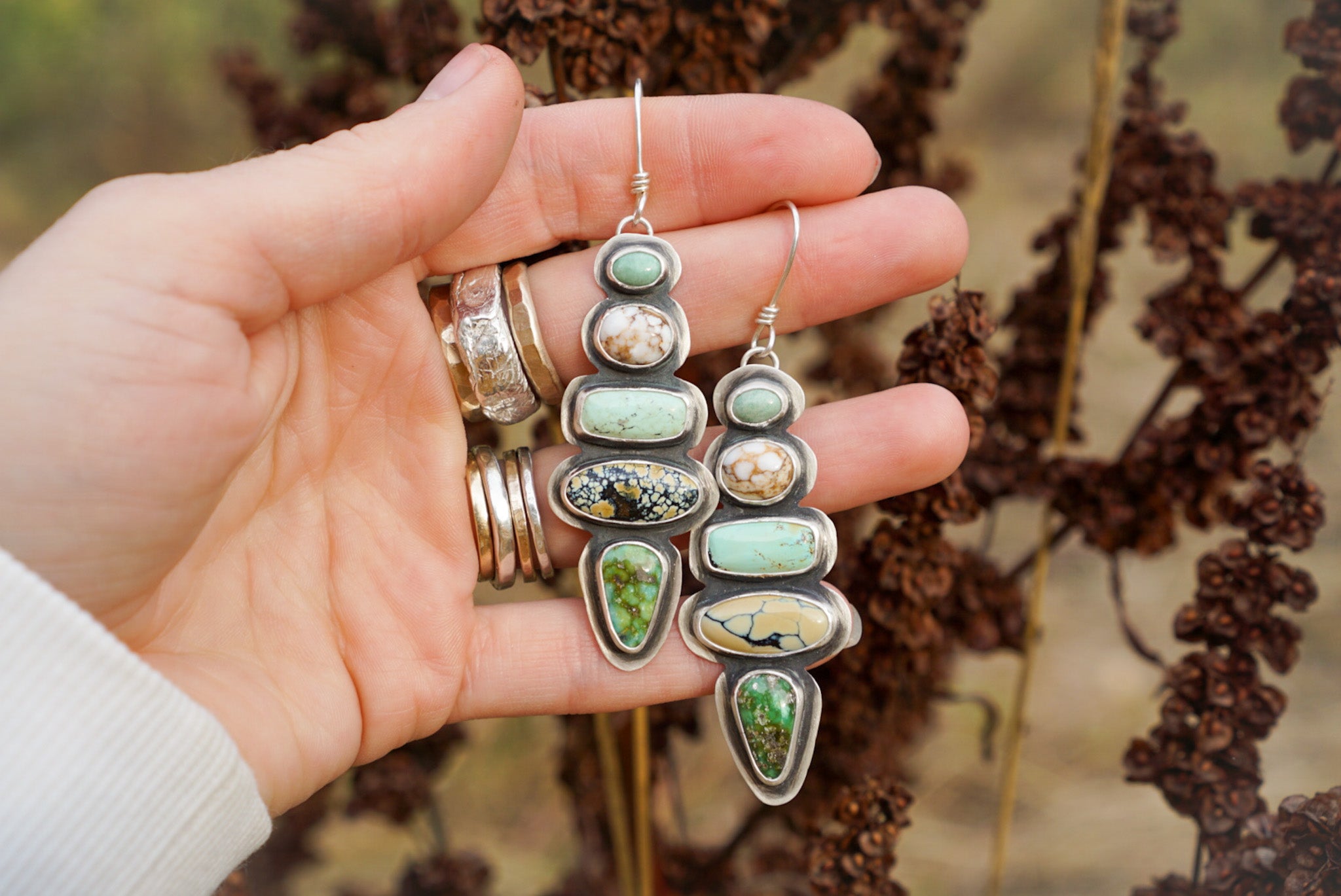Ten gorgeous turquoise stones are center stage in these amazing earrings. Ten stones!!!! Featuring green variscite, Wild Horse Magnesite, Hubei Turquoise, New Lander variscite, and Sonoran Gold Turquoise. Each earring stacks five different stones atop each other and is simply set to honor the beauty of the gemstones. Earrings are oxidized and polished to make the stones stand out and to give a soft glowing finish. Earrings measure about 3 inches long and hang from handmade sterling silver earwires.