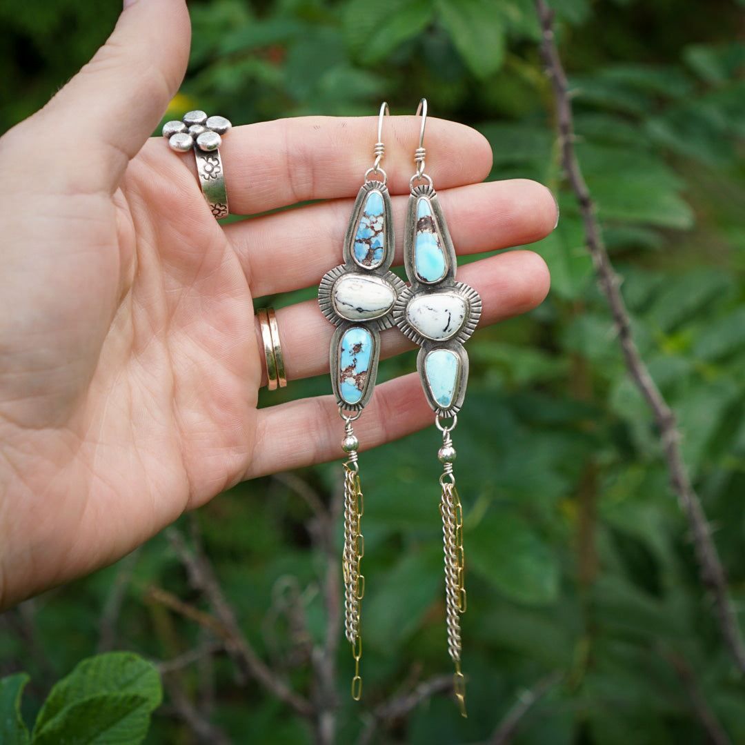 Lavender Turquoise and lovely White Buffalo turquoise stones are center stage in these amazing earrings. Each earring stacks three stones atop each other and is simply set to honor the beauty of the gemstones, with little hand stamped details and silver and 14k gold fill chain tassels dangling beneath. Earrings are oxidized and polished to make the stones stand out and to give a soft glowing finish. Earrings measure about 2.75 inches long with additional 2 inch tassels and hang from handmade sterling silver earwires.