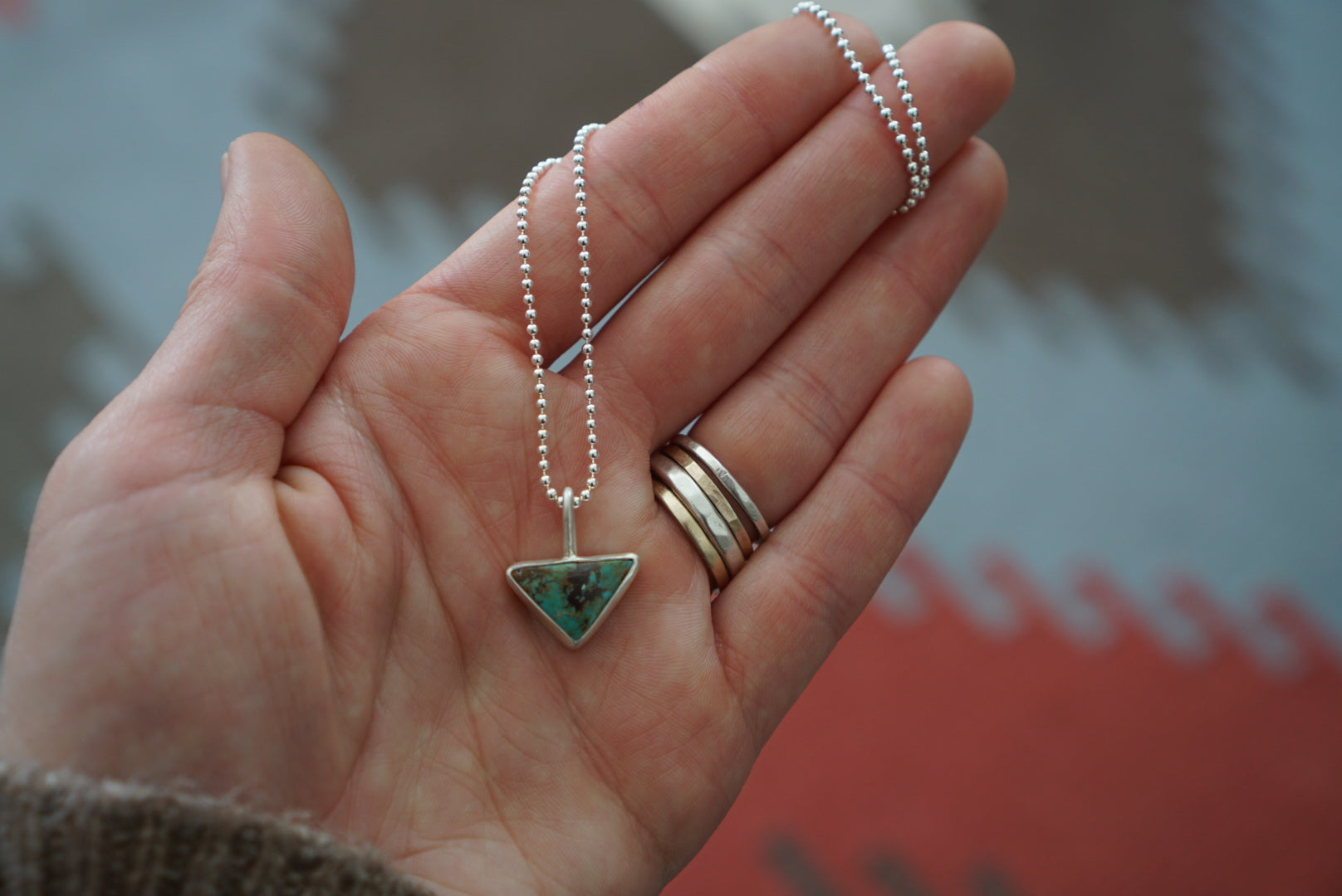 THE best little everyday necklace featuring and gorgeous Triangle shaped hunk of Green Turquoise wrapped in recycled sterling silver. This necklace is absolutely perfect for everyday wear. Stone is simply set in fine and sterling silver and hangs from a dainty but sturdy 16 inch sterling silver ball chain.